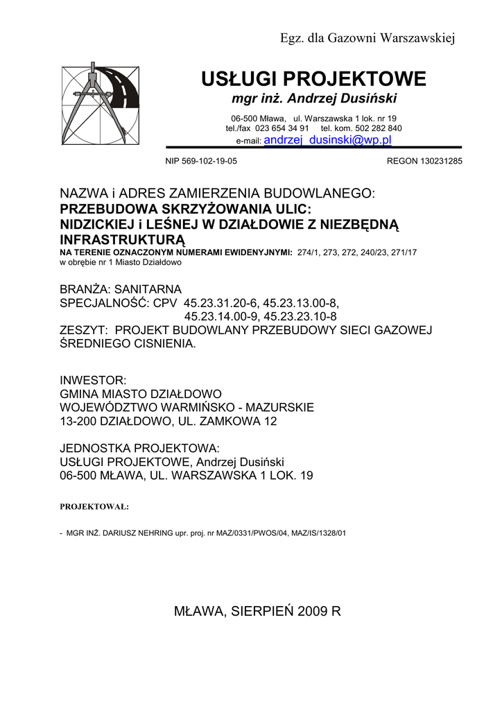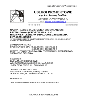 Egz. dla Gazowni Warszawskiej USŁUGI PROJEKTOWE mgr inŜ. Andrzej Dusiński 06-500 Mława, ul. Warszawska 1 lok. nr 19 tel./fax 023 654 34 91 tel. kom. 502 282 840 e-mail: [email protected] NIP 569-102-19-05 REGON 130231285 NAZWA i ADRES ZAMIERZENIA BUDOWLANEGO: PRZEBUDOWA SKRZYśOWANIA ULIC: NIDZICKIEJ i LEŚNEJ W DZIAŁDOWIE Z NIEZBĘDNĄ INFRASTRUKTURĄ NA TERENIE OZNACZONYM NUMERAMI EWIDENYJNYMI: 274/1, 273, 272, 240/23, 271/17 w obrębie nr 1 Miasto Działdowo BRANśA: SANITARNA SPECJALNOŚĆ: CPV 45.23.31.20-6, 45.23.13.00-8, 45.23.14.00-9, 45.23.23.10-8 ZESZYT: PROJEKT BUDOWLANY PRZEBUDOWY SIECI GAZOWEJ ŚREDNIEGO CISNIENIA. INWESTOR: GMINA MIASTO DZIAŁDOWO WOJEWÓDZTWO WARMIŃSKO - MAZURSKIE 13-200 DZIAŁDOWO, UL. ZAMKOWA 12 JEDNOSTKA PROJEKTOWA: USŁUGI PROJEKTOWE, Andrzej Dusiński 06-500 MŁAWA, UL. WARSZAWSKA 1 LOK. 19 PROJEKTOWAŁ: - MGR INś. DARIUSZ NEHRING upr. proj. nr MAZ/0331/PWOS/04, MAZ/IS/1328/01 MŁAWA, SIERPIEŃ 2009 R Zakres rzeczowy w skrzyżowaniu (rondo) ul. Nidzickiej, Leśnej w Działdowie a) Projektowane nowe trasy wg: - G1-G2-G3-G4-G5-G6-G7-sieć gazowa średniego ciśnienia z rury PE100 SDR 17,6 Ø 110/6,3m (suma L=50,96m) -G8-G9-sieć gazowa średniego ciśnienia z rury PE100 SDR 17,6 Ø90/5,2m (suma L=6,49m) -G10-G11-G12-G13-sieć gazowa średniego ciśnienia z rury PE100 SDR 17,6 Ø 160/9,1mm-(suma L=25,30m) Strona 1 SPIS TREŚCI: 1.0.DANE OGÓLNE:.................................................................................................................... 3 1.1.Podstawa opracowania:............................3 1.2.Przedmiot opracowania:...........................3 1.3.Zasilenie w gaz:........................................3 1.4.Istniejący stan zagospodarowania:...........3 2.0.PROJEKT WYKONAWCZY: .............................................................................................. 4 2.1.Budowa sieci średniego ciśnienia:...........4 2.2.UłoŜenie sieci:.........................................5 3.2.PRÓBY CIŚNIENIOWE:....................................................................................................... 6 4.1.OZNAKOWANIE SIECI:...................................................................................................... 6 5.1.SCHEMAT PRZEBUDOWY SIECI GAZOWEJ BEZ PRZERW W DOSTAWIE GAZU: ............................................................................................................................................ 6 5.1.1.CEL ZASTOSOWANIA: .................................................................................................... 6 5.1.2.PRACE TECHNOLOGICZNE:......................................................................................... 6 5.1.3.UWAGI KOŃCOWE DO TECHNOLOGII PRZEBUDOWY GAZOCIĄGU:............ 9 6.1.UWAGI KOŃCOWE: ............................................................................................................ 9 WYKAZ MATERIAŁU: ............................................................................................................ 10 OŚWIADCZENIE....................................................................................................................... 11 INFORMACJA............................................................................................................................ 12 DOTYCZĄCA BEZPIECZEŃSTWA....................................................................................... 12 I OCHRONY ZDROWIA .......................................................................................................... 12 Warunki techniczne przebudowy gazociągu-znak: CTM/ZGC181000/50/WT/2009 Uzgodnienie ZUD WYKAZ RYSUNKÓW: Rys. nr 1.1-Projekt zagospodarowania terenu- 1:500 (mapa sytuacyjno wysokościowa). Rys. nr 1.2-Technologia budowy sieci gazowej. Rys. nr 2.1-Profil sieci gazowej. Rys. nr 3.1-Schemat ułoŜenia przyłącza w gruncie. Rys. nr 4.1- Kolizja z kablami energetycznymi lub teletechnicznymi. Wykaz właścicieli działek. Uprawnienia budowlane. Zaświadczenia o przynaleŜności do Okręgowej Izby InŜynierów Budownictwa Strona 2 OPIS TECHNICZNY DO PRZEBUDOWY SIECI GAZOWEJ ŚREDNIEGO CIŚNIENIA 1.0.Dane ogólne: 1.1.Podstawa opracowania: -warunki techniczne dostawy gazu wydane przez MOSD Sp.z o.o. Ciechanów -mapa geodezyjna z uzgodnioną w ZUD trasą przyłącza gazowego -Sieci gazowe polietylenowe –2002 r -obowiązujące przepisy Prawa Budowlanego, zarządzenia i normy -wizja lokalna w terenie 1.2.Przedmiot opracowania: Przedmiotem opracowania jest projekt budowlano –wykonawczy przebudowy sieci gazowej średniego ciśnienia w obrębie projektowanego ronda u zbiegu ul. Nidzickiej, Leśnej w Działdowie. Szczegółowe usytuowanie sieci przebudowywanej uzgodnionej w ZUD przedstawiono na planie sytuacyjnym w skali 1:500. Odcinki sieci przebudowywanych znajdować się będą w działkach własności Gminy Miejskiej Działdowo lub Skarbu Państwa. 1.3.Zasilenie w gaz: Bazą dla przebudowywanej sieci średniego ciśnienia: G10-G11-G12-G13 będzie istniejący gazociąg średniego ciśnienia ∅ 150 z rur stalowych znajdujący się w ul. Nidzickiej. Dla trasyG1-G7 (niezaleŜnie od w/w) bazą jest sieć średniego ciśnienia z rury stalowej DN100 znajdujący się w ul. Nidzickiej i Leśnej. Dla trasyG8-G9 (niezaleŜnie od w/w) bazą jest sieć średniego ciśnienia z rury PE90 znajdujący się w ul. Leśnej. 1.4.Istniejący stan zagospodarowania: Sieć poddana przebudowie będzie przebiegać w terenie, w którym ocenie istnieje ulepszenie nawierzchni (jezdnia oraz chodnik). W terenie tym znajduje się liczne uzbrojenie podziemne w postaci sieci sanitarnych i elektrycznych, teletechnicznych. Na odcinkach G3-G4, G5-G6, G6-G7 projektowana sieć krzyŜuje się z istniejącymi przewodami energetycznym teletechnicznymi. Na przewodach energetycznym i teletechnicznym nałoŜyć rury osłonowe dwudzielne typu Arota; L=1,0m - patrz rys. nr 1.2 i 4.1. Na rysunku nr 1.1 pokazano uzbrojenie istniejące oraz projektowane. Podło