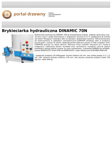 Brykieciarka hydrauliczna DINAMIC 70N Brykieciarka hydrauliczna DINAMIC 70N do brykietowania wiórów, zrębków (granulacja max. 10 mm), trocin i pyłów drewnianych o wilgotności min/max 8-17 %, podłączana do silosów lub baterii filtrujących wewnątrz albo na zewnątrz. Brykieciarka Dynamic 70N przeznaczona do wykorzystania w zakładach rzemieślniczych.COMAFER światowy lider w produkcji brycieciarek z ponad 35 letnim doświadczeniem.Obecnie ponad 15 000 urządzeń firmy COMAFER pracuje na całym świecie. Maszyny firmy Comafer tworzone są z myślą o osiągnięciu najwyższej jakości wyrobów przy zachowaniu rozsądnej ceny.W swoich produktach stosują jedynie uznane na rynku komponenty:- hydraulika PARKER lub VICKERSpompa MARZOCCHI- silniki ICME lub BONFIGLIOLI- części elektryczne KLÖCKNER MOELLER - wydajność produkcji 30÷60kg/godz- brykiet średnica 50 mm- moc silnika pompy 5,5 / 7,5 kW / KM- siłownik brykietu średnica 120 mm- siła nacisku siłownika brykietu około 700 Kg/cm2- ciężar 830 kg