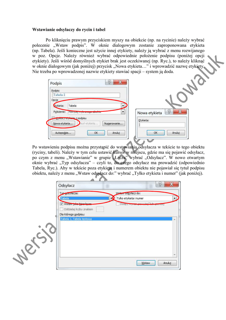 Wstawianie odsyłaczy do rycin i tabel Po kliknięciu prawym