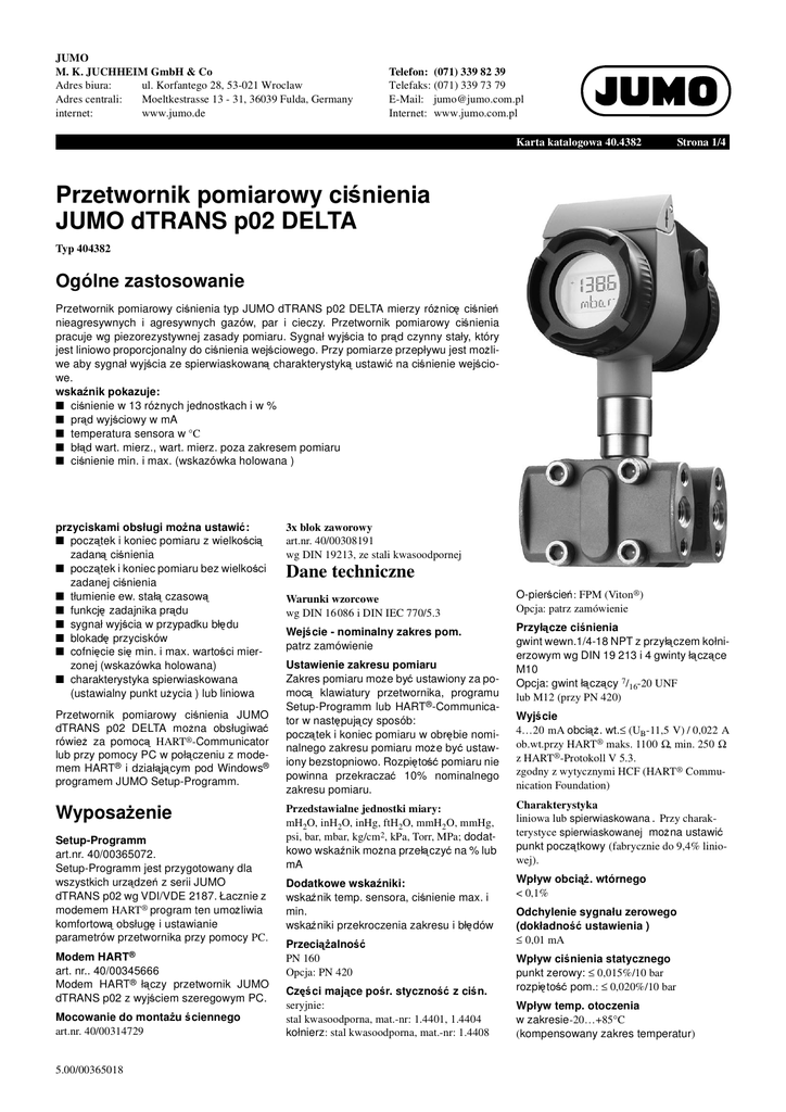 JUMO M. K. JUCHHEIM GmbH & Co Adres biura: ul. Korfantego 28, 53-021 Wroclaw Adres centrali: Moeltkestrasse 13 - 31, 36039 Fulda, Germany internet: www.jumo.de Telefon: (071) 339 82 39 Telefaks: (071) 339 73 79 E-Mail: [email protected] Internet: www.jumo.com.pl Karta katalogowa 40.4382 Strona 1/4 Przetwornik pomiarowy ci nienia JUMO dTRANS p02 DELTA Typ 404382 Ogólne zastosowanie Przetwornik pomiarowy ci nienia typ JUMO dTRANS p02 DELTA mierzy ró nic ci nie nieagresywnych i agresywnych gazów, par i cieczy. Przetwornik pomiarowy ci nienia pracuje wg piezorezystywnej zasady pomiaru. Sygnał wyj cia to pr d czynny stały, który jest liniowo proporcjonalny do ci nienia wej ciowego. Przy pomiarze przepływu jest mo liwe aby sygnał wyj cia ze spierwiaskowan charakterystyk ustawi na ci nienie wej ciowe. wska nik pokazuje: ci nienie w 13 ró nych jednostkach i w % pr d wyj ciowy w mA temperatura sensora w °C bł d wart. mierz., wart. mierz. poza zakresem pomiaru ci nienie min. i max. (wskazówka holowana ) przyciskami obsługi mo na ustawi : pocz tek i koniec pomiaru z wielko ci zadan ci nienia pocz tek i koniec pomiaru bez wielko ci zadanej ci nienia tłumienie ew. stał czasow funkcj zadajnika pr du sygnał wyj cia w przypadku bł du blokad przycisków cofni cie si min. i max. warto ci mierzonej (wskazówka holowana) charakterystyka spierwiaskowana (ustawialny punkt u ycia ) lub liniowa Przetwornik pomiarowy ci nienia JUMO dTRANS p02 DELTA mo na obsługiwa rówie za pomoc HART®-Communicator lub przy pomocy PC w poł czeniu z modemem HART® i dział j cym pod Windows® programem JUMO Setup-Programm. Wyposa enie Setup-Programm art.nr. 40/00365072. Setup-Programm jest przygotowany dla wszystkich urz dze z serii JUMO dTRANS p02 wg VDI/VDE 2187. Łacznie z modemem HART® program ten umo liwia komfortow obsług i ustawianie parametrów przetwornika przy pomocy PC. Modem HART® art. nr.. 40/00345666 Modem HART® ł czy przetwornik JUMO dTRANS p02 z wyj ciem szeregowym PC. Mocowanie do monta u ciennego art.nr. 40/00314729 5.00/00365018 3x blok zaworowy art.nr. 40/00308191 wg DIN 19213, ze stali kwasoodpornej Dane techniczne Warunki wzorcowe wg DIN 16086 i DIN IEC 770/5.3 O-pier cie : FPM (Viton®) Opcja: patrz zamówienie Wej cie - nominalny zakres pom. patrz zamówienie Przył cze ci nienia gwint wewn.1/4-18 NPT z przył czem kołnierzowym wg DIN 19 213 i 4 gwinty ł cz ce M10 Opcja: gwint ł cz cy 7/16-20 UNF lub M12 (przy PN 420) Ustawienie zakresu pomiaru Zakres pomiaru mo e by ustawiony za pomoc klawiatury przetwornika, programu Setup-Programm lub HART®-Communicator w nast puj cy sposób: pocz tek i koniec pomiaru w obr bie nominalnego zakresu pomiaru mo e by ustawiony bezstopniowo. Rozpi to pomiaru nie powinna przekracza 10% nominalnego zakresu pomiaru. Wyj cie 4…20 mA obci . wt.≤ (UB-11,5 V) / 0,022 A ob.wt.przy HART® maks. 1100 Ω, min. 250 Ω z HART®-Protokoll V 5.3. zgodny z wytycznymi HCF (HART® Communication Foundation) Przedstawialne jednostki miary: mH2O, inH2O, inHg, ftH2O, mmH2O, mmHg, psi, bar, mbar, kg/cm2, kPa, Torr, MPa; dodatkowo wska nik mo na przeł czy na % lub mA Charakterystyka liniowa lub spierwiaskowana. Przy charakterystyce spierwiaskowanej mo na ustawi punkt pocz tkowy (fabrycznie do 9,4% liniowej). Dodatkowe wska niki: wska nik temp. sensora, ci nienie max. i min. wska niki przekroczenia zakresu i bł dów Wpływ obci . wtórnego < 0,1% Przeci alno PN 160 Opcja: PN 420 Cz ci maj ce po r. styczno z ci n. seryjnie: stal kwasoodporna, mat.-nr: 1.4401, 1.4404 kołnierz: stal kwasoodporna, mat.-nr: 1.4408 Odchylenie sygnału zerowego (dokładno ustawienia ) ≤ 0,01 mA Wpływ ci nienia statycznego punkt zerowy: ≤ 0,015%/10 bar rozpi to pom.: ≤ 0,020%/10 bar Wpływ temp. otoczenia w zakresie-20…+85°C (kompensowany zakres temperatur) M. K. JUCHHEIM GmbH & Co • 36035 Fulda, Germany punkt zerowy: ≤ 0,005%/K typowy, ≤ 0,01%/K max. rozpi to pom.:≤ 0,005%/K typowy, ≤ 0,01%/K max. Odchylenie charakterystyki przy nastawieniu punktu granicznego: ≤ 0,1% v. warto ci ko cowej nominalnego zakresu pomiarowego; wg DIN 16086 Histereza ≤ 0,02% v. EW; wgDIN 16086 Powtarzalno ≤ 0,02% v. EW; wgDIN 16086 Czas uspokojenia ca. 150 ms, bez tłumienia NAMUR Przetwornik pomiarowy ci nienia spełnia wszystkie wymogi EN 50 081, EN 50082, EN 55 011, EN 55 022(znak CE) i mo e by stosowany w przemy le. Emisja zakłóce! EN 55 011, klasa B, odległ. pom. 10m zakres cz stotliwo ci30… 230 MHz dBµ V/m; 230… 1000MHz dBµV/m pseudowarto szczytowa Szok mechaniczny 50g/11ms Mechaniczne wahania max. 5g przy 10-2000 Hz Tłumienie ustawialne od 0...100 s Rodzaj ochrony z przewodem ł cz cym IP 65 wg EN 60 529 Stabilno roczna ≤ 0,1% v. EW ( nominalny zakres pom. przy warunkach wzorcowych wg DIN IEC 770) Rezystancja izolacji 100 MΩ; DC 50 V Zasilanie DC 11,5… 36 V Wskazówka: przynajmniej DC 17 V (250 Ω) przy komunikacji przez HART-Protokoll. Wpływ napi cia ≤ 0,1% od wart. ko cowej na 10 V zmiany (napi cie nominalne DC 24 V) Dop. temperatura otoczenia -40… +85°C; wg DIN 16086 (przy temp. poni ej -20°C istniej mo liwo nieodczytania wska nika LCD) Temperatura przechowywania -40… +85°C Dop.temperatura medium -40… +100°C (przy chlorowcowanym -40...+85°C) Zgodno elektromagnetyczna wyładowanie elektrostatyczne: IEC 1000-4-2 / EN 61000-4-2 ±4 kV zestyk i ±8kV wył dowanie powietrza ±6 kV wyladowanie zestyku wg NAMUR pola elektromagnetyczne: IEC 1000-4-3 / EN 61000-4-3 zakres cz stotliwo ci:80… 1.000 MHz, nat . pola kontrol.:10V/m, 80% AM (1 KHz) ENV 50204 900MHz ±5 MHz, 10V/m, 50% PM (200Hz) przej ciowe wielko ci zakłócaj ce (Burst): IEC 1000-4-4 / EN 61000-4-4 ± 2 kV, 1min .przez pojemno . odc. ł cz cy odporno na zakłócenia przez napi cia udarowe: IEC 1000-4-5 / EN 61000-4-5 ±1 kV symetrycznie i ±2 kV niesymetrycznie odporno na zakłócenia indukowane przez pola wielkiej cz stotliwo i: IEC 1000-4-6 / ENV 50141 zakres cz stotliwo ci 0,15… 80 MHz, 