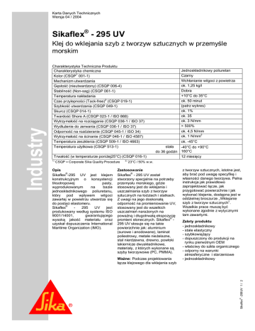 Karta Danych Technicznych Wersja 04 / 2004 Sikaflex® - 295 UV Klej do wklejania szyb z tworzyw sztucznych w przemyśle morskim Charakterystyka Techniczna Produktu Charakterystyka chemiczna Kolor (CSQP1 001-1) Mechanizm utwardzania Gęstość (nieutwardzony) (CSQP 006-4) Stabilność (Non-sag) (CSQP 061-1) Temperatura nakładania Czas przylepności (Tack-free)2 (CSQP 019-1) Szybkość utwardzania (CSQP 049-1) Skurcz (CSQP 014-1) Twardość Shore A (CSQP 023-1 / ISO 868) Wytrzymałość na rozciąganie (CSQP 036-1 / ISO 37) Wydłużenie do zerwania (CSQP 036-1 / ISO 37) Odporność na rozdzieranie (CSQP 045-1 / ISO 34) Wytrzymałość na ścinanie (CSQP 046-1 / ISO 4587) Temperatura zeszklenia (CSQP 509-1 / ISO 4663) Temperatura użytkowa (CSQP 513-1) Trwałość (w temperaturze poniżej25°C) (CSQP 016-1) CSQP = Corporate Sika Quality Procedure Opis ® Sikaflex -295 UV jest klejem konstrukcyjnym o konsystencji tiksotropowej pasty, wyprodukowanym na bazie jednoskładnikowego poliuretanu, który pod wpływem wilgoci zawartej w powietrzu utwardza się do postaci elastomeru. ® 295 UV jest Sikaflex produkowany według systemu ISO 9001/14001, gwarantującego wysoką jakość materiału oraz uzyskał dopuszczenia International Maritime Organization (IMO). 2) ok. -45°C stała -40°C do +90°C do 36 godzin 160°C 12 miesięcy 23°C / 50% w.w. Zastosowanie ® Sikaflex - 295 UV został stworzony specjalnie na potrzeby przemysłu morskiego, gdzie stosowany jest do wklejania i uszczelniania szyb z tworzyw sztucznych na łodziach i statkach. Z uwagi na jego doskonałą odporność na promieniowanie UV, stosowany jest do wszelkich uszczelnień narażonych na poważną i długotrwałą ekspozycję ® promieni słonecznych. Sikaflex 295 UV stosuje się na takie powierzchnie jak: aluminium (surowe i anodowane), laminat poliestrowy, metale nieżelazne, stal nierdzewna, drewno, powłoki lakiernicze dwuskładnikowe, materiały, z których wykonane są szyby tworzywowe (PC, PMMA). Ważne: Podczas projektowania łącza klejowego dla wklejenia szyb z tworzyw sztucznych, istotne jest, aby brać pod uwagę specyfikę i własności danego tworzywa. Pełna instrukcja jak prawidłowo zaprojektować łącze, jak przygotować powierzchnie i jak wykonać klejenie, dostępna jest w oddzielnej broszurze „Wklejanie szyb z tworzyw sztucznych”. Wszelkie prace muszą być wykonane zgodnie z wytycznymi tam zawartymi. Zalety produktu - jednoskładnikowy - stale elastyczny - szybkowiążący - dopuszczony do produkcji na rynku pierwotnym OEM - właściwy do szkła organicznego - odporny na warunki atmosferyczne i starzeniowe - jednoskładnikowy Sikaflex® -295UV 1 / 2 1) Jednoskładnikowy poliuretan Czarny Wchłanianie wilgoci z powietrza ok. 1,25 kg/l Dobra +10°C do 35°C ok. 50 minut (patrz wykres) ok. 1% ok. 35 ok. 3 N/mm > 500% ok. 4,5 N/mm 2 ok. 1 N/mm Mechanizm Utwardzania Sikaflex®-295 UV utwardza się poprzez reakcję z wilgocią zawartą w powietrzu. W niskich temperaturach zawartość wody w powietrzu jest z zasady niższa, wobec czego proces utwardzania przebiega wolniej. Patrz wykres: 23°C (73°F) / 50% w .w . 8 2h 0 2 4 6 Czas (dni) 8 10 Dodatkowe Informacje Na życzenie dostępne są następujące publikacje: - Przewodnik Przygotowania Powierzchni dla Przemysłu Morskiego - Karta Charakterystyki Substancji Niebezpiecznej - Sika na Statkach i Promach Opakowania Tubki 10°C (40°F) / 50% w .w . 4 0 Sikalfexu. Polakierowana powierzchnia może być narażona na pęknięcia, spowodowane niższą elastycznością farby niż uszczelniacza h 12 Szybkość utwardzania Sikaflex 295 UV b b Zalecany kształt ścieżki klejowej Odporność Chemiczna Sikaflex® - 295 UV jest odporny na wodę słodką i morską, warunki atmosferyczne, ścieki przemysłowe i komunalne, detergenty, środki myjące i czyszczące jak również rozcieńczone kwasy i zasady. Przez krótki czas wykazuje odporność chemiczną na paliwa i oleje mineralne, tłuszcze roślinne i zwierzęce. Nie jest odporny na kwasy organiczne i alkohole, stężone zasady i kwasy mineralne oraz rozpuszczalniki. Powyższe informacje są wytycznymi ogólnymi, szczegółowe zalecenia dostępne na życzenie. Sposób Nakładania Przygotowanie powierzchni Powierzchnie uszczelnianych elementów konstrukcyjnych musza być czyste, suche oraz wolne od kurzu i tłuszczu. Szczegółowe zasady dotyczące przygotowania powierzchni znajdują się w Przewodniku Przygotowania Powierzchni lub w Dziale Technicznym Sika Industry Nakładanie ® Sikaflex - 295 UV nakładać przy użyciu ręcznego lub pneumatycznego pistoletu do wyciskania. Końcówkę dyszy podającej masę przyciąć stosownie do żądanej grubości warstwy uszczelniacza. Podczas Wygładzanie Do wygładzania spoiny (fugi) zaleca się stosowanie preparatu o nazwie Sika® Abglattmittel (Sika® Tooling Agent). Wygładzanie spoiny (fugi) należy przeprowadzić przed powierzchniowym związaniem Sikaflexu. Czyszczenie Po zakończonym procesie uszczelniania używane narzędzia mogą zostać oczyszczone z resztek nieutwardzonej masy przy pomocy środka Sika® Remover208. Utwardzony Sikaflex usuwa się w sposób mechaniczny (szlifowanie, wycinanie). W przypadku bezpośredniego kontaktu Sikaflex® -295 UV ze skórą, należy usunąć go z powierzchni skóry i przemyć wodą z użyciem mydła, środka czyszczącego do rąk lub Sika® Handclean. Nie należy używać do tego celu żadnego z rozpuszczalników. Malowanie Sikaflex® - 295 UV może być malowany w stanie niezwiązanym (podczas czasu przylepności). W tym przypadku niezbędne jest przeprowadzenie testów zgodności. Malowanie proszkowe lub lakierami piecowymi może być przeprowadzone tylko po całkowitym utwardzeniu się 310 ml, 400 ml Ważne Informacje i zalecenia dotyczące bezpiecznego przetwarzania, składowania i usuwania środków chemicznych, zawarte są w aktualnej Karcie Charakterystyki Substancji Niebezpiecznej. Karcie zawierającej własności fizyczne, ek
