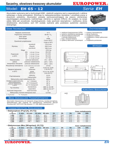 EUROPOWER Szczelny, o³owiowo-kwasowy akumulator Model: EH 65 - 12 R Seria EH Akumulator wykonany jest w technologii AGM - elektrolit uwiêziony jest w separatorach z w³ókna szklanego o du¿ej porowatoœci. Eliminuje to niebezpieczeñstwo wycieków i umo¿liwia pracê w dowolnym po³o¿eniu. Akumulator posiada samouszczelniaj¹ce siê zawory ciœnieniowe zapobiegaj¹ce powstawaniu nadmiernego ciœnienia w ogniwie (VRLA). Ze wzglêdu na swoje zalety takie jak szczelnoœæ, bezobs³ugowoœæ, ma³a opornoœæ wewnêtrzna i wyd³u¿ony okres sk³adowania, akumulatory serii EH zosta³y wybrane jako podstawa systemów zasilania awaryjnego. DANE TECHNICZNE ZASTOSOWANIA Napiêcie znamionowe Pojemnoœæ znamionowa Iloœæ ogniw Technologia 12 V 65 Ah / C20 6 AGM o 5 lat w 20 C* o 4 lata w 25 C 174,0 mm 350,0 mm 166,0 mm ~20,0 kg 65,0 Ah 61,8 Ah 55,3 Ah 41,7 Ah o o 0 C ~ 40 C o o -20 C ~ 50 C o o -20 C ~ 40 C £8 mW 13,5V do 13,8V o (-18 mV/ C) ¯ywotnoœæ projektowana wysokoœæ d³ugoœæ szerokoœæ Waga Pojemnoœæ o w 25 C Dopuszczalny zakres temperatury otoczenia Rezystancja wewnêtrzna 20h 3,25A @1,75V/ogn. 10h 6,18A @1,75V/ogn. 5h 11,05A @1,75V/ogn. 1h 41,70A @1,60V/ogn. podczas ³adowania podczas roz³adowania podczas sk³adowania w pe³ni na³adowany akumulator praca buforowa praca cykliczna Napiêcie ³adowania o w 20 C WYMIARY 350 ± 2 166 ± 2 12 ± 1 265 ± 1 14,4 V do 15,0V o (-24 mV/ C) zalecany maksymalny Maksymalny pr¹d roz³adowania (5s) Dostêpna pojemnoœæ przy po 1 miesi¹cu samoroz³adowaniu po 6 miesi¹cach podczas sk³adowania o po 12 miesi¹cach w 20 C standardowa Typ obudowy opcjonalna Koñcówki biegunowe insert terminal Maksymalny moment dokrêcania œrub 6,5 A 19,5 A 650 A 97 % 80 % 63 % ABS UL 94-HB ABS UL 94-V0** I2 5,5 Nm Pr¹d ³adowania 320 ± 2 336 ± 2 KOÑCÓWKI BIEGUNOWE I2 **) - Trudnopalna M6 2 *) - Wg Eurobat systemy fotowoltaiczne sprzêt medyczny urz¹dzenia mobilne urz¹dzenia o du¿ej cyklicznoœci pracy ! urz¹dzenia pomiarowe ! ! ! ! 174 ± 2 Wymiary ! zasilacze bezprzerwowe (UPS) ! systemy oœwietlenia awaryjnego ! si³ownie telekomunikacyjne i centrale telefoniczne ! kasy i drukarki fiskalne ! systemy alarmowe i przeciwpo¿. BRAK OGRANICZEÑ TRANSPORTOWYCH Akumulator dopuszczony do transportu drog¹ lotnicz¹, morsk¹ lub l¹dow¹. Sklasyfikowany jako materia³ nie niebezpieczny (IATA/ICAO Special Provision A67, DOT-CFR Title 49 parts 171-189, IMDG amendment 27) CHARAKTERYSTYKI ROZ£ADOWAÑ o • Sta³opr¹dowe (Pr¹d [A], 25 [ C]) Uk V/ogniwo 1,80 1,75 1,70 1,65 1,60 5 min 148,7 170,1 186,2 198,2 208,7 10 min 120,1 130,2 134,8 140,6 146,1 15 min 97,2 101,6 104,8 107,2 109,3 30 min 63,1 65,5 67,0 67,9 68,6 1h 38,9 40,1 40,9 41,3 41,7 3h 15,8 16,1 16,3 16,4 16,5 5h 10,9 11,1 11,1 11,2 11,2 Czas roz³adowania 10h 20h 6,1 3,2 6,2 3,3 6,2 3,3 6,2 3,3 6,2 3,3 1h 77,3 79,6 81,0 82,0 82,8 3h 31,6 32,2 32,5 32,7 32,9 5h 21,8 22,1 22,2 22,3 22,4 Czas roz³adowania 10h 20h 12,2 6,4 12,4 6,5 12,4 6,5 12,5 6,6 12,5 6,6 o • Sta³omocowe (Moc [W/ogniwo], 25 [ C]) Uk V/ogniwo 1,80 1,75 1,70 1,65 1,60 5 min 272,3 306,0 334,8 349,9 361,5 10 min 222,0 240,4 248,7 254,7 260,2 15 min 181,3 189,5 195,3 199,9 203,8 30 min 122,8 127,5 130,4 132,3 133,6 Uk - Napiêcie koñcowe roz³adowania EUROPOWER R EH EH 65 - 12 ¯ywotnoœæ akumulatora przy pracy buforowej ¯ywotnoœæ akumulatora przy pracy cyklicznej 10 Temperatura: o 20[ C] Napiêcie ³adowania 2.275 V/ogniwo 6 5 120 100 4 3 Pojemnoœæ [%] Projektowana ¿ywotnoœæ [lata] 8 2 80 60 40 1 g³êbokoœæ roz³adowania 30[%] g³êbokoœæ g³êbokoœæ g³êbokoœæ roz³adowania roz³adowania roz³adowania 50[%] 100[%] 80[%] 20 0.5 20 30 40 0 50 0 200 400 600 o Temperatura pracy [ C] 800 1000 1200 Liczba cykli Charakterystyki roz³adowania akumulatora Charakterystyki samoroz³adowania akumulatora 100 13.0 Temperatura: 25[oC] Zachowana pojemnoœæ [%] 12.0 Napiêcie [V] 11.0 11.05[A] 6.175[A] 3.25[A] 16.25[A] 10.0 39[A] 9.0 8.0 162,5[A] 130[A] 7.0 1 2 3 5 10 o 5[ C] 60 40[oC] 30[oC] 20[oC] 40 65[A] 20 30 80 60 2 3 [min] 5 10 20 30 0 2 4 6 8 10 12 14 16 18 20 Okres sk³adowania [miesi¹ce] [h] Czas roz³adowania 0.15 0.12 0.09 0.06 Napiêcie ³adowania 13.0 Poziom na ³adowania 12.0 15.0 120 0.18 14.0 100 80 Roz³adowanie 100% (0.05C[A] x 20[h]) 50% (0.05C[A] x 10[h]) £adowanie sta³onapiêciowe: 2.275[V/ogniwo] sta³opr¹dowe: 0.1C[A] Temperatura: 20[oC] 11.0 10.0 0.03 60 40 20 Napiêcie ³adowania 120 Poziom na³ad 0.15 0.12 0.09 0.06 0 0 5 10 15 20 Czas ³adowania [h] 25 owania 13.0 100 12.0 80 Roz³adowanie 100% (0.05C[A] x 20[h]) 50% (0.05C[A] x 10[h]) £adowanie sta³onapiêciowe: 2.45[V/ogniwo] sta³opr¹dowe: 0.1C[A] o Temperatura: 20[ C] 11.0 10.0 60 40 0.03 20 Pr¹d ³adowania Pr¹d ³adowania 0 140 Poziom na³adowania akumulatora [%] 14.0 0.21 Napiêcie ³adowania [V] 0.18 140 Pr¹d ³adowania [CxA] 15.0 Charakterystyki ³adowania przy pracy cyklicznej Poziom na³adowania akumulatora [%] 0.21 Napiêcie ³adowania [V] Pr¹d ³adowania [CxA] Charakterystyki ³adowania przy pracy buforowej 0 0 0 0 5 10 15 20 Czas ³adowania [h] 25 0 Dopuszczalne koñcowe napiêcia roz³adowania akumulatora Pr¹d roz³adowania [A] 13 > I 13 £ I < 32.5 32.5 £ I < 65 Koñcowe napiêcie roz³adowania [V/ogniwo] 1.75 1.70 1.55 65 £ I 1.30 Pb *) C - pojemnoœæ akumulatora data wydania: 05.10.2011; numer zmiany: 2; data zmiany: 13.03.2012 EUROPOWER R EH