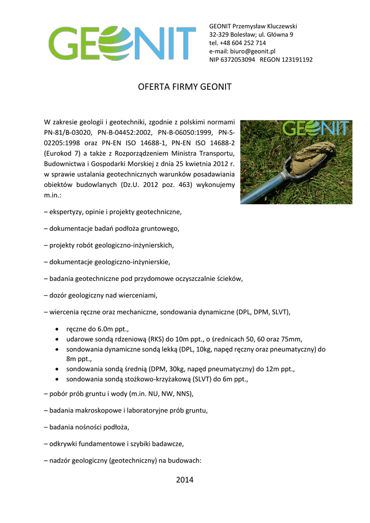 GEONIT Przemysław Kluczewski 32-329 Bolesław; ul. Główna 9 tel. +48 604 252 714 e-mail: [email protected] NIP 6372053094 REGON 123191192 OFERTA FIRMY GEONIT W zakresie geologii i geotechniki, zgodnie z polskimi normami PN-81/B-03020, PN-B-04452:2002, PN-B-06050:1999, PN-S02205:1998 oraz PN-EN ISO 14688-1, PN-EN ISO 14688-2 (Eurokod 7) a także z Rozporządzeniem Ministra Transportu, Budownictwa i Gospodarki Morskiej z dnia 25 kwietnia 2012 r. w sprawie ustalania geotechnicznych warunków posadawiania obiektów budowlanych (Dz.U. 2012 poz. 463) wykonujemy m.in.: – ekspertyzy, opinie i projekty geotechniczne, – dokumentacje badań podłoża gruntowego, – projekty robót geologiczno-inżynierskich, – dokumentacje geologiczno-inżynierskie, – badania geotechniczne pod przydomowe oczyszczalnie ścieków, – dozór geologiczny nad wierceniami, – wiercenia ręczne oraz mechaniczne, sondowania dynamiczne (DPL, DPM, SLVT), ręczne do 6.0m ppt., udarowe sondą rdzeniową (RKS) do 10m ppt., o średnicach 50, 60 oraz 75mm, sondowania dynamiczne sondą lekką (DPL, 10kg, napęd ręczny oraz pneumatyczny) do 8m ppt., sondowania sondą średnią (DPM, 30kg, napęd pneumatyczny) do 12m ppt., sondowania sondą stożkowo-krzyżakową (SLVT) do 6m ppt., – pobór prób gruntu i wody (m.in. NU, NW, NNS), – badania makroskopowe i laboratoryjne prób gruntu, – badania nośności podłoża, – odkrywki fundamentowe i szybiki badawcze, – nadzór geologiczny (geotechniczny) na budowach: 2014 OFERTA FIRMY GEONIT odbiory wykopów fundamentowych, nasypów, warstw korpusów drogowych, wjazdów itp. odkrywki fundamentowe i szybiki badawcze, pomiary modułów odkształcenia pierwotnego i wtórnego, wskaźnika odkształcenia za pomocą aparatu statycznego VSS, pomiar odkształceń dynamicznych za pomocą lekkiej płyty dynamicznej Oferta cenowa jest ustalana indywidualnie na przesłane zapytanie ofertowe. Przedstawiona powyższa lista to tylko część oferowanych przez firmę GEONIT usług. Jeśli chcesz poznać pełną ofertę skontaktuj się z nami! Ekspertyza geotechniczna na potrzeby zakupu działki: Jeśli chcesz zakupić działkę budowlaną rozważ wykonanie ekspertyzy geotechnicznej, uchroni Cię przed niepotrzebnymi kosztami zmiany rodzaju posadowienia budynku. Pamiętaj fundament to podstawa. Jeśli chcesz sprzedać działkę budowlaną rozważ wykonanie badań geotechnicznych, zwiększy to atrakcyjność sprzedawanej działki, kupujący będzie mieć pewność, że nie kupuje niespodzianki w postaci gruntów słabonośnych lub organicznych. W cenie: ekspertyza geotechniczna oraz 1 otwór geotechniczny 4mb. Cena: od 250 zł Opinia geotechniczna oraz Dokumentacja badań podłoża gruntowego pod jedno- lub dwukondygnacyjne budynki mieszkalne i gospodarcze: Posiadasz działkę budowlaną, chcesz wybudować dom lub garaż? Aby uzyskać pozwolenie na budowę, wymagane są m.in. badania geologiczne. W cenie: dokumentacja geotechniczna w formie papierowej (4 szt.) i elektronicznej (przesłana e-mail), otwory geotechniczne łącznie 12 mb (wiercenia geologiczne), sondowania dynamiczne (w przypadku wystąpienia gruntów niespoistych). Wymagane przy pozwoleniu na budowę. Cena: od 600 zł* *W przypadku budynku podpiwniczonego należy doliczyć koszt wykonania dodatkowych 4mb wierceń. Badania geotechniczne – obsługa budów: Mamy możliwość ciągłej obsługi budów, w zakres wchodzą wiercenia geologiczne jako sprawdzenie zgodności profilu geologicznego z projektem, odbiory wykopów 2 OFERTA FIRMY GEONIT fundamentowych, badanie nośności, stopnia i wskaźnika zagęszczenia zasypek fundamentowych oraz obsypek instalacji, do badań nośności i wskaźnika odkształcenia korpusów posadzek i ciągów pieszo-drogowych. Ceny ustalane indywidualnie zależnie od zakresu i ilości badań. Masz pytania skontaktuj się z nami: e-mail: [email protected] tel.: 604-252-714 Odwiedź także www.geonit.pl 3