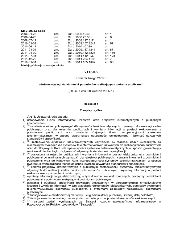 Dz.U.2005.64.565 2006-01-25 zm. 2006-04-28 zm. 2008-07-17 zm. 2010-01-01 zm. 2010-06-17 zm. 2011-01-01 zm. 2011-01-02 zm. 2011-07-01 zm. 2011-12-29 zm. 2012-01-01 zm. Istnieją późniejsze wersje tekstu Dz.U.2006.12.65 Dz.U.2006.73.501 Dz.U.2008.127.817 Dz.U.2009.157.1241 Dz.U.2010.40.230 Dz.U.2009.157.1241 Dz.U.2010.182.1228 Dz.U.2011.112.654 Dz.U.2011.204.1195 Dz.U.2011.185.1092 art. art. art. art. art. art. art. art. art. art. 1 6 1 67 1 67 159 173 7 66 USTAWA z dnia 17 lutego 2005 r. 1) o informatyzacji działalności podmiotów realizujących zadania publiczne (Dz. U. z dnia 20 kwietnia 2005 r.) Rozdział 1 Przepisy ogólne Art. 1. Ustawa określa zasady: 1) ustanawiania Planu Informatyzacji Państwa oraz projektów informatycznych o publicznym zastosowaniu, (1) ustalania minimalnych wymagań dla systemów teleinformatycznych uŜywanych do realizacji zadań 2) publicznych oraz dla rejestrów publicznych i wymiany informacji w postaci elektronicznej z podmiotami publicznymi oraz ustalania Krajowych Ram Interoperacyjności systemów teleinformatycznych w sposób gwarantujący neutralność technologiczną i jawność uŜywanych standardów i specyfikacji, (2) 3) dostosowania systemów teleinformatycznych uŜywanych do realizacji zadań publicznych do minimalnych wymagań dla systemów teleinformatycznych uŜywanych do realizacji zadań publicznych oraz do Krajowych Ram Interoperacyjności systemów teleinformatycznych w sposób gwarantujący neutralność technologiczną i jawność uŜywanych standardów i specyfikacji, (3) 4) dostosowania rejestrów publicznych i wymiany informacji w postaci elektronicznej z podmiotami publicznymi do minimalnych wymagań dla rejestrów publicznych i wymiany informacji z podmiotami publicznymi oraz do Krajowych Ram Interoperacyjności systemów teleinformatycznych w sposób gwarantujący neutralność technologiczną i jawność uŜywanych standardów i specyfikacji, (4) 5) kontroli projektów informatycznych o publicznym zastosowaniu, systemów teleinformatycznych uŜywanych do realizacji zadań publicznych, rejestrów publicznych i wymiany informacji w postaci elektronicznej z podmiotami publicznymi, 6) wymiany informacji drogą elektroniczną, w tym dokumentów elektronicznych, pomiędzy podmiotami publicznymi a podmiotami niebędącymi podmiotami publicznymi, 7) ustalania i publikacji specyfikacji rozwiązań stosowanych w oprogramowaniu umoŜliwiającym łączenie i wymianę informacji, w tym przesłanie dokumentów elektronicznych, pomiędzy systemami teleinformatycznymi podmiotów publicznych a systemami podmiotów niebędącymi podmiotami publicznymi, (5) 8) funkcjonowania elektronicznej platformy usług administracji publicznej, zwanej dalej "ePUAP", (6) 9) funkcjonowania centralnego repozytorium wzorów pism w postaci dokumentów elektronicznych, (7) 10) realizacji zadań wynikających ze Strategii rozwoju społeczeństwa informacyjnego w Rzeczypospolitej Polskiej, zwanej dalej "Strategią", - w celu ochrony interesu publicznego, w tym zachowania przez Państwo moŜliwości swobody wyboru technologii w procesach informatyzacji realizacji zadań publicznych. (8) Art. 2. 1. Z zastrzeŜeniem ust. 2-4, przepisy ustawy stosuje się do realizujących zadania publiczne określone przez ustawy: 1) organów administracji rządowej, organów kontroli państwowej i ochrony prawa, sądów, jednostek organizacyjnych prokuratury, a takŜe jednostek samorządu terytorialnego i ich organów, (9) 2) jednostek budŜetowych i samorządowych zakładów budŜetowych, 3) funduszy celowych, (10) samodzielnych publicznych zakładów opieki zdrowotnej oraz spółek wykonujących działalność 4) leczniczą w rozumieniu przepisów o działalności leczniczej, 5) Zakładu Ubezpieczeń Społecznych, Kasy Rolniczego Ubezpieczenia Społecznego, 6) Narodowego Funduszu Zdrowia, 7) państwowych lub samorządowych osób prawnych utworzonych na podstawie odrębnych ustaw w celu realizacji zadań publicznych - zwanych dalej "podmiotami publicznymi". 2. Przepis art. 13 ust. 2 pkt 1 stosuje się równieŜ do podmiotu, któremu podmiot publiczny powierzył lub zlecił realizację zadania publicznego, jeŜeli w związku z realizacją tego zadania istnieje obowiązek przekazywania informacji do lub od podmiotów niebędących organami administracji rządowej. (11) 3. Przepisów ustawy nie stosuje się do przedsiębiorstw państwowych, spółek handlowych, słuŜb specjalnych w rozumieniu art. 11 ustawy z dnia 24 maja 2002 r. o Agencji Bezpieczeństwa Wewnętrznego oraz Agencji Wywiadu (Dz. U. z 2010 r. Nr 29, poz. 154), Kancelarii Sejmu, Kancelarii Senatu, Kancelarii Prezydenta Rzeczypospolitej Polskiej oraz Narodowego Banku Polskiego, poza przypadkami gdy w związku z realizacją zadań przez te podmioty istnieje obowiązek przekazywania informacji do i od podmiotów niebędących organami administracji rządowej; w takich przypadkach stosuje się art. 13 ust. 2 pkt 1 niniejszej ustawy. (12) 4. Przepisów rozdziału 4 nie stosuje się do jednostek badawczo-rozwojowych, uczelni publicznych, Polskiej Akademii Nauk i tworzonych przez nią jednostek organizacyjnych. Rzecznika Praw Obywatelskich, Trybunału Konstytucyjnego, Sądu NajwyŜszego, sądów administracyjnych, NajwyŜszej Izby Kontroli, Krajowej Rady Radiofonii i Telewizji, Krajowego Biura Wyborczego, Instytutu Pamięci Narodowej - Komisji Ścigania Zbrodni przeciwko Narodowi Polskiemu, Generalnego Inspektora Ochrony Danych Osobowych, Komisji Nadzoru Finansowego oraz Generalnego Inspektora Informacji Finansowej. 1) 2) 3) 4) 5) 6) 7) Art. 3. UŜyte w ustawie określenia oznaczają: informatyczny nośnik danych - materiał lub urządzenie słuŜące do zapisywania, przechowywania i odczytywania danych w postaci cyfrowej; dokument elektroniczny - stanowiący odrębną całość znaczeniową zbiór danych uporządkowanych w określonej strukturze wewnętrznej i zapisany na informatycznym nośniku danych; (14) system teleinform