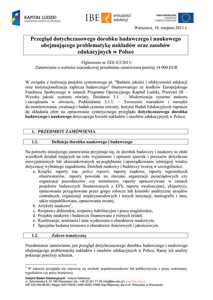 Warszawa, 18. sierpnia 2011 r. Przegląd dotychczasowego dorobku badawczego i naukowego obejmującego problematykę nakładów oraz zasobów edukacyjnych w Polsce /Ogłoszenie nr ZEE-E3/2011/ Zamówienie o wartości szacunkowej przedmiotu zamówienia poniżej 14 000 EUR W związku z realizacją projektu systemowego pt. "Badanie jakości i efektywności edukacji oraz instytucjonalizacja zaplecza badawczego" finansowanego ze środków Europejskiego Funduszu Społecznego w ramach Programu Operacyjnego Kapitał Ludzki, Priorytet III – Wysoka jakość systemu oświaty, Działanie 3.1. – Modernizacja systemu nadzoru i zarządzania w oświacie, Poddziałanie 3.1.1. – Tworzenie warunków i narzędzi do monitorowania, ewaluacji i badań systemu oświaty, Instytut Badań Edukacyjnych zaprasza do składania ofert na opracowanie syntetycznego przeglądu dotychczasowego dorobku badawczego i naukowego dotyczącego kwestii nakładów i zasobów edukacyjnych w Polsce. 1. PRZEDMIOT ZAMÓWIENIA 1.1. Definicja dorobku naukowego i badawczego Na potrzeby niniejszego zamówienia przyjmuje się, że dorobek badawczy i naukowy to efekt wszelkich działań mających na celu wyjaśnienie i opisanie zjawisk i procesów dotychczas niewyjaśnionych lub ukierunkowanych na pogłębienie i uporządkowanie istniejącej wiedzy dotyczącej wybranego zagadnienia. Dorobek naukowy i badawczy tworzą w szczególności: a. Książki, raporty (np. policy reports, raporty rządowe, raporty regionalnych obserwatoriów, raporty powstałe na zlecenie organizacji pozarządowych czy organizacji pracodawców czy ministerstw, raporty opracowywane w ramach projektów badawczych finansowanych z EFS, raporty ewaluacyjne), ekspertyzy, opracowania przygotowane przez grupy robocze lub komórki analityczne urzędów centralnych, organizacji międzynarodowych i innych instytucji, monografie i inne, także niepublikowane, opracowania zwarte, b. Artykuły naukowe1, c. Rozprawy doktorskie, rozprawy habilitacyjne i prace magisterskie, d. Projekty naukowe i badawcze finansowane z różnych źródeł, e. Konferencje, seminaria i inne wydarzenia o charakterze naukowym, f. Specjalne badania terenowe o charakterze ilościowych i jakościowym. 1.2. Zakres tematyczny Przedmiotem zamówienia jest przegląd dotychczasowego dorobku badawczego i naukowego obejmującego problematykę nakładów i zasobów edukacyjnych w Polsce. Ramy ich analizy pokazuje poniższy schemat. 1 W zakresie przeglądu nie mieszczą się artykuły popularnonaukowe lub publicystyczne z prasy codziennej, tygodników czy prasy branżowej. Instytut Badań Edukacyjnych instytut badawczy ul. Górczewska 8, 01-180 Warszawa | tel.: +48 22 241 71 00 | [email protected] | www.ibe.edu.pl NIP 525-000-86-95 | Regon 000178235 | KRS 0000113990 Sąd Rejonowy dla m.st. Warszawy w Warszawie Nakłady i zasoby edukacyjne są więc tutaj rozumiane bardzo szeroko – w zakresie analizy mieszczą się zarówno publiczne, jak i prywatne nakłady edukacyjne, ponoszone na wszystkich etapach kształcenia formalnego, a także związane z różnymi formami kształcenia pozaformalnego i nieformalnego, ponoszone przez różne podmioty (m.in. uczeń, rodzice i gospodarstwo, nauczyciel, szkoła, samorząd bądź inny organ prowadzący i państwo). W przeglądzie należy wziąć pod uwagę nie tylko nakłady finansowe, ale też nakłady czasu oraz zasoby (kadrowe i majątkowe) zaangażowane w systemie edukacji. SYSTEM EDUKACJI system oświaty, szkolnictwa wyższego i kształcenie dorosłych kształcenie formalne, pozaformalne i nieformalne Nakłady i zasoby ▫ ▫ ▫ ▫ Podmioty finansujące edukację nakłady finansowe, nakłady czasu, koszty transakcyjne, zasoby edukacyjne (kadrowe i majątkowe) ▫ ▫ ▫ ▫ ▫ ▫ państwo, jednostki samorządu terytorialnego, placówki edukacyjne, w tym szkoły wyższe, NGO, gospodarstwa domowe, instytucje europejskie i inne podmioty zagraniczne OTOCZENIE SPOŁECZNO-INSTYTUCJONALNE Charakterystyka nakładów i zasobów ▫ ▫ ▫ wysokość/wielkość nakładów i zasobów oraz ich struktura i determinanty, mechanizmy alokacji nakładów i zasobów, efektywność wydatkowania i wykorzystywania (perspektywa osiągnięć edukacyjnych i perspektywa rynku pracy) RYNKI OKOŁOEDUKACYJNE Przegląd w szczególności powinien uwzględniać następujące problemy: decyzje edukacyjne gospodarstw domowych (np. determinanty prywatnych wydatków na edukację, nakłady czasu poświęcane na naukę), publiczny system finansowania edukacji, finansowanie i zarządzanie oświatą przez jednostki samorządu terytorialnego, finanse szkół wyższych, szkolnictwo prywatne i inne prywatne usługi edukacyjne (np. rynek korepetycji, szkół językowych), rynki okołoedukacyjne (np. rynek podręczników czy pomocy szkolnych, rynki zaopatrzeniowe i rynki dostawców placówek edukacyjnych), uwarunkowania prawne, społeczne i ekonomiczne funkcjonowania szkół i polityki edukacyjnej, wynagrodzenia i rynek pracy nauczycieli, dyrektorów szkół i pracowników niedydaktycznych, konkurencja między placówkami edukacyjnymi, dostępność placówek (school choice), problem autonomii i odpowiedzialności placówek edukacyjnych (school autotomy and accountability), efektywność nakładów edukacyjnych, ewaluacja polityk edukacyjnych, wykorzystywanie zasobów edukacyjnych (np. pracowni komputerowych, laboratoriów), finansowanie edukacji przez podmioty zagraniczne, w tym rola funduszy strukturalnych. 1.3. Horyzont czasowy Przegląd obejmuje lata 1990-2011. Należy również wziąć pod uwagę projekty badawcze i inicjatywy rozpoczęte, ale nieukończone w momencie przeprowadzania przeglądu. 1.4. Zasięg terytorialny Pod uwagę powinna być wzięta wszelka aktywność naukowa i badawcza dot. terytorium Polski lub jego poszczególnych części, a także międzynarodowe analizy porównawcze oraz projekty i badania międzynarodowe z udziałem Polski. Instytut Badań Edukacyjnych instytut badawczy ul. G