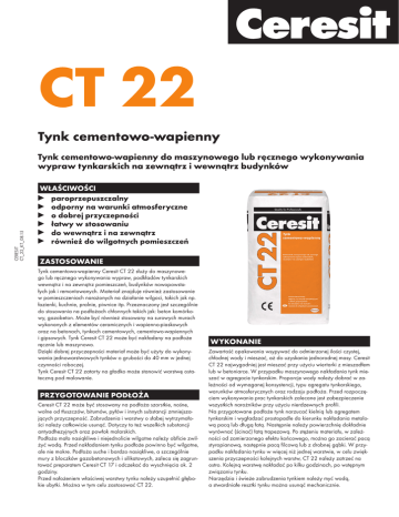 CT 22 Tynk cementowo-wapienny CERESIT CT_22_KT_08.15 Tynk cementowo-wapienny do maszynowego lub ręcznego wykonywania wypraw tynkarskich na zewnątrz i wewnątrz budynków WŁAŚCIWOŚCI paroprzepuszczalny odporny na warunki atmosferyczne o dobrej przyczepności łatwy w stosowaniu do wewnątrz i na zewnątrz również do wilgotnych pomieszczeń ZASTOSOWANIE Tynk cementowo-wapienny Ceresit CT 22 służy do maszynowego lub ręcznego wykonywania wypraw, podkładów tynkarskich wewnątrz i na zewnątrz pomieszczeń, budynków nowopowstałych jak i remontowanych. Materiał znajduje również zastosowanie w pomieszczeniach narażonych na działanie wilgoci, takich jak np. łazienki, kuchnie, pralnie, piwnice itp. Przeznaczony jest szczególnie do stosowania na podłożach chłonnych takich jak: beton komórkowy, gazobeton. Może być również stosowany na surowych murach wykonanych z elementów ceramicznych i wapienno-piaskowych oraz na betonach, tynkach cementowych, cementowo-wapiennych i gipsowych. Tynk Ceresit CT 22 może być nakładany na podłoże ręcznie lub maszynowo. Dzięki dobrej przyczepności materiał może być użyty do wykonywania jednowarstwowych tynków o grubości do 40 mm w jednej czynności roboczej. Tynk Ceresit CT 22 zatarty na gładko może stanowić warstwę ostateczną pod malowanie. PRZYGOTOWANIE PODŁOŻA Ceresit CT 22 może być stosowany na podłoża szorstkie, nośne, wolne od tłuszczów, bitumów, pyłów i innych substancji zmniejszających przyczepność. Zabrudzenia i warstwy o słabej wytrzymałości należy całkowicie usunąć. Dotyczy to też wszelkich substancji antyadhezyjnych oraz powłok malarskich. Podłoża mało nasiąkliwe i niejednolicie wilgotne należy obficie zwilżyć wodą. Przed nakładaniem tynku podłoże powinno być wilgotne, ale nie mokre. Podłoża suche i bardzo nasiąkliwe, a szczególnie mury z bloczków gazobetonowych i silikatowych, zaleca się zagruntować preparatem Ceresit CT 17 i odczekać do wyschnięcia ok. 2 godziny. Przed nałożeniem właściwej warstwy tynku należy uzupełnić głębokie ubytki. Można w tym celu zastosować CT 22. WYKONANIE Zawartość opakowania wsypywać do odmierzonej ilości czystej, chłodnej wody i mieszać, aż do uzyskania jednorodnej masy. Ceresit CT 22 najwygodniej jest mieszać przy użyciu wiertarki z mieszadłem lub w betoniarce. W przypadku maszynowego nakładania tynk mieszać w agregacie tynkarskim. Proporcje wody należy dobrać w zależności od wymaganej konsystencji, typu agregatu tynkarskiego, warunków atmosferycznych oraz rodzaju podłoża. Przed rozpoczęciem wykonywania prac tynkarskich zalecane jest zabezpieczenie wszystkich narożników przy użyciu nierdzewnych profili. Na przygotowane podłoże tynk narzucać kielnią lub agregatem tynkarskim i wygładzać prostopadle do kierunku nakładania metalową pacą lub długą łatą. Następnie należy powierzchnię dokładnie wyrównać (ścinać) łatą trapezową. Po stężeniu materiału, w zależności od zamierzonego efektu końcowego, można go zacierać pacą styropianową, następnie pacą filcową lub z drobnej gąbki. W przypadku nakładania tynku w więcej niż jednej warstwie, w celu zwiększenia przyczepności kolejnych warstw, CT 22 należy zatrzeć na ostro. Kolejną warstwę nakładać po kilku godzinach, po wstępnym związaniu tynku. Narzędzia i świeże zabrudzenia tynkiem należy myć wodą, a stwardniałe resztki tynku można usunąć mechanicznie. Po całkowitym stwardnieniu i wyschnięciu tynku (po min. 2–3 tygodniach) można go malować farbami akrylowymi CT 42, CT 44, farbami silikonowymi CT 48, CT 49 lub farbą silikatową CT 54. UWAGA Zbyt duża ilość wody dodana do tynku spowoduje obniżenie jego wytrzymałości. Prace należy wykonywać w suchych warunkach, przy temperaturze powietrza i podłoża od +5°C do +25°C. Ceresit CT 22 zawiera cement i zmieszana z wodą ma odczyn alkaliczny. W związku z tym należy chronić skórę i oczy. W przypadku kontaktu materiału z oczami płukać je obficie wodą i zasięgnąć porady lekarza. Zawartość chromu VI – poniżej 2 ppm w okresie ważności wyrobu. Wszelkie porady techniczne można uzyskać pod numerami telefonów: +48 800 120 241 +48 41 3710124. Poza informacjami podanymi w niniejszej karcie technicznej należy przestrzegać zasad sztuki budowlanej, wytycznych branżowych instytutów i stowarzyszeń, przedmiotowych norm krajowych i europejskich, dokumentów aprobacyjnych, przepisów BHP, itp. Wymienione powyżej cechy i właściwości techniczne określone zostały w oparciu o praktyczne doświadczenia oraz przeprowadzone badania. Wszelkie właściwości oraz zastosowania materiałów wykraczające poza zakres podany w niniejszej karcie technicznej wymagają naszego pisemnego potwierdzenia. Wszelkie dane odnoszą się do temperatury podłoża, otoczenia i materiału +23°C oraz wilgotności względnej powietrza 50%, o ile nie podano inaczej. W innych warunkach klimatycznych podane parametry mogą ulec zmianie. Informacje zawarte w niniejszej karcie technicznej, w szczególności zalecenia dotyczące sposobu i warunków aplikacji oraz zakresu zastosowania i użytkowania naszych produktów, zostały opracowane na podstawie naszego doświadczenia zawodowego. Niniejsza karta techniczna określa zakres stosowania materiału i zalecany sposób prowadzenia robót, ale nie może zastąpić zawodowego przygotowania wykonawcy. Producent gwarantuje jakość wyrobu, natomiast nie ma wpływu na warunki i sposób jego użycia. Biorąc pod uwagę, że warunki, w których stosowane są produkty mogą ulegać zmianie, w przypadku wątpliwości zalecane jest przeprowadzenie własnych prób. Nie ponosimy odpowiedzialności z tytułu powyżej wymienionych informacji lub jakiejkolwiek rekomendacji słownej z tym związanej, z wyjątkiem przypadków rażącego niedbalstwa lub winy umyślnej. Niniejsza karta techniczna zastępuje wszystkie poprzednie wersje, ma