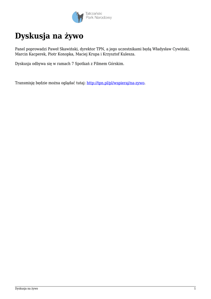Dyskusja na żywo Panel poprowadzi Paweł Skawiński, dyrektor TPN, a jego uczestnikami będą Władysław Cywiński, Marcin Kacperek, Piotr Konopka, Maciej Krupa i Krzysztof Kulesza. Dyskusja odbywa się w ramach 7 Spotkań z Filmem Górskim. Transmisję będzie można oglądać tutaj: http://tpn.pl/pl/wspieraj/na-zywo. Dyskusja na żywo 1