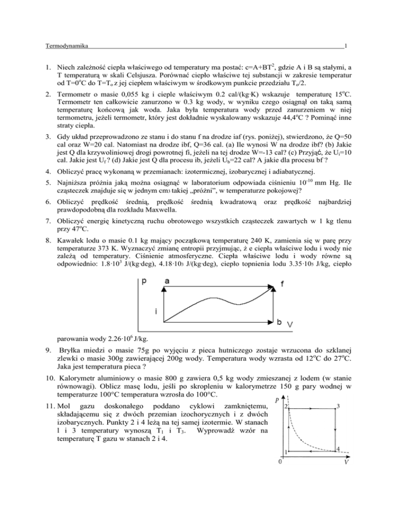Termodynamika 1 1. Niech zaleŜność ciepła właściwego od temperatury ma postać: c=A+BT2, gdzie A i B są stałymi, a T temperaturą w skali Celsjusza. Porównać ciepło właściwe tej substancji w zakresie temperatur od T=0oC do T=To z jej ciepłem właściwym w środkowym punkcie przedziału To/2. 2. Termometr o masie 0,055 kg i cieple właściwym 0.2 cal/(kg·K) wskazuje temperaturę 15oC. Termometr ten całkowicie zanurzono w 0.3 kg wody, w wyniku czego osiągnął on taką samą temperaturę końcową jak woda. Jaka była temperatura wody przed zanurzeniem w niej termometru, jeŜeli termometr, który jest dokładnie wyskalowany wskazuje 44,4oC ? Pominąć inne straty ciepła. 3. Gdy układ przeprowadzono ze stanu i do stanu f na drodze iaf (rys. poniŜej), stwierdzono, Ŝe Q=50 cal oraz W=20 cal. Natomiast na drodze ibf, Q=36 cal. (a) Ile wynosi W na drodze ibf? (b) Jakie jest Q dla krzywoliniowej drogi powrotnej fi, jeŜeli na tej drodze W=-13 cal? (c) Przyjąć, Ŝe Ui=10 cal. Jakie jest Uf ? (d) Jakie jest Q dla procesu ib, jeŜeli Ub=22 cal? A jakie dla procesu bf ? 4. Obliczyć pracę wykonaną w przemianach: izotermicznej, izobarycznej i adiabatycznej. 5. NajniŜsza próŜnia jaką moŜna osiągnąć w laboratorium odpowiada ciśnieniu 10-10 mm Hg. Ile cząsteczek znajduje się w jednym cm3 takiej „próŜni”, w temperaturze pokojowej? 6. Obliczyć prędkość średnią, prędkość prawdopodobną dla rozkładu Maxwella. średnią kwadratową oraz prędkość najbardziej 7. Obliczyć energię kinetyczną ruchu obrotowego wszystkich cząsteczek zawartych w 1 kg tlenu przy 47oC. 8. Kawałek lodu o masie 0.1 kg mający początkową temperaturę 240 K, zamienia się w parę przy temperaturze 373 K. Wyznaczyć zmianę entropii przyjmując, Ŝ e ciepła właściwe lodu i wody nie zaleŜą od temperatury. Ciśnienie atmosferyczne. Ciepła właściwe lodu i wody równe są odpowiednio: 1.8·103 J/(kg·deg), 4.18·103 J/(kg·deg), ciepło topnienia lodu 3.35·105 J/kg, ciepło parowania wody 2.26·106 J/kg. 9. Bryłka miedzi o masie 75g po wyjęciu z pieca hutniczego zostaje wrzucona do szklanej zlewki o masie 300g zawierającej 200g wody. Temperatura wody wzrasta od 12oC do 27oC. Jaka jest temperatura pieca ? 10. Kalorymetr aluminiowy o masie 800 g zawiera 0,5 kg wody zmieszanej z lodem (w stanie równowagi). Oblicz masę lodu, jeśli po skropleniu w kalorymetrze 150 g pary wodnej w temperaturze 100°C temperatura wzrosła do 100°C. 11. Mol gazu doskonałego poddano cyklowi zamkniętemu, składającemu się z dwóch przemian izochorycznych i z dwóch izobarycznych. Punkty 2 i 4 leŜą na tej samej izotermie. W stanach l i 3 temperatury wynoszą T1 i T3. Wyprowadź wzór na temperaturę T gazu w stanach 2 i 4. Termodynamika 2 12. Obliczyć pracę przypadającą na jeden mol gazu doskonałego rozpręŜającego się izotermicznie, tzn. w stałej temperaturze, od objętości początkowej V1 do objętości końcowej V2. 13. Wykazać, Ŝe dla gazu doskonałego, podlegającego przemianie adiabatycznej, pVk = const, gdzie κ = Cp/Cv. 14. Wykazać, Ŝe sprawność silnika Carnota, w którym substancją roboczą jest gaz doskonały, wynosi η = (T1-T2)/T1. 15. W zbiorniku o stałej objętości znajduje się gaz o masie m i temperaturze t1=27°C. Wskutek chwilowego otwarcia zaworu część gazu o masie 1/5 m wydostała się na zewnątrz. a) Oblicz końcową temperaturę gazu w zbiorniku, jeśli jego ciśnienie spadło do 75% ciśnienia początkowego. b) Oblicz, do jakiej wartości musiałaby wzrosnąć temperatura gazu pozostałego w zbiorniku, aby jego ciśnienie nie uległo zmianie. 16. Średnia energia kinetyczna cząsteczek tlenu poruszających się w naczyniu wynosi Eśr = 10-21J. Obliczyć gęstość tlenu ρ w tych warunkach, jeśli ciśnienie wywierane przez tlen wynosi p = 2atm. 17. W naczyniu znajdują się dwa gazy: azot i wodór w temperaturze T = 300K. Obliczyć: a) średnią energię cząsteczek azotu E1 i wodoru E2, b) średnią prędkość cząsteczek azotu v1 i wodoru v2. Jak zaleŜą energie i prędkości cząsteczek od ich liczby w naczyniu ? 15-4 18. Pewna masa m azotu zajmuje objętość V1 = 3dm3 w temperaturze T1 = 100K. Obliczyć temperaturę T2 połowy tej masy azotu w objętości V2 = 6 dm3, pod tym samym ciśnieniem. 15-6 19. Obliczyć ciśnienie p wywierane przez N = 109 cząsteczek gazu w objętości V = 1 mm3 i temperaturze T = 5000K. 20. W temperaturze t1 stopni Celsjusza gaz zajmował objętość V1, a w temperaturze t2, objętość V2. Obliczyć współczynnik rozszerzalności objętościowej α, jeŜeli ciśnienie pozostawało stałe. 15-12 21. W dwu naczyniach o pojemnościach V1 i V2 znajdują się dwa róŜne gazy o masach m1 i m2 i masach cząsteczkowych µ1 i µ2. Obliczyć ciśnienie mieszaniny gazów powstałej po połączeniu obu naczyń przewodem, którego pojemność moŜna pominąć. Temperatura obydwu gazów jest stała i wynosi T. 15-13 22. Do naczynia o pojemności V, zawierającego suche powietrze w temperaturze T, wprowadzono masę m wody. Obliczyć wilgotność względną ww w naczyniu. 15-14 23. W dwóch jednakowych naczyniach o pojemności V = 1m3 kaŜde znajduje się nasycona para wodna: w pierwszym w temperaturze T1 = 0oC masa m1 = 4,84 g pary wodnej wywiera ciśnienie p1 = 610Pa, w drugim w temperaturze T2 = 120oC masa m2 = 1122 g pary wodnej wywiera ciśnienie p2 = 198,5·103Pa. Obliczyć, ile razy wzrosłoby ciśnienie w kaŜdym z tych naczyń, gdyby nie zmieniając temperatury rozłoŜyć całą parę wodną na mieszaninę cząsteczek tlenu O2 i wodoru H2. 15-15 24. Butla zawiera gaz w temperaturze T1. Po wypuszczeniu części gazu zwiększono temperaturę do T2. Obliczyć, ile razy (x) wzrosła gęstość gazu w butli, jeŜeli ciśnienie wzrosło k razy. 15-18 Termodynamika 3 25. Probówka o długości L i przekroju S została odwrócona otwartym końcem do dołu i wskutek obciąŜenia zasklepionego końca masą m zanurzona do