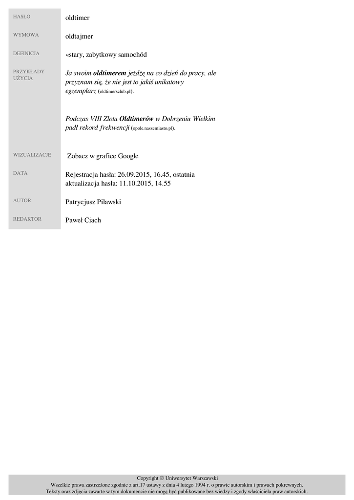 HASŁO oldtimer WYMOWA oldtajmer DEFINICJA «stary, zabytkowy samochód» PRZYKŁADY UŻYCIA Ja swoim oldtimerem jeżdżę na co dzień do pracy, ale przyznam się, że nie jest to jakiś unikatowy egzemplarz (oldtimersclub.pl). Podczas VIII Zlotu Oldtimerów w Dobrzeniu Wielkim padł rekord frekwencji (opole.naszemiasto.pl). WIZUALIZACJE Zobacz w grafice Google DATA Rejestracja hasła: 26.09.2015, 16.45, ostatnia aktualizacja hasła: 11.10.2015, 14.55 AUTOR Patrycjusz Pilawski REDAKTOR Paweł Ciach Copyright © Uniwersytet Warszawski Wszelkie prawa zastrzeżone zgodnie z art.17 ustawy z dnia 4 lutego 1994 r. o prawie autorskim i prawach pokrewnych. Teksty oraz zdjęcia zawarte w tym dokumencie nie mogą być publikowane bez wiedzy i zgody właściciela praw autorskich. Powered by TCPDF (www.tcpdf.org)