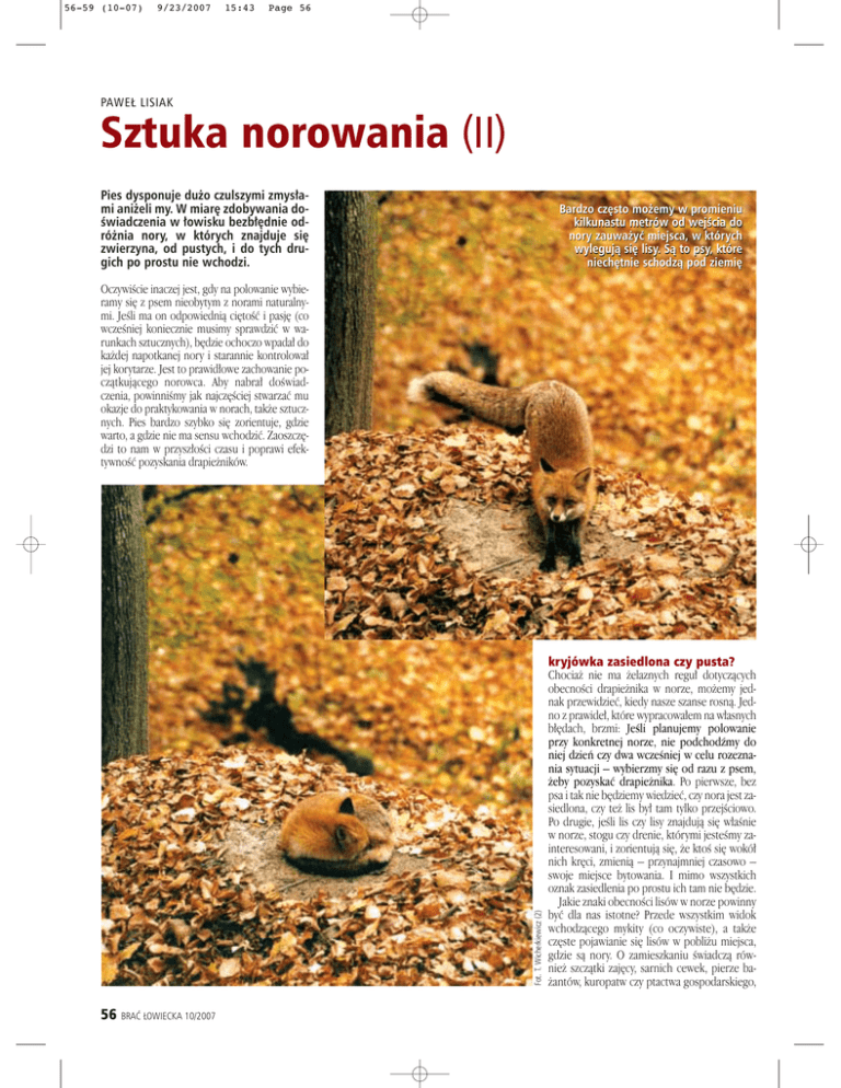 56-59 (10-07) 9/23/2007 15:43 Page 56 PAWE¸ LISIAK Sztuka norowania (II) Pies dysponuje du˝o czulszymi zmys∏ami ani˝eli my. W miar´ zdobywania doÊwiadczenia w ∏owisku bezb∏´dnie odró˝nia nory, w których znajduje si´ zwierzyna, od pustych, i do tych drugich po prostu nie wchodzi. Bardzo cz´sto mo˝emy w promieniu kilkunastu metrów od wejÊcia do nory zauwa˝yç miejsca, w których wylegujà si´ lisy. Sà to psy, które niech´tnie schodzà pod ziemi´ Fot. T. Wicherkiewicz (2) OczywiÊcie inaczej jest, gdy na polowanie wybieramy si´ z psem nieobytym z norami naturalnymi. JeÊli ma on odpowiednià ci´toÊç i pasj´ (co wczeÊniej koniecznie musimy sprawdziç w warunkach sztucznych), b´dzie ochoczo wpada∏ do ka˝dej napotkanej nory i starannie kontrolowa∏ jej korytarze. Jest to prawid∏owe zachowanie poczàtkujàcego norowca. Aby nabra∏ doÊwiadczenia, powinniÊmy jak najcz´Êciej stwarzaç mu okazje do praktykowania w norach, tak˝e sztucznych. Pies bardzo szybko si´ zorientuje, gdzie warto, a gdzie nie ma sensu wchodziç. Zaoszcz´dzi to nam w przysz∏oÊci czasu i poprawi efektywnoÊç pozyskania drapie˝ników. 56 BRAå ¸OWIECKA 10/2007 kryjówka zasiedlona czy pusta? Chocia˝ nie ma ˝elaznych regu∏ dotyczàcych obecnoÊci drapie˝nika w norze, mo˝emy jednak przewidzieç, kiedy nasze szanse rosnà. Jedno z prawide∏, które wypracowa∏em na w∏asnych b∏´dach, brzmi: JeÊli planujemy polowanie przy konkretnej norze, nie podchodêmy do niej dzieƒ czy dwa wczeÊniej w celu rozeznania sytuacji – wybierzmy si´ od razu z psem, ˝eby pozyskaç drapie˝nika. Po pierwsze, bez psa i tak nie b´dziemy wiedzieç, czy nora jest zasiedlona, czy te˝ lis by∏ tam tylko przejÊciowo. Po drugie, jeÊli lis czy lisy znajdujà si´ w∏aÊnie w norze, stogu czy drenie, którymi jesteÊmy zainteresowani, i zorientujà si´, ˝e ktoÊ si´ wokó∏ nich kr´ci, zmienià – przynajmniej czasowo – swoje miejsce bytowania. I mimo wszystkich oznak zasiedlenia po prostu ich tam nie b´dzie. Jakie znaki obecnoÊci lisów w norze powinny byç dla nas istotne? Przede wszystkim widok wchodzàcego mykity (co oczywiste), a tak˝e cz´ste pojawianie si´ lisów w pobli˝u miejsca, gdzie sà nory. O zamieszkaniu Êwiadczà równie˝ szczàtki zaj´cy, sarnich cewek, pierze ba˝antów, kuropatw czy ptactwa gospodarskiego, 56-59 (10-07) 9/23/2007 15:44 Page 57 a nierzadko resztki kotów domowych. Du˝o mo˝e nam powiedzieç tak˝e samo okno – wystarczy sprawdziç, czy jest Êwie˝o wyszlifowane, czy zaroÊni´te (co Êwiadczy o tym, ˝e nora nie jest odwiedzana). Aby sprawdziç zasiedlenie nory, szczególnie borsuczej, mo˝na ustawiç p∏otek z cienkich ga∏àzek lub innà przeszkod´, którà drapie˝nik b´dzie musia∏ naruszyç. Pami´tajmy równie˝, ˝e piasek wokó∏ nory Êwiadczy o tym, ˝e lis jà opuÊci∏ – bo gdy spokojnie wychodzi, to si´ otrzepuje – a nie o tym, ˝e w∏aÊnie w niej siedzi. Cz´sto si´ zdarza, ˝e myÊliwi nie dowierzajà psu. Nieraz s∏ysz´: „W tej norze to nawet ja czu∏em lisa, a pies nie chcia∏ wejÊç”. Nic bardziej b∏´dnego! Z wielu obserwacji wynika, ˝e im bardziej czuç lisa wokó∏ nory, tym mniejsze szanse, ˝e znajduje si´ on w Êrodku. Wyt∏umaczenie jest bardzo proste. Lis, opuszczajàc lub kontrolujàc nor´, nie wchodzi do niej, tylko za∏atwia si´ na zewnàtrz, znakujàc jà swoim osobniczym zapachem. Bardzo cz´sto psy tak˝e zostawiajà w tym miejscu swój zapach, opryskujàc nor´ moczem. Zaufajmy psu, poniewa˝ jego zachowanie to najpewniejsza wskazówka. Wiele razy, sàdzàc po wyglàdzie nory, stwierdza∏em: „Tu nic nie ma, mo˝emy iÊç dalej”, po czym pies jednak wchodzi∏ i okazywa∏o si´, ˝e moja wiedza w konfrontacji z jego nosem na niewiele si´ zdaje. Zdarza∏o si´, ˝e otwór nory by∏ kompletnie zawiany kilkudniowym Êniegiem, ˝adnych tropów, a pies odgrzebywa∏ wejÊcie, wpada∏ z impetem i wypycha∏ nawet kilka drapie˝ników. Pami´tam tak˝e sytuacj´, jak pies zaczà∏ rozkopywaç wejÊcie, przez które – sàdzàc po jego wielkoÊci – móg∏by si´ przedostaç jedynie dziki królik. Jakie˝ by∏o moje zdziwienie, gdy si´ okaza∏o, ˝e nor´ zasiedla para wcale niema∏ych lisów. OczywiÊcie do dzisiaj staram si´ rozpoznaç zasiedlenie nory, ale ostatecznà ocen´ zawsze opieram na sygna∏ach dawanych przez moje psy. Cennych wskazówek co do obecnoÊci lisów w norach mo˝e dostarczyç tak˝e obserwacja zachowania psa przed wyprawà na polowanie. Jako ˝e mam kilkanaÊcie psów, zazwyczaj przyglàdam si´ im przed wyjazdem. Zauwa˝y∏em, ˝e jeÊli psy przebywajà w budach i niech´tnie je opuszczajà z powodu warunków atmosferycznych, szansa na spotkanie lisa w norze jest du˝a. Zdecydowana wi´kszoÊç lisów pozyskiwanych w norach to liszki i niedoliski; psy spotykamy okazjonalnie i przede wszystkim podczas rui. Bardzo cz´sto, szczególnie zimà, mo˝emy w promieniu kilkunastu metrów od wejÊcia zauwa˝yç miejsca, w których wylegujà si´ lisy. Sà to w∏aÊnie psy, które niech´tnie wchodzà do nor. Zresztà niech´ç samców do nor mo˝emy dostrzec, analizujàc pozyskanie lisów podczas polowaƒ zbiorowych, gdzie stanowià one zdecydowanà wi´kszoÊç. Nory odgrywajà najwa˝niejszà rol´ w wychowaniu szczeniàt, zapewniajàc niemal sta∏à temperatur´ i ochron´ nie tylko przed wp∏ywami atmosferycznymi, ale równie˝ przed innymi drapie˝nikami. Dla doros∏ych lisów nora jest tylko schronieniem przed z∏à pogodà, szczególnie przed wilgocià, która zmniejsza izolacj´ termicznà ich sierÊci. sezon norowca Polowania przy norach najlepiej rozpoczàç w listopadzie, kiedy lisy zaczynajà wi´cej czasu sp´dzaç pod ziemià. Borsuki sà w norach oczywiÊcie przez ca∏y rok. Mamy tak˝e szans´ natrafiç na jenota, a raczej jenoty, które zamieszkujà nory parami. Mo˝emy równie˝ spotkaç zdzicza∏e psy, tchórze itp. Po