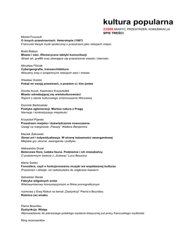 kultura popularna 2/2006 MIASTO, PRZESTRZEŃ, KOMUNIKACJA SPIS TREŚCI Michel Foucault O innych przestrzeniach. Heterotopie (1967) Francuski klasyk myśli społecznej o przestrzeni jako relacjach miejsc Bodó Balázs Miasto i sieć. Efemeryczne taktyki komunikacji Street art, graffiti oraz zlewające się przestrzenie miasta i internetu Mirosław Filiciak Cybergeografia, transarchitektura Wizualny esej o wzajemnych relacjach sieci i miasta Wiesław Godzic Pokaż mi swoją przestrzeń, a powiem ci, kim jesteś Dorota Ilczuk, Kazimierz Krzysztofek Miasto odradzającej się wielokulturowości Raport o stanie kulturowego zróżnicowania Warszawy Dominik Bartmański Poetyka aglomeracji. Martwa natura z Pragą Narracje i konkretyzacja miejskości Krzysztof Pijarski Przestrzeń miejska i doświadczenie nowoczesne Uwagi na marginesie „Pasaży” Waltera Benjamina Maciek Żakowski Street art i indywidualizacja. W stronę tożsamości awangardowej Miejskie gry uliczne, awangarda i polityka Aleksandra Drzał Betonowa flora, ludzka fauna. Podziemia i ich mieszkańcy O podziemnym świecie z „Subway” Luca Bessona Marta Subko Fonosfera, czyli o funkcjonowaniu muzyki we współzesnej kulturze Przestrzeń i dźwięk: od radiobudzika do odgłosów kawiarni Sebastian Rerak Fabryka wilgotnych snów Wielowymiarowy konsumpcjonizm w filmie pornograficznym rozmowa z Ewą Klekot na temat „Dystynkcji” Pierre’a Bourdieu Różnica (w) smaku Pierre Bourdieu Dystynkcja. Wstęp Wprowadzenie do pierwszego polskiego wydania klasycznej już pracy francuskiego myśliciela Ring recenzentów