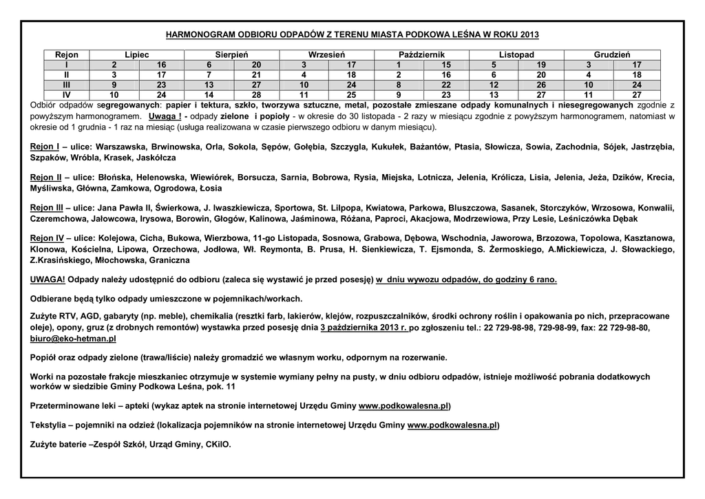 HARMONOGRAM ODBIORU ODPADÓW Z TERENU MIASTA PODKOWA LE NA W ROKU 2013 Rejon Lipiec Sierpie Wrzesie Pa dziernik Listopad Grudzie I 2 16 6 20 3 17 1 15 5 19 3 17 II 3 17 7 21 4 18 2 16 6 20 4 18 III 9 23 13 27 10 24 8 22 12 26 10 24 IV 10 24 14 28 11 25 9 23 13 27 11 27 Odbiór odpadów segregowanych: papier i tektura, szk o, tworzywa sztuczne, metal, pozosta e zmieszane odpady komunalnych i niesegregowanych zgodnie z powy szym harmonogramem. Uwaga ! - odpady zielone i popio y - w okresie do 30 listopada - 2 razy w miesi cu zgodnie z powy szym harmonogramem, natomiast w okresie od 1 grudnia - 1 raz na miesi c (us uga realizowana w czasie pierwszego odbioru w danym miesi cu). Rejon I – ulice: Warszawska, Brwinowska, Orla, Sokola, S pów, Go bia, Szczygla, Kuku ek, Ba antów, Ptasia, S owicza, Sowia, Zachodnia, Sójek, Jastrz bia, Szpaków, Wróbla, Krasek, Jaskó cza Rejon II – ulice: B ska, Helenowska, Wiewiórek, Borsucza, Sarnia, Bobrowa, Rysia, Miejska, Lotnicza, Jelenia, Królicza, Lisia, Jelenia, Je a, Dzików, Krecia, My liwska, G ówna, Zamkowa, Ogrodowa, osia Rejon III – ulice: Jana Paw a II, wierkowa, J. Iwaszkiewicza, Sportowa, St. Lilpopa, Kwiatowa, Parkowa, Bluszczowa, Sasanek, Storczyków, Wrzosowa, Konwalii, Czeremchowa, Ja owcowa, Irysowa, Borowin, G ogów, Kalinowa, Ja minowa, Ró ana, Paproci, Akacjowa, Modrzewiowa, Przy Lesie, Le niczówka D bak Rejon IV – ulice: Kolejowa, Cicha, Bukowa, Wierzbowa, 11-go Listopada, Sosnowa, Grabowa, D bowa, Wschodnia, Jaworowa, Brzozowa, Topolowa, Kasztanowa, Klonowa, Ko cielna, Lipowa, Orzechowa, Jod owa, W . Reymonta, B. Prusa, H. Sienkiewicza, T. Ejsmonda, S. ermoskiego, A.Mickiewicza, J. S owackiego, Z.Krasi skiego, M ochowska, Graniczna UWAGA! Odpady nale y udost pni do odbioru (zaleca si wystawi je przed posesj ) w dniu wywozu odpadów, do godziny 6 rano. Odbierane b tylko odpady umieszczone w pojemnikach/workach. Zu yte RTV, AGD, gabaryty (np. meble), chemikalia (resztki farb, lakierów, klejów, rozpuszczalników, rodki ochrony ro lin i opakowania po nich, przepracowane oleje), opony, gruz (z drobnych remontów) wystawka przed posesj dnia 3 pa dziernika 2013 r. po zg oszeniu tel.: 22 729-98-98, 729-98-99, fax: 22 729-98-80, [email protected] Popió oraz odpady zielone (trawa/li cie) nale y gromadzi we w asnym worku, odpornym na rozerwanie. Worki na pozosta e frakcje mieszkaniec otrzymuje w systemie wymiany pe ny na pusty, w dniu odbioru odpadów, istnieje mo liwo worków w siedzibie Gminy Podkowa Le na, pok. 11 Przeterminowane leki – apteki (wykaz aptek na stronie internetowej Urz du Gminy www.podkowalesna.pl) Tekstylia – pojemniki na odzie (lokalizacja pojemników na stronie internetowej Urz du Gminy www.podkowalesna.pl) Zu yte baterie –Zespó Szkó , Urz d Gminy, CKiIO. pobrania dodatkowych ZASADY SEGREGACJI ODPADÓW W MIE CIE PODKOWA LE NA WOREK NIEBIESKI PAPIER I TEKTURA WRZUCAMY OPAKOWANIA Z PAPIERU TEKTURY GAZETY NIE WRZUCAMY PAPIERU POWLEKANEGO FOLI KALKI PIELUCH CZASOPISMA PODPASEK KATALOGI PROSPEKTY FOLDERY PODK ADEK PAPIER SZKOLNY BIUROWY KSI KI ZESZYTY TOREBKI PAPIEROWE WOREK CZERWONY METALE WRZUCAMY PUSZKI PO NAPOJACH SOKACH OM ELAZNY METALE KOLOROWE WORKÓW PO NAWOZACH, MATERIA ACH BUDOWLANYCH METALOWE KAPSLE ZAKR TKI TAPET FOLIA ALUMINIOWA INNYCH ODPADÓW KOMUNALNYCH (W TYM NIEBEZPIECZNYCH) NIE WRZUCAMY OPAKOWA Z ZAWARTO CI INNYCH ODPADÓW KOMUNALNYCH (W TYM NIEBEZPIECZNYCH) WOREK BIA Y- SZK O WRZUCAMY BUTELKI OIKI SZKLANE OPAKOWANA PO KOSMETYKACH KARTONIKI PO MLEKU NAPOJACH NIE WRZUCAMY CERAMIKI PORCELANY LUSTER SZYB SZK A ZBROJONEGO AROODPORNEGO DONICZEK ZNICZY Z ZAWARTO CI WOSKU ARÓWEK I WIETLÓWEK SZK A KRYSZTA OWEGO REFLEKTORÓW TERMOMETRÓW STRZYKAWEK MONITORÓW SZYB INNYCH ODPADÓW KOMUNALNYCH (W TYM NIEBEZPIECZNYCH) WOREK ZIELONY TWORZYWA SZTUCZNE WRZUCAMY PLASTIKOWE BUTELKI PO NAPOJACH OPAKOWANIA PO CHEMII GOSPODARCZEJ OPAKOWANIA PO PRODUKTACH SPO YWCZYCH PLASTIKOWE ZAKR TKI PLASTIKOWE TOREBKI, WORKI, REKLAMÓWKI I INNE FOLIE PLASTIKOWE KOSZYKI PO OWOCACH I INNYCH PRODUKTACH NIE WRZUCAMY ODPADÓW BUDOWLANYCHI OPAKOWA PO FARBACH, LAKIERACH I OLEJACH BATERII AKUMULATORÓW Zu ytego RTV, AGD INNYCH ODPADÓW KOMUNALNYCH (W TYM NIEBEZPIECZNYCH ) WOREK NA ODPADY „ZIELONE” (TRAWA I LI CIE) WRZUCA NIE MY WRZUCAMY TRAW LI CIE DROBNE GA ZIE KWIATY OBIERKI Z OWOCÓW I WARZYW TROCINY KORA ZLEWEK KUCHENNYCH KO CI ZWIERZ T MI SO I PADLINA ZWIERZ T OLEJÓW DREWNA IMPREGNOWANE GO YT WIÓROWYCH I MDF LEKÓW ODCHODÓW ZWIERZ T INNYCH ODPADÓW KOMUNALNYCH W TYM NIEBEZPIECZNYCH POPIO U WOREK CZARNY POZOSTA E ZMIESZANE ODPADY KOMUNALNE WRZUCAMY ODPADY POZOSTA E PO SEGREGACJI RESZTKI JEDZENIA PIELUCHY PODPASKI ARTYKU Y HIGIENICZNE ZAT USZCZONE OPAKOWANIA MOKRY, BRUDNY PAPIER I FOLIE WIREK I TROCINY Z KUWET, KLATKI ODCHODY ZWIERZ T DOMOWYCH WORKI Z ODKURZACZY Z ZAWARTO CI TWORZYWA PIANKOWE PAPIER TERMICZNY I FAKSOWY KALK TAPETY CERAMIK I PORCELAN LUSTRA SZYBY SZK O ZBROJONE I AROODPORNE OBUWIE NIE WRZUCAMY LEKÓW BATERII AKUMULATORÓW ODPADÓW BUDOWLANYCH OPAKOWA PO FARBACH, LAKIERACH I OLEJACH ZU YTEGO RTV, AGD OPAKOWA PO NAWOZACH, RODKACH OWADO I CHWATOBÓJCZYCH PUDE KA KARTONOWE NA P ASKO, WRZUCAJ SUROWCE BEZ RESZTEK PRODUKTÓW, ZGNIE PUSZKI I BUTELKI PLASTIKOWE PRZED WRZUCENIEM, NIE T UCZ SZK A PRZED WRZUCENIEM, ZDEJMIJ NAKR TK , POKRYWK Zleceniodawca Miasto Podkowa Le na, tel. 22 759 21 25 [email protected] www.podkowalesna.pl Wykonawca Eko-Hetman Sp. z o.o. tel. 22 729-98-98, tel. 22 729-98-99 e-mail:[email protected] www.eko-hetman.pl