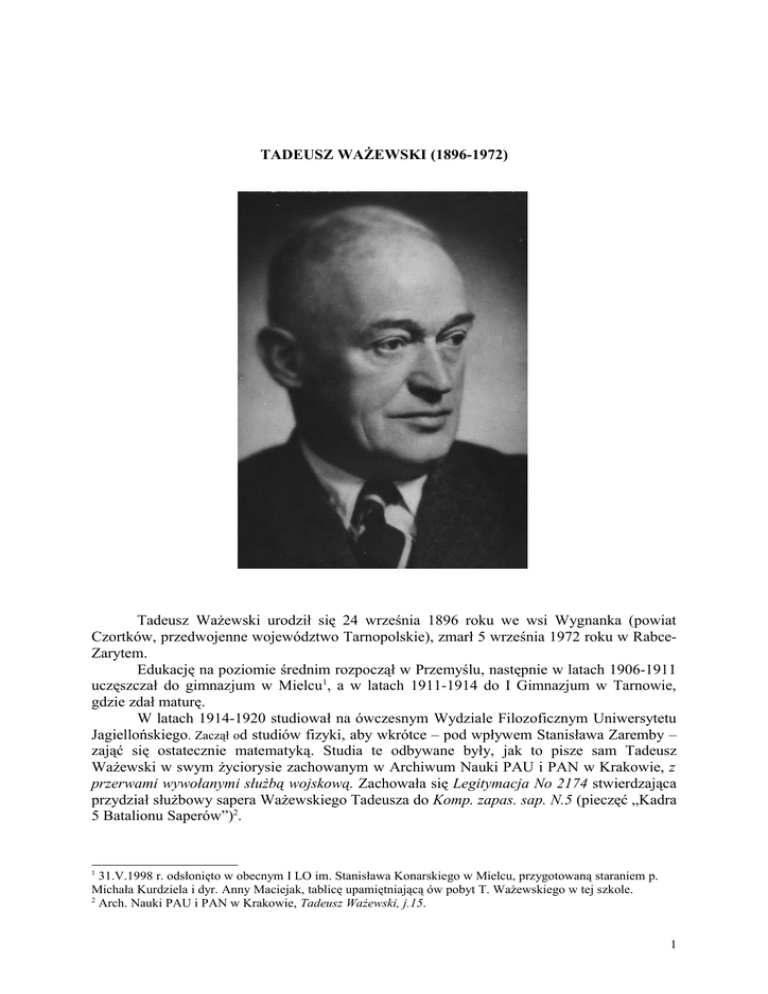 Ważewski w swym życiorysie zachowanym w Archiwum Nauki PAU i PAN w Krakowie, z