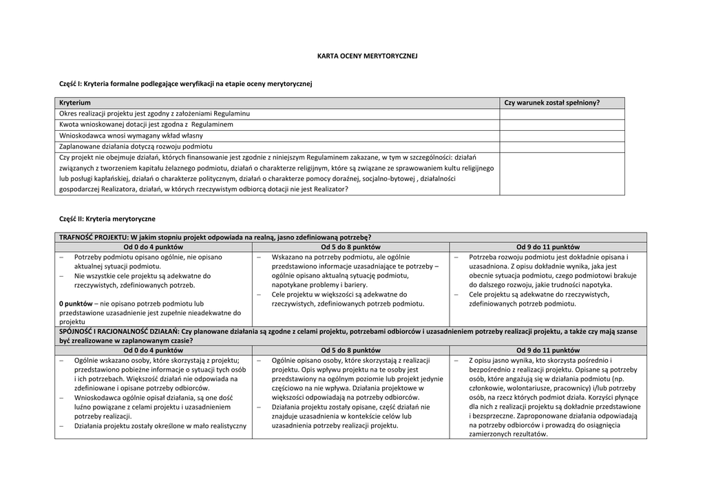KARTA OCENY MERYTORYCZNEJ Część I: Kryteria formalne podlegające weryfikacji na etapie oceny merytorycznej Kryterium Okres realizacji projektu jest zgodny z założeniami Regulaminu Kwota wnioskowanej dotacji jest zgodna z Regulaminem Wnioskodawca wnosi wymagany wkład własny Zaplanowane działania dotyczą rozwoju podmiotu Czy projekt nie obejmuje działań, których finansowanie jest zgodnie z niniejszym Regulaminem zakazane, w tym w szczególności: działań związanych z tworzeniem kapitału żelaznego podmiotu, działań o charakterze religijnym, które są związane ze sprawowaniem kultu religijnego lub posługi kapłańskiej, działań o charakterze politycznym, działań o charakterze pomocy doraźnej, socjalno-bytowej , działalności gospodarczej Realizatora, działań, w których rzeczywistym odbiorcą dotacji nie jest Realizator? Czy warunek został spełniony? Część II: Kryteria merytoryczne TRAFNOŚĆ PROJEKTU: W jakim stopniu projekt odpowiada na realną, jasno zdefiniowaną potrzebę? Od 0 do 4 punktów Od 5 do 8 punktów Od 9 do 11 punktów Potrzeby podmiotu opisano ogólnie, nie opisano Wskazano na potrzeby podmiotu, ale ogólnie Potrzeba rozwoju podmiotu jest dokładnie opisana i aktualnej sytuacji podmiotu. przedstawiono informacje uzasadniające te potrzeby – uzasadniona. Z opisu dokładnie wynika, jaka jest ogólnie opisano aktualną sytuację podmiotu, obecnie sytuacja podmiotu, czego podmiotowi brakuje Nie wszystkie cele projektu są adekwatne do napotykane problemy i bariery. do dalszego rozwoju, jakie trudności napotyka. rzeczywistych, zdefiniowanych potrzeb. Cele projektu w większości są adekwatne do Cele projektu są adekwatne do rzeczywistych, 0 punktów – nie opisano potrzeb podmiotu lub rzeczywistych, zdefiniowanych potrzeb podmiotu. zdefiniowanych potrzeb podmiotu. przedstawione uzasadnienie jest zupełnie nieadekwatne do projektu SPÓJNOŚĆ I RACJONALNOŚĆ DZIAŁAŃ: Czy planowane działania są zgodne z celami projektu, potrzebami odbiorców i uzasadnieniem potrzeby realizacji projektu, a także czy mają szanse być zrealizowane w zaplanowanym czasie? Od 0 do 4 punktów Od 5 do 8 punktów Od 9 do 11 punktów Ogólnie wskazano osoby, które skorzystają z projektu; Ogólnie opisano osoby, które skorzystają z realizacji Z opisu jasno wynika, kto skorzysta pośrednio i przedstawiono pobieżne informacje o sytuacji tych osób projektu. Opis wpływu projektu na te osoby jest bezpośrednio z realizacji projektu. Opisane są potrzeby i ich potrzebach. Większość działań nie odpowiada na przedstawiony na ogólnym poziomie lub projekt jedynie osób, które angażują się w działania podmiotu (np. zdefiniowane i opisane potrzeby odbiorców. częściowo na nie wpływa. Działania projektowe w członkowie, wolontariusze, pracownicy) i/lub potrzeby większości odpowiadają na potrzeby odbiorców. osób, na rzecz których podmiot działa. Korzyści płynące Wnioskodawca ogólnie opisał działania, są one dość dla nich z realizacji projektu są dokładnie przedstawione luźno powiązane z celami projektu i uzasadnieniem Działania projektu zostały opisane, część działań nie i bezsprzeczne. Zaproponowane działania odpowiadają potrzeby realizacji. znajduje uzasadnienia w kontekście celów lub na potrzeby odbiorców i prowadzą do osiągnięcia uzasadnienia potrzeby realizacji projektu. Działania projektu zostały określone w mało realistyczny zamierzonych rezultatów. sposób; ich realizacja w okresie trwania projektu jest bardzo trudna lub niemożliwa. Wnioskodawca poprawnie opisał większość etapów realizacji działań. 0 punktów – nie zostały określone osoby, które skorzystają z projektu; projekt nie przynosi odbiorcom żadnych korzyści/nie ma wpływu na zaspokojenie potrzeb odbiorców. Wnioskodawca nie przedstawił realnego planu realizacji poszczególnych działań projektu; opis działań jest wewnętrznie niespójny, brakuje w nim działań niezbędnych do osiągnięcia zakładanych rezultatów projektu. Zaplanowane działania zostały szczegółowo opisane, jasno wynika z nich, co w ramach projektu będzie się działo. Wszystkie działania mają swoje uzasadnienie w kontekście celów projektu i uzasadnienia potrzeby jego realizacji. Wnioskodawca nie pominął żadnego etapu realizacji działań, zwracając uwagę na działania przygotowawcze i podsumowujące związane z administrowaniem projektem. WAŻNE: w projektach dotyczących rozwoju organizacji należy zwrócić uwagę, że odbiorcami projektu będą przede wszystkim członkowie organizacji, jej wolontariusze i współpracownicy. Wnioskodawcy mogą też jako odbiorców wskazać osoby, na rzecz których działa organizacja. TRWAŁOŚĆ: W jakim stopniu dotacja w sposób trwały wpłynie na rozwój podmiotu? Od 0 do 2 punktów Od 3 do 4 punktów Działania przewidziane w projekcie w niewielkim Ogólnie opisano wpływ dotacji na rozwój podmiotu; stopniu wpływają na rozwój podmiotu lub też ich efekty większość zaplanowanych działań w sposób trwały nie będą trwałe. wpływa na podmiot i zapewnia jego rozwój. 0 punktów: dotacja nie wpłynie na trwały rozwój podmiotu SKUTECZNOŚĆ: Czy planowane rezultaty są możliwe do osiągnięcia w ramach realizacji projektu? Od 0 do 4 punktów Od 5 do 8 punktów Nie określono poprawnie rezultatów ilościowych lub Podano rezultaty ilościowe i jakościowe projektu. jakościowych projektu. Większość rezultatów jest spójna z działaniami Część rezultatów nie jest spójna z działaniami określonymi we wniosku. określonymi we wniosku. Większość zaplanowanych rezultatów jest realna, Część rezultatów nie jest realna, możliwa do osiągnięcia; możliwa do osiągnięcia. nie można jednoznacznie ocenić trwałości rezultatów. Od 5 do 6 punktów Uzyskana dotacja w sposób trwały wpłynie na rozwój podmiotu, np. pozwoli na podniesienie kompetencji wolontariuszy/współpracowników, p