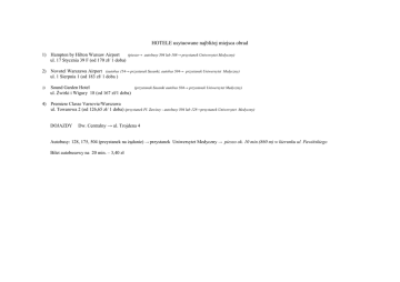HOTELE usytuowane najbliżej miejsca obrad 1) Hampton by Hilton Warsaw Airport (pieszo→ autobusy 504 lub 188→ przystanek Uniwersytet Medyczny) ul. 17 Stycznia 39 F (od 170 zł/ 1 doba) 2) Novotel Warszawa Airport (autobus 154→ przystanek Sasanki, autobus 504→ przystanek Uniwersytet Medyczny) ul. 1 Sierpnia 1 (od 183 zł/ 1 doba ) 3) Sound Garden Hotel (przystanek Sasanki autobus 504→ przystanek Uniwersytet Medyczny) ul. Żwirki i Wigury 18 (od 167 zł/1 doba) 4) Premiere Classe Varsovie/Warszawa ul. Towarowa 2 (od 126,65 zł/ 1 doba) (przystanek Pl. Zawiszy - autobusy 504 lub 128→przystanek Uniwersytet Medyczny) DOJAZDY Dw. Centralny → ul. Trojdena 4 Autobusy: 128, 175, 504 (przystanek na żądanie) → przystanek Uniwersytet Medyczny → pieszo ok. 10 min.(860 m) w kierunku ul. Pawińskiego Bilet autobusowy na 20 min. – 3,40 zł