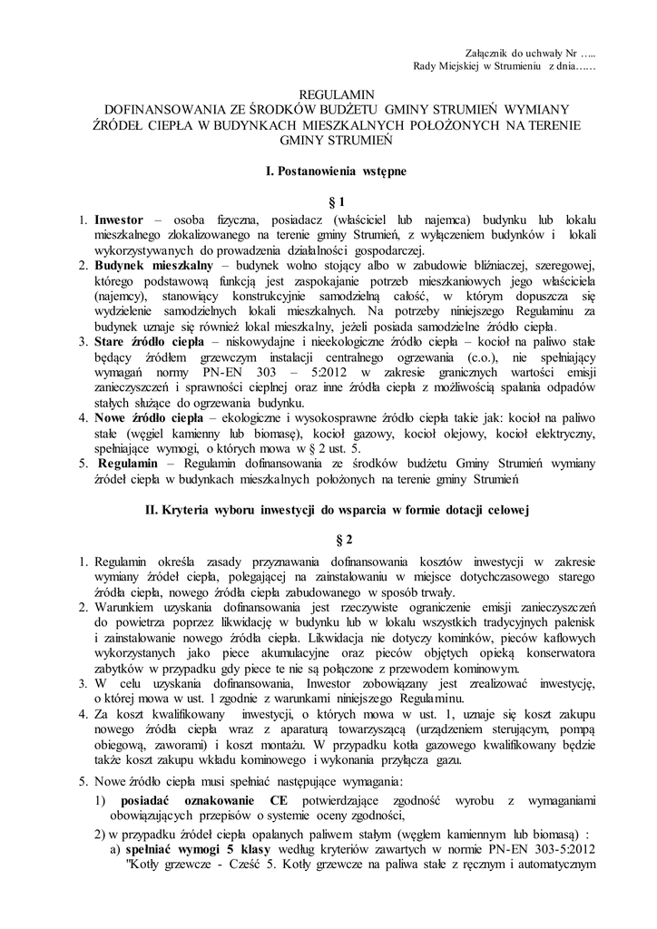 Załącznik do uchwały Nr ….. Rady Miejskiej w Strumieniu z dnia…… REGULAMIN DOFINANSOWANIA ZE ŚRODKÓW BUDŻETU GMINY STRUMIEŃ WYMIANY ŹRÓDEŁ CIEPŁA W BUDYNKACH MIESZKALNYCH POŁOŻONYCH NA TERENIE GMINY STRUMIEŃ I. Postanowienia wstępne 1. 2. 3. 4. 5. §1 Inwestor – osoba fizyczna, posiadacz (właściciel lub najemca) budynku lub lokalu mieszkalnego zlokalizowanego na terenie gminy Strumień, z wyłączeniem budynków i lokali wykorzystywanych do prowadzenia działalności gospodarczej. Budynek mieszkalny – budynek wolno stojący albo w zabudowie bliźniaczej, szeregowej, którego podstawową funkcją jest zaspokajanie potrzeb mieszkaniowych jego właściciela (najemcy), stanowiący konstrukcyjnie samodzielną całość, w którym dopuszcza się wydzielenie samodzielnych lokali mieszkalnych. Na potrzeby niniejszego Regulaminu za budynek uznaje się również lokal mieszkalny, jeżeli posiada samodzielne źródło ciepła. Stare źródło ciepła – niskowydajne i nieekologiczne źródło ciepła – kocioł na paliwo stałe będący źródłem grzewczym instalacji centralnego ogrzewania (c.o.), nie spełniający wymagań normy PN-EN 303 – 5:2012 w zakresie granicznych wartości emisji zanieczyszczeń i sprawności cieplnej oraz inne źródła ciepła z możliwością spalania odpadów stałych służące do ogrzewania budynku. Nowe źródło ciepła – ekologiczne i wysokosprawne źródło ciepła takie jak: kocioł na paliwo stałe (węgiel kamienny lub biomasę), kocioł gazowy, kocioł olejowy, kocioł elektryczny, spełniające wymogi, o których mowa w § 2 ust. 5. Regulamin – Regulamin dofinansowania ze środków budżetu Gminy Strumień wymiany źródeł ciepła w budynkach mieszkalnych położonych na terenie gminy Strumień II. Kryteria wyboru inwestycji do wsparcia w formie dotacji celowej §2 1. Regulamin określa zasady przyznawania dofinansowania kosztów inwestycji w zakresie wymiany źródeł ciepła, polegającej na zainstalowaniu w miejsce dotychczasowego starego źródła ciepła, nowego źródła ciepła zabudowanego w sposób trwały. 2. Warunkiem uzyskania dofinansowania jest rzeczywiste ograniczenie emisji zanieczyszczeń do powietrza poprzez likwidację w budynku lub w lokalu wszystkich tradycyjnych palenisk i zainstalowanie nowego źródła ciepła. Likwidacja nie dotyczy kominków, pieców kaflowych wykorzystanych jako piece akumulacyjne oraz pieców objętych opieką konserwatora zabytków w przypadku gdy piece te nie są połączone z przewodem kominowym. 3. W celu uzyskania dofinansowania, Inwestor zobowiązany jest zrealizować inwestycję, o której mowa w ust. 1 zgodnie z warunkami niniejszego Regulaminu. 4. Za koszt kwalifikowany inwestycji, o których mowa w ust. 1, uznaje się koszt zakupu nowego źródła ciepła wraz z aparaturą towarzyszącą (urządzeniem sterującym, pompą obiegową, zaworami) i koszt montażu. W przypadku kotła gazowego kwalifikowany będzie także koszt zakupu wkładu kominowego i wykonania przyłącza gazu. 5. Nowe źródło ciepła musi spełniać następujące wymagania: 1) posiadać oznakowanie CE potwierdzające zgodność wyrobu z wymaganiami obowiązujących przepisów o systemie oceny zgodności, 2) w przypadku źródeł ciepła opalanych paliwem stałym (węglem kamiennym lub biomasą) : a) spełniać wymogi 5 klasy według kryteriów zawartych w normie PN-EN 303-5:2012 "Kotły grzewcze - Cześć 5. Kotły grzewcze na paliwa stałe z ręcznym i automatycznym zasypem paliwa o mocy nominalnej do 500 kW - Terminologia, wymagania, badania i oznakowanie", b) posiadać certyfikat (lub sprawozdanie z przeprowadzonych badań) jednostki akredytowanej przez Polskie Centrum Akredytacji (PCA), potwierdzający spełnienie przez urządzenie wymagań, o których mowa w ppkt a) zarówno w zakresie sprawności cieplnej, jak i granicznych wartości emisji zanieczyszczeń, c) być wyposażone w automatyczny podajnik paliwa (nie dotyczy kotłów zgazowujących), 3) być fabrycznie nowe. 4) nie posiadać drugiego (w tym również awaryjnego) paleniska (rusztu), ani elementów umożliwiających jego zamontowanie. 6. Dofinansowanie, o którym mowa w niniejszym Regulaminie, przyznaje się tylko raz dla danego budynku lub lokalu. 7. Dofinansowanie nie obejmuje kosztów związanych z opracowaniem niezbędnych projektów, uzgodnień, pozwoleń, zgłoszeń itp. 8. Dofinansowanie nie może dotyczyć budynków lub lokali objętych dofinansowaniem na podstawie regulaminu obowiązującego przed wejściem w życie niniejszego Regulaminu. 9. Dofinansowania nie przyznaje się na wymianę istniejącego proekologicznego systemu ogrzewania. 10. Dofinansowanie nie obejmuje kosztów zakupu i montażu przenośnych urządzeń grzewczych. 11. Dofinansowaniu nie podlega wymiana kotłów gazowych, olejowych i elektrycznych na kotły opalane paliwem stałym. 12. Dofinansowaniu nie podlegają instalacje źródeł ciepła w budynkach nowo wybudowanych lub będących w trakcie budowy (tj. nie oddanych do użytkowania), w których nie było dotychczas zainstalowanego źródła ciepła. III. Tryb postępowania w sprawie udzielenia dotacji celowej 1. 2. 3. 4. 5. 6. §3 Wszczęcie procedury o udzielenie dotacji następuje na podstawie złożonego przed przystąpieniem do realizacji inwestycji pisemnego wniosku, którego wzór stanowi załącznik nr 1 do Regulaminu wraz z załącznikami wymienionymi w ust. 6. Termin składania wniosków ogłasza się na stronie internetowej gminy, w prasie lokalnej oraz na tablicach ogłoszeń Urzędu Miejskiego w Strumieniu. Kompletne wnioski, właściwie wypełnione i zawierające wszystkie niezbędne załączniki będą rozpatrywane według kolejności ich wpływu do Urzędu Miejskiego w Strumieniu, aż do wyczerpania posiadanych na ten cel środków finansowych w danym roku budżetowym. Niekompletne wnioski podlegają rozpatrzeniu po uzupełnieniu braków. W przypadku złożenia wniosków po terminie określ