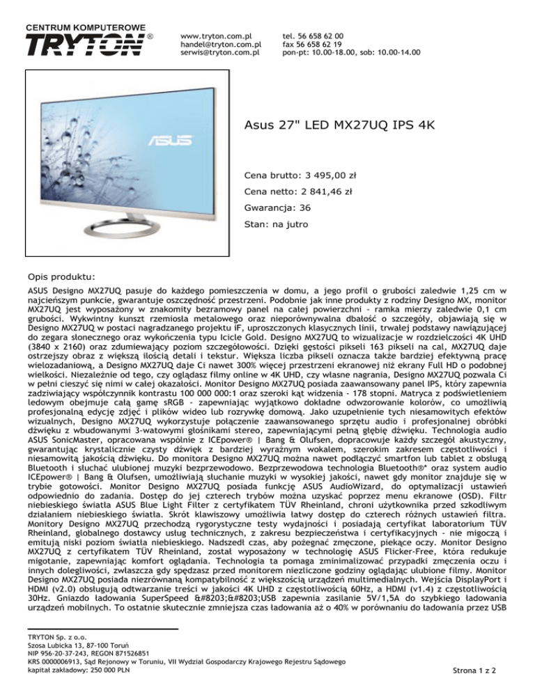 www.tryton.com.pl [email protected] [email protected] tel. 56 658 62 00 fax 56 658 62 19 pon-pt: 10.00-18.00, sob: 10.00-14.00 Asus 27" LED MX27UQ IPS 4K Cena brutto: 3 495,00 zł Cena netto: 2 841,46 zł Gwarancja: 36 Stan: na jutro Opis produktu: ASUS Designo MX27UQ pasuje do każdego pomieszczenia w domu, a jego profil o grubości zaledwie 1,25 cm w najcieńszym punkcie, gwarantuje oszczędność przestrzeni. Podobnie jak inne produkty z rodziny Designo MX, monitor MX27UQ jest wyposażony w znakomity bezramowy panel na całej powierzchni - ramka mierzy zaledwie 0,1 cm grubości. Wykwintny kunszt rzemiosła metalowego oraz nieporównywalna dbałość o szczegóły, objawiają się w Designo MX27UQ w postaci nagradzanego projektu iF, uproszczonych klasycznych linii, trwałej podstawy nawiązującej do zegara słonecznego oraz wykończenia typu Icicle Gold. Designo MX27UQ to wizualizacje w rozdzielczości 4K UHD (3840 x 2160) oraz zdumiewający poziom szczegółowości. Dzięki gęstości pikseli 163 pikseli na cal, MX27UQ daje ostrzejszy obraz z większą ilością detali i tekstur. Większa liczba pikseli oznacza także bardziej efektywną pracę wielozadaniową, a Designo MX27UQ daje Ci nawet 300% więcej przestrzeni ekranowej niż ekrany Full HD o podobnej wielkości. Niezależnie od tego, czy oglądasz filmy online w 4K UHD, czy własne nagrania, Designo MX27UQ pozwala Ci w pełni cieszyć się nimi w całej okazałości. Monitor Designo MX27UQ posiada zaawansowany panel IPS, który zapewnia zadziwiający współczynnik kontrastu 100 000 000:1 oraz szeroki kąt widzenia - 178 stopni. Matryca z podświetleniem ledowym obejmuje całą gamę sRGB - zapewniając wyjątkowo dokładne odwzorowanie kolorów, co umożliwią profesjonalną edycję zdjęć i plików wideo lub rozrywkę domową. Jako uzupełnienie tych niesamowitych efektów wizualnych, Designo MX27UQ wykorzystuje połączenie zaawansowanego sprzętu audio i profesjonalnej obróbki dźwięku z wbudowanymi 3-watowymi głośnikami stereo, zapewniającymi pełną głębię dźwięku. Technologia audio ASUS SonicMaster, opracowana wspólnie z ICEpower® | Bang & Olufsen, dopracowuje każdy szczegół akustyczny, gwarantując krystalicznie czysty dźwięk z bardziej wyraźnym wokalem, szerokim zakresem częstotliwości i niesamowitą jakością dźwięku. Do monitora Designo MX27UQ można nawet podłączyć smartfon lub tablet z obsługą Bluetooth i słuchać ulubionej muzyki bezprzewodowo. Bezprzewodowa technologia Bluetooth®* oraz system audio ICEpower® | Bang & Olufsen, umożliwiają słuchanie muzyki w wysokiej jakości, nawet gdy monitor znajduje się w trybie gotowości. Monitor Designo MX27UQ posiada funkcję ASUS AudioWizard, do optymalizacji ustawień odpowiednio do zadania. Dostęp do jej czterech trybów można uzyskać poprzez menu ekranowe (OSD). Filtr niebieskiego światła ASUS Blue Light Filter z certyfikatem TÜV Rheinland, chroni użytkownika przed szkodliwym działaniem niebieskiego światła. Skrót klawiszowy umożliwia łatwy dostęp do czterech różnych ustawień filtra. Monitory Designo MX27UQ przechodzą rygorystyczne testy wydajności i posiadają certyfikat laboratorium TÜV Rheinland, globalnego dostawcy usług technicznych, z zakresu bezpieczeństwa i certyfikacyjnych - nie migoczą i emitują niski poziom światła niebieskiego. Nadszedł czas, aby pożegnać zmęczone, piekące oczy. Monitor Designo MX27UQ z certyfikatem TÜV Rheinland, został wyposażony w technologię ASUS Flicker-Free, która redukuje migotanie, zapewniając komfort oglądania. Technologia ta pomaga zminimalizować przypadki zmęczenia oczu i innych dolegliwości, zwłaszcza gdy spędzasz przed monitorem niezliczone godziny oglądając ulubione filmy. Monitor Designo MX27UQ posiada niezrównaną kompatybilność z większością urządzeń multimedialnych. Wejścia DisplayPort i HDMI (v2.0) obsługują odtwarzanie treści w jakości 4K UHD z częstotliwością 60Hz, a HDMI (v1.4) z częstotliwością 30Hz. Gniazdo ładowania SuperSpeed ​​USB zapewnia zasilanie 5V/1,5A do szybkiego ładowania urządzeń mobilnych. To ostatnie skutecznie zmniejsza czas ładowania aż o 40% w porównaniu do ładowania przez USB TRYTON Sp. z o.o. Szosa Lubicka 13, 87-100 Toruń NIP 956-20-37-243, REGON 871526851 KRS 0000006913, Sąd Rejonowy w Toruniu, VII Wydział Gospodarczy Krajowego Rejestru Sądowego kapitał zakładowy: 250 000 PLN Strona 1 z 2 www.tryton.com.pl [email protected] [email protected] tel. 56 658 62 00 fax 56 658 62 19 pon-pt: 10.00-18.00, sob: 10.00-14.00 3.0. Gniazdo ładowania USB działa tylko jako ładowarka akumulatora, nie obsługuje transmisji danych. Parametry: Przekątna ekranu (cal ) Technologia podświetlania Format ekranu monitora Zalecana rozdzielczość obrazu (pikseli) Czas reakcji matrycy (ms) Typ panela LCD Kąt widzenia poziom Kąt widzenia pion Kontrast Liczba wyświetlanych kolorów Głośniki Mikrofon Kolor Analogowe złącze D-Sub 15-pin Cyfrowe złącze DVI Złącze HDMI Złącze DisplayPort Panel obrotowy (pivot) Tuner TV Wbudowana kamera internetowa Hub USB 27 LED Panoramiczny 3840x2160 5 AH-IPS 178 178 100000000:1 1,07 mld Tak Nie złoto-czarny Nie brak Tak - dwa Tak Nie Nie Nie Nie Mimo dołożenia wszelkich starań nie gwarantujemy, że publikowane dane techniczne nie zawierają uchybień lub błędów. W przypadku jakichkolwiek wątpliwości prosimy przed podjęciem decyzji o kontakt z handlowcem. Przedstawiona oferta cenowa ma charakter informacyjny, nie stanowi oferty handlowej w rozumieniu Art.66 par.1 Kodeksu Cywilnego oraz innych właściwych przepisów prawnych. TRYTON Sp. z o.o. Szosa Lubicka 13, 87-100 Toruń NIP 956-20-37-243, REGON 871526851 KRS 0000006913, Sąd Rejonowy w Toruniu, VII Wydział Gospodarczy Krajowego Rejestru Sądowego kapitał zakładowy: 250 000 PLN Strona 2 z 2
