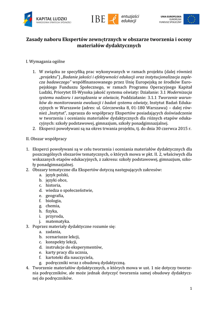 Zasady naboru Ekspertów zewnętrznych w obszarze tworzenia i oceny materiałów dydaktycznych I. Wymagania ogólne 1. W związku ze specyfiką prac wykonywanych w ramach projektu (dalej również „projektu”) „Badanie jakości i efektywności edukacji oraz instytucjonalizacja zaplecza badawczego” współfinansowanego przez Unię Europejską ze środków Europejskiego Funduszu Społecznego, w ramach Programu Operacyjnego Kapitał Ludzki, Priorytet III-Wysoka jakość systemu oświaty: Działanie: 3.1 Modernizacja systemu nadzoru i zarządzania w oświacie, Poddziałanie: 3.1.1 Tworzenie warunków do monitorowania ewaluacji i badań systemu oświaty, Instytut Badań Edukacyjnych w Warszawie (adres: ul. Górczewska 8, 01-180 Warszawa) – dalej również „Instytut”, zaprasza do współpracy Ekspertów posiadających doświadczenie w tworzeniu i ocenianiu materiałów dydaktycznych dla różnych etapów edukacyjnych: szkoły podstawowej, gimnazjum, szkoły ponadgimnazjalnej. 2. Eksperci powoływani są na okres trwania projektu, tj. do dnia 30 czerwca 2015 r. II. Obszar współpracy 1. Eksperci powoływani są w celu tworzenia i oceniania materiałów dydaktycznych dla poszczególnych obszarów tematycznych, o których mowa w pkt. II. 2, właściwych dla wskazanych etapów edukacyjnych, z zakresu: szkoły podstawowej, gimnazjum, szkoły ponadgimnazjalnej. 2. Obszary tematyczne dla Ekspertów dotyczą następujących zakresów: a. język polski, b. języki obce, c. historia, d. wiedza o społeczeństwie, e. geografia, f. biologia, g. chemia, h. fizyka, i. przyroda, j. matematyka. 3. Poprzez materiały dydaktyczne rozumie się: a. zadania, b. scenariusze lekcji, c. konspekty lekcji, d. instrukcje do eksperymentów, e. karty pracy dla ucznia, f. kartoteki dla nauczyciela, g. podręczniki wraz z obudową dydaktyczną. 4. Tworzenie materiałów dydaktycznych, o których mowa w ust. 1 nie dotyczy tworzenia podręczników, ale może jednak dotyczyć tworzenia samej obudowy dydaktycznej do podręczników. 1 5. Poprzez ocenianie materiałów dydaktycznych rozumie się dokonanie przez Eksperta analizy wskazanych materiałów dydaktycznych pod kątem zgodności tychże materiałów z wytycznymi określonymi przez Instytut, w szczególności jednak pod kątem zgodności tychże materiałów z obowiązującą podstawą programową. 6. Przy wykonywaniu zleconych zadań Eksperci kierują się obok wytycznych Instytutu własną wiedzą i doświadczeniem oraz intuicją naukową. 7. W szczególności do obowiązków Eksperta należy: a) opracowanie zadań dla odpowiednich etapów edukacyjnych zgodnie z następującymi wymogami dotyczącymi ich budowy i treści: i. schemat zadania powinien wyglądać następująco: 1. wprowadzenie do zadania, w zależności od dziedziny, 2. treść zadania, 3. klucz kodowy odpowiedzi do zadania. ii. klucz kodowy jest integralną częścią zadania, iii. każde z zadań powinno być odniesione do aktualnej podstawy programowej, iv. zadanie powinno zostać przekazane w odpowiedniej formie graficznej, umożliwiającej wykorzystanie w publikacjach (strona www, książki dla nauczyli) bądź testach. Jeśli to zasadne, zadanie powinno zawierać niezbędne wykresy, rysunki, diagramy, animacje itp., do których prawa autorskie mogą być następnie bez żadnych ograniczeń przeniesione na Instytut w ramach umowy łączącej Instytut z Ekspertem, b) uczestnictwo w warsztatach i spotkaniach w terminie i miejscu wskazanym przez Instytut. 8. Eksperci, z którymi zostaną podpisane umowy mogą realizować zlecenia dotyczące pojedynczych materiałów dydaktycznych, o których mowa w pkt. II.3. III. Wymagania szczegółowe dotyczące Kandydatów na Ekspertów 1. Kryterium obligatoryjne: a. posiadanie tytułu zawodowego magistra (lub tytułu równorzędnego) lub posiadanie stopnia naukowego lub tytułu naukowego w zakresach odpowiadających obszarom tematycznym (por. pkt. II.2), w ramach których Ekspert będzie realizował zlecone czynności. 2. Kryteria pożądane: a. doświadczenie w tworzeniu zadań dla szkół podstawowych, gimnazjalnych oraz ponadgimnazjalnych. b. doświadczenie w pracy w charakterze nauczyciela lub nauczyciela akademickiego. c. udział w prowadzeniu kursów dydaktycznych lub uczestnictwo w takich kursach. d. doświadczenie w pracy naukowej w obszarze tematycznym, w ramach którego Ekspert składa Wniosek Kandydata na Eksperta, stanowiący załącznik nr 1 do niniejszych zasad naboru – dalej również „Wniosek”. e. zdobycie nagrody/wyróżnienia w konkursie na: i. układanie zadań. ii. opracowanie innych materiałów dydaktycznych. 3. Do postępowania konkursowego zostaną zakwalifikowani Kandydaci, którzy spełniają kryterium obligatoryjne. 2 4. Na listę Ekspertów zostaną wpisani Kandydaci, którzy spełniają kryterium obligatoryjne i przynajmniej jedno kryterium pożądane. 5. Szczegółowe wymagania dotyczące dokumentów wymaganych przez Instytut jako potwierdzenie spełniania kryteriów pożądanych zostały opisane w formularzu Wniosku. IV. Zasady prowadzenia naboru 1. Ogłoszenie o naborze na Ekspertów umieszczane jest na stronie internetowej www.ibe.edu.pl. 2. Konkurs trwa od 28.06.2011 r. do 31.12.2014 r. Instytut Badań Edukacyjnych zastrzega sobie możliwość skrócenia terminu naboru z dwutygodniowym wyprzedzeniem. 3. Zgłoszenie Kandydata na Eksperta, czyli prawidłowo wypełniony i podpisany Wniosek wraz z załącznikami, należy złożyć w siedzibie Instytutu lub przesłać na adres Instytutu. Wnioski, wraz z załączonymi skanami wymaganych dokumentów, mogą być również przesłane za pośrednictwem poczty elektronicznej na adres: [email protected]. 4. Zgłoszenia Kandydatów na Ekspertów przyjmowane są przez cały okres trwania konkursu. 5. Wysłanie zgłoszenia przez Kandydata na Eksperta jest równoznaczne z wyrażeniem zgodny na: a. udział w niniejszym konkursie na warunkach w nim określonych, w celu uzyskania wpi