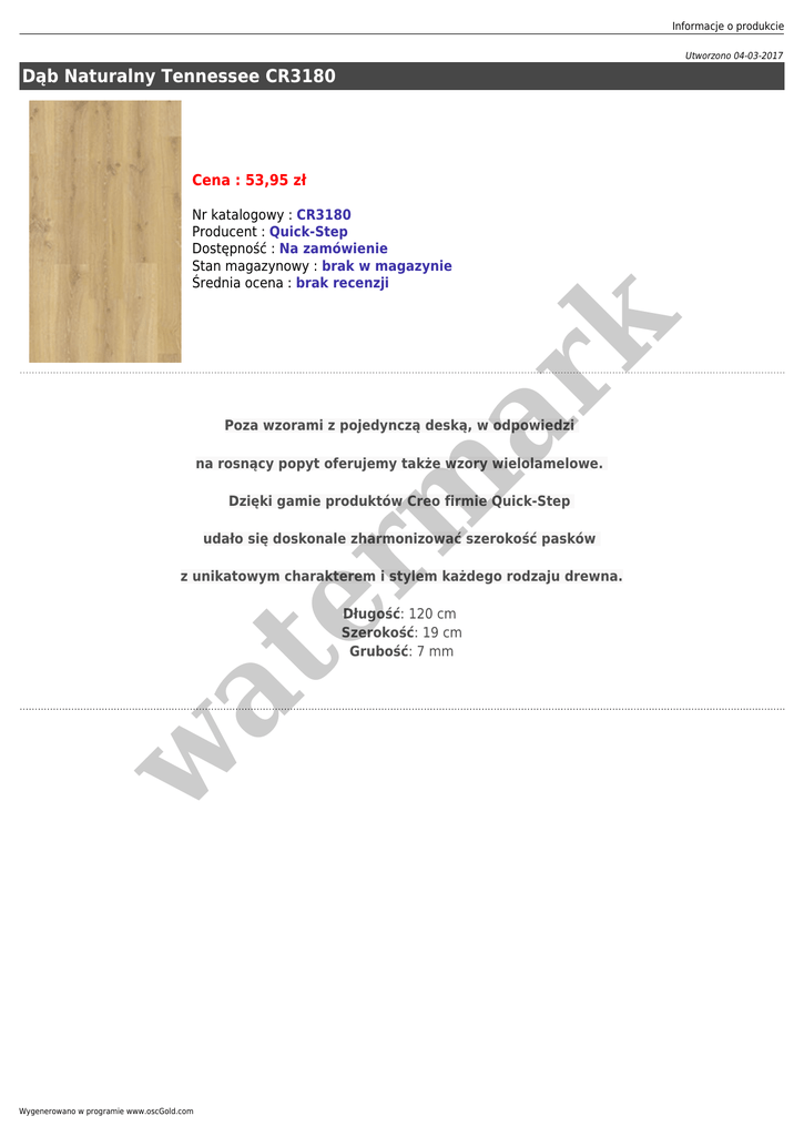 Informacje o produkcie Utworzono 04-03-2017 Dąb Naturalny Tennessee CR3180 Cena : 53,95 zł er m ar k Nr katalogowy : CR3180 Producent : Quick-Step Dostępność : Na zamówienie Stan magazynowy : brak w magazynie Średnia ocena : brak recenzji Poza wzorami z pojedynczą deską, w odpowiedzi na rosnący popyt oferujemy także wzory wielolamelowe. Dzięki gamie produktów Creo firmie Quick-Step udało się doskonale zharmonizować szerokość pasków w at z unikatowym charakterem i stylem każdego rodzaju drewna. Wygenerowano w programie www.oscGold.com Długość: 120 cm Szerokość: 19 cm Grubość: 7 mm