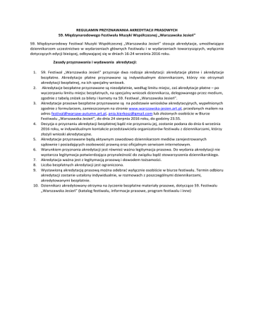 REGULAMIN PRZYZNAWANIA AKREDYTACJI PRASOWYCH 59. Międzynarodowego Festiwalu Muzyki Współczesnej „Warszawska Jesień” 59. Międzynarodowy Festiwal Muzyki Współczesnej „Warszawska Jesień” stosuje akredytacje, umożliwiające dziennikarzom uczestnictwo w wydarzeniach głównych Festiwalu i w wydarzeniach towarzyszących, wyłącznie dotyczących edycji bieżącej, odbywającej się w dniach 16-24 września 2016 roku. Zasady przyznawania i wydawania akredytacji: 1. 59. Festiwal „Warszawska Jesień” przyznaje dwa rodzaje akredytacji: akredytacje płatne i akredytacje bezpłatne. Akredytacje płatne przyznawane są indywidualnym dziennikarzom, którzy nie otrzymali akredytacji bezpłatnej, na ich specjalny wniosek. 2. Akredytacje bezpłatne przyznawane są nieodpłatnie, według limitu miejsc, zaś akredytacje płatne – po wyczerpaniu limitu miejsc bezpłatnych, na specjalny wniosek dziennikarza, delegowanego przez medium, zgodnie z tabelą zniżek za bilety i karnety na 59. Festiwal „Warszawska Jesień”. 3. Akredytacje prasowe bezpłatne przyznawane są na podstawie wniosków akredytacyjnych, wypełnionych zgodnie z formularzem, zamieszczonym na stronie www.warszawska-jesien.art.pl, przesłanych mailem na adres [email protected], [email protected] lub złożonych osobiście w Biurze Festiwalu „Warszawska Jesień”, do dnia 24 sierpnia 2016 roku, do godziny 23.55. 4. Decyzja o przyznaniu akredytacji bezpłatnej bądź nie przyznaniu jej, zostanie podana do dnia 6 września 2016 roku, w indywidualnym kontakcie przedstawiciela organizatorów festiwalu z dziennikarzami, którzy złożyli wnioski akredytacyjne. 5. Akredytacje przyznawane będą aktywnym zawodowo dziennikarzom mediów zarejestrowanych sądownie i posiadających osobowość prawną oraz oficjalnym serwisom internetowym. 6. Warunkiem przyznania akredytacji jest również ważna legitymacja prasowa. Do wydania akredytacji nie wystarcza legitymacja potwierdzająca przynależność do związku bądź stowarzyszenia dziennikarskiego. 7. Akredytacja ważna jest z legitymacją prasową i dowodem tożsamości. 8. Liczba bezpłatnych akredytacji jest ograniczona. 9. Wystawioną akredytację prasową można odebrać wyłącznie osobiście w biurze festiwalu. Termin odbioru akredytacji zostanie ustalony indywidualnie, w rozmowach z poszczególnymi dziennikarzami, akredytowanymi bezpłatnie. 10. Dziennikarz akredytowany otrzyma na życzenie bezpłatne materiały prasowe, dotyczące 59. Festiwalu „Warszawska Jesień” (katalog festiwalu, informacje prasowe, program festiwalu i inne)