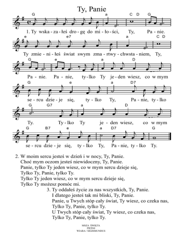 Ty, Panie # c j j j j j j jœ a & œ œ œ œ œ œ œ J œ ˙. G C w 1. Ty wska - za - łeś dro - gę do mi - ło - ści, #j j j j j & œ œ œ œ œ e e7 j œ j œ Ty, D G œ œ ˙. Pa - nie. a œ J C D œ ˙. w Ty zmie - ni - łeś świat swym zma - rtwy - chwsta - niem, Ty, # Gœ œ ˙. & & # a D j j j j œ œ œ. ‰ œ œ œ œ œ œ e Pa - nie. Pa - nie, j e œ œ J œ œ œ J J ty-lko Ty je - den wiesz, co w mym j j œ œ G se - rcu dzie - je się, # ˙. G & G7 Ty. # & œJ œJ Jœ G B7 j œj œ œ ty - lko a Ty - lko j œ œ e se - rcu dzie - je się, j œj œ Ty j œ Jœ ty - lko j j œ œ œj œ J a D7 ˙ Ty, j j œ œ œ Pa - nie, ty - lko D je - den wiesz, a ˙ Ty, D7 œ J j œ j œ co w mym j j j G œ œ œ w Pa - nie, ty - lko Ty. 2. W moim sercu jesteś w dzień i w nocy, Ty, Panie. Choć mym oczom jesteś niewidoczny, Ty, Panie. Panie, tylko Ty jeden wiesz, co w mym sercu dzieje się, Tylko Ty, Panie, tylko Ty. Tylko Ty jeden wiesz, co w mym sercu dzieje się, Tylko Ty możesz pomóc mi. 3. Ty oddałeś życie za nas wszystkich, Ty, Panie. I dlatego jesteś tak mi bliski, Ty, Panie. Panie, u Twych stóp cały świat, Ty wiesz, co czeka nas, Tylko Ty, Panie, tylko Ty. U Twych stóp cały świat, Ty wiesz, co czeka nas, Tylko Ty, Panie, tylko Ty. MSZA ŚWIĘTA PIEŚNI WIARA / SIGISMUNDUS