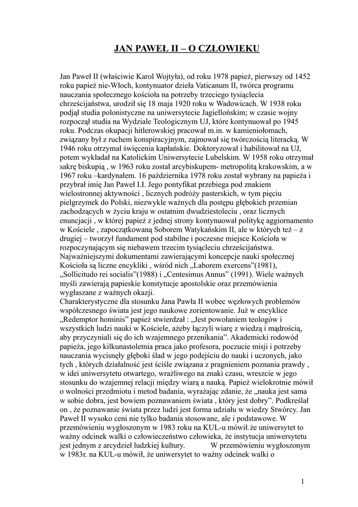 JAN PAWEŁ II – O CZŁOWIEKU Jan Paweł II (właściwie Karol Wojtyła), od roku 1978 papież, pierwszy od 1452 roku papież nie-Włoch, kontynuator dzieła Vaticanum II, twórca programu nauczania społecznego kościoła na potrzeby trzeciego tysiąclecia chrześcijaństwa, urodził się 18 maja 1920 roku w Wadowicach. W 1938 roku podjął studia polonistyczne na uniwersytecie Jagiellońskim; w czasie wojny rozpoczął studia na Wydziale Teologicznym UJ, które kontynuował po 1945 roku. Podczas okupacji hitlerowskiej pracował m.in. w kamieniołomach, związany był z ruchem konspiracyjnym, zajmował się twórczością literacką. W 1946 roku otrzymał święcenia kapłańskie. Doktoryzował i habilitował na UJ, potem wykładał na Katolickim Uniwersytecie Lubelskim. W 1958 roku otrzymał sakrę biskupią , w 1963 roku został arcybiskupem- metropolitą krakowskim, a w 1967 roku –kardynałem. 16 października 1978 roku został wybrany na papieża i przybrał imię Jan Paweł I.I. Jego pontyfikat przebiega pod znakiem wielostronnej aktywności , licznych podróży pasterskich, w tym pięciu pielgrzymek do Polski, niezwykle ważnych dla postępu głębokich przemian zachodzących w życiu kraju w ostatnim dwudziestoleciu , oraz licznych enuncjacji , w której papież z jednej strony kontynuował politykę aggiornamento w Kościele , zapoczątkowaną Soborem Watykańskim II, ale w których też – z drugiej – tworzył fundament pod stabilne i poczesne miejsce Kościoła w rozpoczynającym się niebawem trzecim tysiącleciu chrześcijaństwa. Najważniejszymi dokumentami zawierającymi koncepcje nauki społecznej Kościoła są liczne encykliki , wśród nich „Laborem exercens”(1981), „Sollicitudo rei socialis”(1988) i „Centesimus Annus” (1991). Wiele ważnych myśli zawierają papieskie konstytucje apostolskie oraz przemówienia wygłaszane z ważnych okazji. Charakterystyczne dla stosunku Jana Pawła II wobec węzłowych problemów współczesnego świata jest jego naukowe zorientowanie. Już w encyklice „Redemptor hominis” papież stwierdzał : „Jest powołaniem teologów i wszystkich ludzi nauki w Kościele, ażeby łączyli wiarę z wiedzą i mądrością, aby przyczyniali się do ich wzajemnego przenikania”. Akademicki rodowód papieża, jego kilkunastoletnia praca jako profesora, poczucie misji i potrzeby nauczania wycisnęły głęboki ślad w jego podejściu do nauki i uczonych, jako tych , których działalność jest ściśle związana z pragnieniem poznania prawdy , w idei uniwersytetu otwartego, wrażliwego na znaki czasu, wreszcie w jego stosunku do wzajemnej relacji między wiarą a nauką. Papież wielokrotnie mówił o wolności przedmiotu i metod badania, wyrażając zdanie, że „nauka jest sama w sobie dobra, jest bowiem poznawaniem świata , który jest dobry”. Podkreślał on , że poznawanie świata przez ludzi jest forma udziału w wiedzy Stwórcy. Jan Paweł II wysoko ceni nie tylko badania stosowane, ale i podstawowe. W przemówieniu wygłoszonym w 1983 roku na KUL-u mówił, że uniwersytet to ważny odcinek walki o człowieczeństwo człowieka, że instytucja uniwersytetu jest jednym z arcydzieł ludzkiej kultury. W przemówieniu wygłoszonym w 1983r. na KUL-u mówił, że uniwersytet to ważny odcinek walki o 1 człowieczeństwo człowieka, że instytucja uniwersytetu jest jednym z arcydzieł ludzkiej kultury. W encyklice Redemptor hominis zastanawiał się też nad tym, „czy ów postęp, którego autorem i sprawcą jest człowiek, czyni życie ludzkie na ziemi bardziej ludzkim, bardziej godnym człowieka?” nie wykluczał kolizji na styku wiary i nauki. Poddawał krytyce pozytywistyczną mentalność, spadek po filozofii oświecenia, ale jego krytyka była bardziej powściągliwa od tej, którą przeprowadzali poprzednicy. W trwającym dialogu wiary z ateizmem Jan Paweł II stanął na stanowisku, że „to prawda, iż człowiek nie może organizować spraw ziemskich bez Boga. Prawdą jest tylko, że bez Boga może on skierować je przeciw sobie”. Papież doprowadził do końca sprawę rehabilitacji Galileusza, podkreślając, że w przeszłości nie brakowało nieporozumień, rodzących niejeden bolesny konflikt trwający przez stulecia. Charakteryzując istotę magisterium społecznego Kościoła, papież konkludował w encyklice Centesimus Annus: „Kościół wypowiada się na temat określonych sytuacji ludzkich, indywidualnych i wspólnotowych, narodowych i międzynarodowych i formułuje w ten sposób swe nauczanie, prawdziwy corpus doktrynalny, który pozwala mu analizować zjawiska społeczne, wypowiadać się na ich temat i wskazywać kierunki właściwego rozwiązywania problemów, które z nich wynikają”. Jednym z takich problemów jest praca ludzka, o której Jan Paweł II wspominał wielokrotnie, najbardziej kompleksowo w encyklice Laborem exercens, wydanej w 1981 r. w dziewięćdziesiątą rocznicę ogłoszenia wielkiej karty ustroju społecznego, jaką była encyklika Rerum novarum. Praca-według papieżastanowi podstawowy wymiar ludzkiego bytowania, z którego człowiek czerpie właściwą sobie godność. „Kościół uważa za swoje zadanie stałe przypominanie o godności i prawach ludzi pracy oraz piętnowanie takich sytuacji, w których bywają one gwałcone, starając się przez to oddziaływać na bieg tych przemian, aby wraz z nimi dokonywał się prawdziwy postęp człowieka i społeczeństwa”. Praca jako problem człowieka stanowi kwintesencję kwestii społecznej i musi być obiektem szczególnej uwagi w nauczaniu Kościoła, bo jest wyrazem jego apostolskiego posłannictwa. Tak jest jednak tylko wówczas, gdy celem będzie dobro człowieka. Znaczenie pracy-pisał papież- podkreśla wiele nauk o człowieku: antropologia, paleontologia, historia, socjologia i psychologia; to przeświadczenie rozumu jest w nauce społecznej Kościoła, dodatkowo wspierane przez przekonanie wiary. Dzięki prac