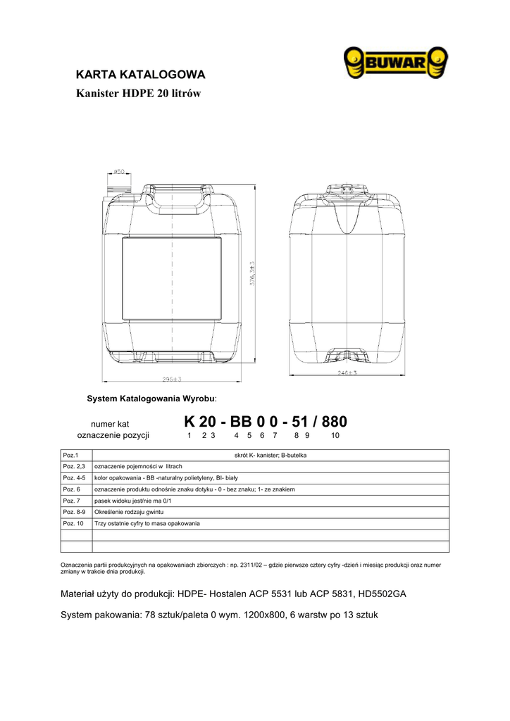 KARTA KATALOGOWA Kanister HDPE 20 litrów System Katalogowania Wyrobu: numer kat oznaczenie pozycji K 20 - BB 0 0 - 51 / 880 1 Poz.1 2 3 4 5 6 7 8 9 10 skrót K- kanister; B-butelka Poz. 2,3 oznaczenie pojemności w litrach Poz. 4-5 kolor opakowania - BB -naturalny polietyleny, BI- biały Poz. 6 oznaczenie produktu odnośnie znaku dotyku - 0 - bez znaku; 1- ze znakiem Poz. 7 pasek widoku jest/nie ma 0/1 Poz. 8-9 Określenie rodzaju gwintu Poz. 10 Trzy ostatnie cyfry to masa opakowania Oznaczenia partii produkcyjnych na opakowaniach zbiorczych : np. 2311/02 – gdzie pierwsze cztery cyfry -dzień i miesiąc produkcji oraz numer zmiany w trakcie dnia produkcji. Materiał użyty do produkcji: HDPE- Hostalen ACP 5531 lub ACP 5831, HD5502GA System pakowania: 78 sztuk/paleta 0 wym. 1200x800, 6 warstw po 13 sztuk Wygląd zewnętrzny Powierzchnia opakowania powinna być gładka, bez pęknięć, wgłębień, szczelin, dziur, słabych miejsc, zadziorów, wykrzywień, zanieczyszczeń, zniekształceń. Przechowywanie Kanistry należy przechowywać w magazynach krytych w odległości nie mniejszej niż 1 m od czynnych urządzeń grzejnych w temperaturze do 40oC. Należy unikać długotrwałego wystawiania na bezpośrednie działanie promieni UV Pakowanie Kanistry są pakowane na palecie o wymiarach 1200x800 , zabezpieczone folią strech i przekładkami tekturowymi. Ostatnia warstwa – zapakowana w worek foliowy. Każda paleta zaopatrzona jest w przywieszkę produkcyjną zawierającą nazwę produktu, datę produkcji i ilość sztuk. Kanistry po zalaniu winny być układane na paletach o jak najpełniejszym deskowaniu, co pozwala na prawidłowe podparcie kanistra wszystkimi jego punktami stycznymi z podłożem i zapewnia równomierny rozkład obciążenia siłami statycznymi i dynamicznymi. W innym przypadku dochodzić może do nadmiernego obciążenia jednej ze stron kanistra lub jednego z rogów i przeciążenie jednej ze stron palety. Jeśli to możliwe wszystkie narożne kanistry po zalaniu winny być skierowane gwintami do rogów palety, (ze względu na asymetrię kształtu) co pozwala na lepsze stretchowanie palety jako całości. Natomiast kanistry wewnątrz warstwy mogą być ułożone dowolnie, ponieważ sposób ich ułożenia nie wpływa na sztywność/stabilność palety. Maksymalna wysokość składowania kanistrów po zalaniu pozostaje do oceny nalewającego z uwzględnieniem następujących czynników: – gęstość konfekcjonowanej cieczy – temperatury cieczy oraz temperatury otoczenia – warunków składowania po zalaniu, paleta, jej deskowanie, stosowane przekładki itp., – warunków transportu po zalania (odległość, rodzaj i sposób transportu) oraz powstające w transporcie siły dynamiczne i statyczne oraz pozostałych nie wymienionych czynników. Niepoprawna ocena sposobu pakowania po zalaniu, skutkować może uszkodzeniem kanistra i jego rozszczelnieniem. W odniesieniu do opakowań posiadających atest UN Y stosuje się przepisy dyrektywy UE obowiązującej dla opakowań z atestem UN (wycinek dotyczący badania na piętrzenie) 6.1.5.6.2 Metoda badania: badane opakowanie powinno być naciskane na górną powierzchnię z siłą równoważną całkowitej masie takich samych sztuk przesyłki, które mogą być piętrzone podczas przewozu; jeżeli badane opakowanie zawiera materiał ciekły nie niebezpieczny o gęstości względnej różnej od materiału ciekłego, który ma być przewożony, to nacisk powinien być obliczony odpowiednio do materiału przeznaczonego do przewozu. Minimalna wysokość piętrzenia, włącznie z opakowaniem badanym, powinna wynosić 3 metry. Czas trwania badania powinien wynosić 24 godziny, z wyjątkiem bębnów i kanistrów z tworzywa sztucznego oraz opakowań złożonych 6HH1 i 6HH2 przeznaczonych do materiałów ciekłych, dla których czas badania powinien wynosić 28 dni, w temperaturze nie niższej niż 40°C. W badaniu przeprowadzanym zgodnie z 6.1.5.2.5 do napełniania opakowań powinny być stosowane materiały przewidziane do przewozu. W badaniu przeprowadzanym zgodnie z 6.1.5.2.6, badanie wytrzymałości na nacisk przy piętrzeniu powinno być przeprowadzone przy zastosowaniu cieczy wzorcowej. 6.1.5.6.3 Kryterium pozytywnego przejścia badania: nie wystąpienie uwolnienia materiału z opakowania. W przypadku opakowań złożonych lub kombinowanych materiał zawarty w naczyniu wewnętrznym lub w opakowaniu wewnętrznym nie może wydostawać się na zewnątrz. Żadne z badanych opakowań nie powinno wykazywać jakiegokolwiek pogorszenia jakości mogącego wpływać na bezpieczeństwo przewozu, ani jakiegokolwiek odkształcenia mogącego zmniejszyć jego wytrzymałość lub spowodować utratę stabilności stosu przesyłki. Opakowania z tworzywa sztucznego, przed dokonaniem oceny, powinny być ochłodzone do temperatury otoczenia. Odpowiedzialność producenta ograniczona jest do produktu wadliwego i nie obejmuje następstw powstałych w wyniku wadliwego posługiwania się produktem i postępowania niezgodnie z zaleceniami producenta. Składowanie Palety z wyrobami składuje się tak by zachowana była stabilność ładunku i jednorodność partii. Transport Spakowane kanistry należy przewozić środkami transportu w sposób zabezpieczający przed zabrudzeniem lub uszkodzeniem. Data Powstania 26.11.2006r. Data emisji 01.06.2008r. ………………………………………………………………………………………………………………………. . BUWAR Sp. z o.o. Tel. 076/866-06-71 ul. Nowodworska 41 Fax. 076/852-55-94 59-220 Legnica Email: [email protected] www.buwaropakowania.pl