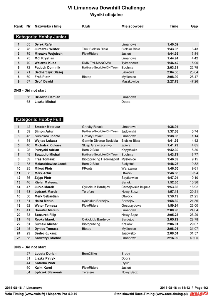VI Limanowa Downhill Challenge Wyniki oficjalne Rank Nr Nazwisko i Imię Klub Miejscowość Time Gap 1:40.52 1:43.95 1:44.36 1:44.94 1:46.42 2:03.31 2:04.36 2:08.99 2:27.78 3.43 3.84 4.42 5.90 22.79 23.84 28.47 47.26 1:36.94 1:37.68 1:38.08 1:41.36 1:41.79 1:42.30 1:43.71 1:46.09 1:46.26 1:46.55 1:46.88 1:47.04 1:52.30 1:53.86 1:57.15 1:58.19 1:58.30 1:59.94 2:00.98 2:05.23 2:05.72 2:06.01 2:08.01 2:08.51 2:16.99 0.74 1.14 4.42 4.85 5.36 6.77 9.15 9.32 9.61 9.94 10.10 15.36 16.92 20.21 21.25 21.36 23.00 24.04 28.29 28.78 29.07 31.07 31.57 40.05 Kategoria: Hobby Junior 1 2 3 4 5 6 7 8 9 65 78 79 75 70 72 71 69 67 Dyrek Rafał Juraszek Wiktor Mleczko Wojciech Mól Krystian Walczak Kuba Paduch Dominik Bednarczyk Błażej Fraś Piotr Groń Dawid Limanowa Trek Bielsko Biała Bielsko Biała FlowRiders Jasień Limanowa RMK TYLMANOWA Tylmanowa Bartbass-Goodbike DH Team Bochnia Laskowa Biotop Myślenice Maszkowice DNS - Did not start 66 68 Dziedzic Damian Liszka Michał Limanowa Dobra Kategoria: Hobby Full 1 2 3 4 5 6 7 8 9 10 11 12 13 14 15 16 17 18 19 20 21 22 23 24 25 42 59 43 34 40 28 49 39 53 25 38 36 46 47 63 50 51 62 41 33 48 61 45 29 58 Smoter Mateusz Simon Artur Sułkowski Karol Wojtas Łukasz Michalski Łukasz Purzycki Adrian Szczudło Michał Fraś Tomasz Małaszkiewicz Jacek Mikoś Piotr Merk Artur Zając Piotr Kielar Mateusz Jurko Marek Jędrzek Marek Merk Sebastian Halza Matus Wątor Tomasz Domiter Marcin Szczurek Filip Repka Marek Sumski Michał Dyniec Tomasz Szelec Łukasz Szewczyk Michał Gravity Revolt Limanowa Jadowniki Gravity Revolt Limanowa Garmin Diverse Beskidia Bielsko Biała Sklep Grawitacyjnypl Zgierz Born 2 Bike Kopytówka Bartbass-Goodbike DH Team Bochnia Biotopracing Hadronsport Myślenice Born 2 Bike Białystok FRoots Warszawa Otwock Spytkowice Sanok Cykloklub Bardejov Bardejovske Kupele Terefere Nowy Sącz Otwock cykloklub Bardejov Bardejov FlowRiders Gosprzydowa Limanowa Nowy Sącz Cykloklub Bardejov Bardejov Biotopracing Kraków Biotop Myślenice Jazowsko Limanowa Bartbass-Goodbike DH Team DNS - Did not start 27 31 44 60 64 Łopata Dorian Liszka Patryk Kotarba Piotr Kaim Karol Jędrzek Sławomir 2015-08-16 / Limanowa Vola Timing (www.vola.fr) / Msports Pro 4.0.19 Born2Bike FlowRiders Terefere Brody Dobra Rytro Jasień Nowy Sącz 2015-08-16 at 14:13 / Page 1/2 VolaSoftControlPdf Stanisławski Race-Timing (www.race-timing.pl) VI Limanowa Downhill Challenge Wyniki oficjalne Rank Nr Nazwisko i Imię Klub Miejscowość Bartbass-Goodbike DH Team Bochnia Gravity Revolt Biotop Zakopane Zawiercie Pcim Garmin Diverse Beskidia Bielsko-Biala Time Gap 2:16.28 2:43.93 6:45.84 27.65 4:29.56 1:44.30 1:47.10 1:49.78 1:54.37 2:03.35 2:20.89 2:33.92 2.80 5.48 10.07 19.05 36.59 49.62 1:34.10 1:34.49 1:35.96 1:37.15 1:37.92 1:43.16 1:44.36 2:00.93 0.39 1.86 3.05 3.82 9.06 10.26 26.83 DNF - Do not finish 57 Rajzer Łukasz Kategoria: Kobiety 1 2 3 22 24 26 Kurek Hanna Darska Katarzyna Mrozicka Wiktoria Twomark Specialized Team DNF - Do not finish 20 Wojtas Laura Kategoria: Masters 1 2 3 4 5 6 7 19 15 110 18 16 13 12 Klimczuk Rafał Gruszczyński Adam Smoleń Daniel Zaczyński Karol Sobiesiak Rafał Cichoń Dominik Klęsk Tomasz Warszawa Kraków Męcina Limanowa Warszawa Gdów Kobyles dobrerowery pl DNS - Did not start 14 17 Kołodziej Artur Kurek Robert Gravity Revolt Kasina Wielka Zakopane DNF - Do not finish 109 Kutaj Tomasz Bochnia Kategoria: Pro 1 2 3 4 5 6 7 8 10 5 11 8 4 9 1 2 Wincenciak Grzegorz Gaik Piotr Wincenciak Mikołaj Porochniak Konrad Konstanty Damian Rudzewicz Mateusz Turek Dominik Bajor Wojciech 2015-08-16 / Limanowa Vola Timing (www.vola.fr) / Msports Pro 4.0.19 Biotop Gravity Revolt Biotop Top Team Biker House Myślenice Słopnice Myślenice Krakow Bartbass-Goodbike DH Team Nowy Sącz RMK Tylmanowa Tylmanowa Bartbass-Goodbike DH Team Bochnia Krzywaczka 2015-08-16 at 14:13 / Page 2/2 VolaSoftControlPdf Stanisławski Race-Timing (www.race-timing.pl)