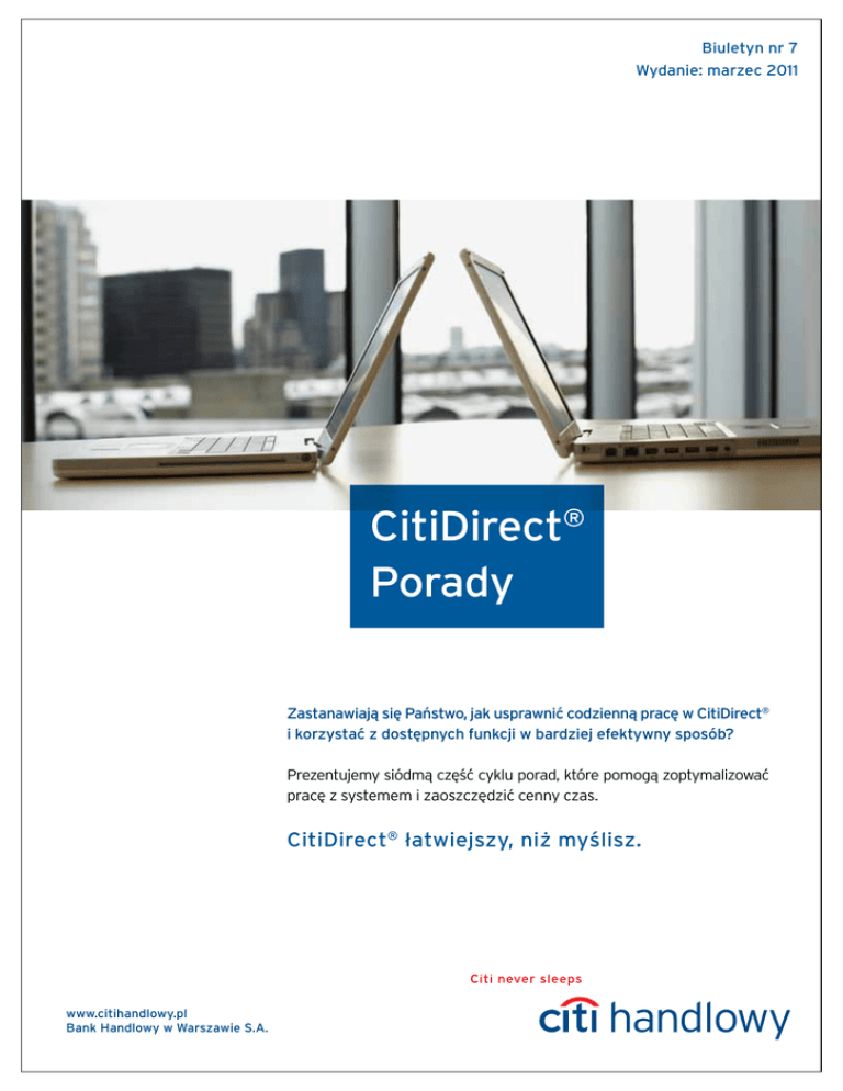 Biuletyn nr 7 Wydanie: marzec 2011 CitiDirect® Porady Zastanawiają się Państwo, jak usprawnić codzienną pracę w CitiDirect® i korzystać z dostępnych funkcji w bardziej efektywny sposób? Prezentujemy siódmą część cyklu porad, które pomogą zoptymalizować pracę z systemem i zaoszczędzić cenny czas. CitiDirect® łatwiejszy, niż myślisz. www.citihandlowy.pl Bank Handlowy w Warszawie S.A. Przyspiesz CitiDirect nawet o 100% Domyślnie Java Sun może wykorzystać jedynie 32 MB pamięci operacyjnej. Poniższa instrukcja pozwala zwiększyć tę ilość, co w większości przypadków przekłada się na znaczne, nawet dwukrotne, zwiększenie szybkości działania aplikacji: Wejdź do Panelu Sterowania i klikając na ikonę Java otwórz Java Control Panel: Klikając View otwórz okno ustawień, następnie w kolumnie Runtime Parameters wstaw: -Xms64m –Xmx256m Potwierdź OK. Skorzystaj z Akademii Klienta CitiDirect! www.citihandlowy.pl/akademiaklienta Biuro Wdrożeń i Obsługi Systemów Elektronicznych Citi Handlowy Bank Handlowy w Warszawie S.A. ul. Goleszowska 6 01-249 Warszawa tel. +48 22 690 15 21, 801 343 978 faks +48 22 692 99 44 [email protected] Citi Handlowy oraz Citi never sleeps są zastrzeżonymi znakami towarowymi należącymi do podmiotów z grupy Citigroup Inc. Niniejszy materiał reklamowy został wydany jedynie w celach informacyjnych i nie stanowi oferty w rozumieniu art. 66 Kodeksu Cywilnego. Bank Handlowy w Warszawie S.A. z siedzibą w Warszawie, ul. Senatorska 16, 00-923 Warszawa, zarejestrowany w rejestrze przedsiębiorców Krajowego Rejestru Sądowego przez Sąd Rejonowy dla m.st. Warszawy w Warszawie, XII Wydział Gospodarczy Krajowego Rejestru Sądowego, pod nr KRS 000 000 1538; NIP 526-030-02-91; wysokość kapitału zakładowego wynosi 522.638.400 złotych, kapitał został w pełni opłacony.