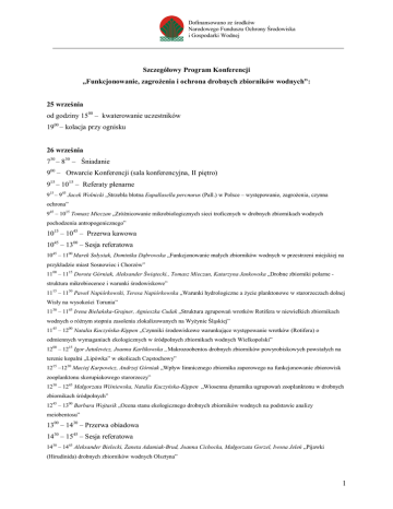 Dofinansowano ze środków Narodowego Funduszu Ochrony Środowiska i Gospodarki Wodnej Szczegółowy Program Konferencji „Funkcjonowanie, zagrożenia i ochrona drobnych zbiorników wodnych”: 25 września od godziny 1500 – kwaterowanie uczestników 1900 – kolacja przy ognisku 26 września 730 – 830 – Śniadanie 900 – Otwarcie Konferencji (sala konferencyjna, II piętro) 915 – 1015 – Referaty plenarne 915 – 945 Jacek Wolnicki „Strzebla błotna Eupallasella percnurus (Pall.) w Polsce – występowanie, zagrożenia, czynna ochrona” 945 – 1015 Tomasz Mieczan „Zróżnicowanie mikrobiologicznych sieci troficznych w drobnych zbiornikach wodnych pochodzenia antropogenicznego” 1015 – 1045 – Przerwa kawowa 1045 – 1300 – Sesja referatowa 1045 – 1100 Marek Sołysiak, Dominika Dąbrowska „Funkcjonowanie małych zbiorników wodnych w przestrzeni miejskiej na przykładzie miast Sosnowiec i Chorzów” 1100 – 1115 Dorota Górniak, Aleksander Świątecki., Tomasz Mieczan, Katarzyna Jankowska „Drobne zbiorniki polarne struktura mikrobiocenoz i warunki środowiskowe” 1115 – 1130 Paweł Napiórkowski, Teresa Napiórkowska „Warunki hydrologiczne a życie planktonowe w starorzeczach dolnej Wisły na wysokości Torunia” 1130 – 1145 Irena Bielańska-Grajner, Agnieszka Cudak „Struktura zgrupowań wrotków Rotifera w niewielkich zbiornikach wodnych o różnym stopniu zasolenia zlokalizowanych na Wyżynie Śląskiej” 1145 – 1200 Natalia Kuczyńska-Kippen „Czynniki środowiskowe warunkujące występowanie wrotków (Rotifera) o odmiennych wymaganiach ekologicznych w śródpolnych zbiornikach wodnych Wielkopolski” 1200 – 1215 Igor Jatulewicz, Joanna Karlikowska „Makrozoobentos drobnych zbiorników powyrobiskowych powstałych na terenie kopalni „Lipówka” w okolicach Częstochowy” 1215 –1230 Maciej Karpowicz, Andrzej Górniak „Wpływ limnicznego zbiornika zaporowego na funkcjonowanie zbiorowisk zooplanktonu skorupiakowego starorzeczy” 1230 – 1245 Małgorzata Wiśniewska, Natalia Kuczyńska-Kippen „Wiosenna dynamika ugrupowań zooplanktonu w drobnych zbiornikach śródpolnych” 1245 – 1300 Barbara Wojtasik „Ocena stanu ekologicznego drobnych zbiorników wodnych na podstawie analizy meiobentosu” 1300 – 1430 – Przerwa obiadowa 1430 – 1545 – Sesja referatowa 1430 – 1445 Aleksander Bielecki, Żaneta Adamiak-Brud, Joanna Cichocka, Małgorzata Gorzel, Iwona Jeleń „Pijawki (Hirudinida) drobnych zbiorników wodnych Olsztyna” 1 1445 – 1500 Marek Nieoczym, Robert Stryjecki „Analiza synekologiczna zespołów makrobezkręgowców zasiedlających stawy karpiowe w Samoklęskach” 1500 – 1515 Krystian Obolewski, Agnieszka Strzelczak, Katarzyna Glińska-Lewczuk, Zbigniew Osadowski „Zmiany struktury makrobekręgowców w wyniku odtworzenia łączności hydrologicznej starorzeczy z rzeką – studium przypadku z doliny Słupi (północna Polska)” 1515 – 1530 Beata Jakubik, Krzysztof Lewandowski „Malakofauna starorzeczy Bugu w Nadbużańskim Parku Krajobrazowym” 1530 – 1545 Marek Nieoczym „Awifauna lęgowa drobnych zbiorników Płaskowyżu Nałęczowskiego i Grzędy Sokalskiej” 1545 – 1630 – Przerwa kawowa 1630 – 1800 – Sesja posterowa (hol, I piętro) Małgorzata Adamczuk „Struktura populacji skorupiaków planktonowych w dwóch płytkich jeziorach Pojezierza Łęczyńsko-Włodawskiego” Barbara Banach, Magdalena Pogorzelec, Agnieszka Szczurowska, Artur Serafin, Alicja Buczek, Władysław Michałek, Jagoda Marchewka „Bogactwo gatunkowe flory naczyniowej kompleksu wodno-torfowiskowego Krugłe Bagno (Pojezierze Łęczyńsko-Włodawskie)” Grzegorz Chęciński, Janusz Galek, Krzysztof Czernaś „Jakość wody w zdegradowanym stawie po zastosowaniu preparatu mikrobiologicznego” Robert Czerniawski, Rafał Popko, Tomasz Krepski, Józef Domagała „Fauna bezkręgowa trzech małych stawów, położonych w systemie kaskadowym” Robert Czerniawski, Iwona Goździk, Tomasz Krepski, Łukasz Sługocki, Małgorzata Pilecka-Rapacz, Józef Domagała „Zmiany przestrzenne fitoplanktonu, zooplanktonu i makrobentosu w rzece Drawie” Agnieszka Dąbrowska, Maciej Kwiatkowski, Grażyna Szymczak „Zmiany składu florystycznego w odtworzonych zbiornikach wodnych w Ogrodzie Botanicznym UMCS w latach 1997-2012” Beata Ferencz, Jarosław Dawidek „Zmienność warunków alokacji węglanów na przykładzie małego przepływowego jeziora łęczyńsko-włodawskiego” Andrzej Demetraki-Paleolog „Zmiany w strukturze planktonu wrotkowego w wybranych stawach Poleskiego Parku Narodowego w latach 1997, 2008, 2009” Andrzej Demetraki-Paleolog „Badania nad stabilnością zgrupowań wrotków planktonowych w wybranych rozlewiskach i stawach Poleskiego Parku Narodowego” Anna Goździejewska, Magdalena Karpowicz „Dynamika struktury zooplanktonu małych śródpolnych zbiorników wodnych” Anna Goździejewska, Katarzyna Glińska-Lewczuk, Roman Kujawa, Andrzej Skrzypczak, Magdalena Grabowska „Zróżnicowanie struktury zooplanktonu starorzeczy basenu środkowego rzeki Biebrzy Magdalena Grabowska, Katarzyna Glińska-Lewczuk, Krystian Obolewski, Paweł Burandt, Roman Kujawa, Anna Goździejewska „Sezonowa dynamika struktury jakościowej i ilościowej planktonu w wybranych starorzeczach Biebrzy” Antoni Grzywna „Historia zmian stosunków wodnych w zlewni rzeki Piwonii” Krzysztof Gwoździński, Janusz Mazur, Ewa Kilańczyk, Anna Pieniążek „Stężenia metali alkalicznych i przejściowych w wodach wybranych jezior położonych na obrzeżach zachodniej granicy Wdzydzkiego Parku Krajobrazowego” Anna Jarosiewicz, Brygida Radawiec, Tomasz Hetmański „Wpływ czynników fizyko-chemicznych miejskich zbiorników wodnych na występowanie i rozród płazów” Anna Jarosiewicz, Brygida Radawiec, Tomasz Hetmański „Wpływ zagospodarowania terenu na funkcjonowanie małych zbiorników wodnych” Natalia Jarząb, Krystian Obole