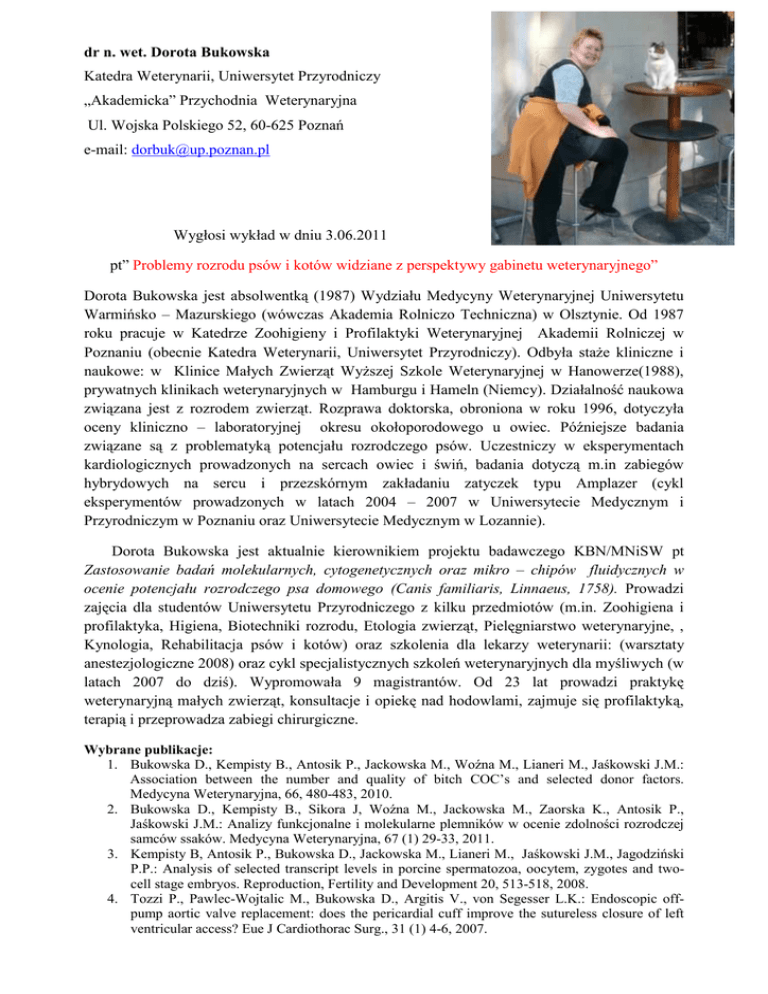 dr n. wet. Dorota Bukowska Katedra Weterynarii, Uniwersytet Przyrodniczy „Akademicka” Przychodnia Weterynaryjna Ul. Wojska Polskiego 52, 60-625 Poznań e-mail: [email protected] Wygłosi wykład w dniu 3.06.2011 pt” Problemy rozrodu psów i kotów widziane z perspektywy gabinetu weterynaryjnego” Dorota Bukowska jest absolwentką (1987) Wydziału Medycyny Weterynaryjnej Uniwersytetu Warmińsko – Mazurskiego (wówczas Akademia Rolniczo Techniczna) w Olsztynie. Od 1987 roku pracuje w Katedrze Zoohigieny i Profilaktyki Weterynaryjnej Akademii Rolniczej w Poznaniu (obecnie Katedra Weterynarii, Uniwersytet Przyrodniczy). Odbyła staŜe kliniczne i naukowe: w Klinice Małych Zwierząt WyŜszej Szkole Weterynaryjnej w Hanowerze(1988), prywatnych klinikach weterynaryjnych w Hamburgu i Hameln (Niemcy). Działalność naukowa związana jest z rozrodem zwierząt. Rozprawa doktorska, obroniona w roku 1996, dotyczyła oceny kliniczno – laboratoryjnej okresu okołoporodowego u owiec. Późniejsze badania związane są z problematyką potencjału rozrodczego psów. Uczestniczy w eksperymentach kardiologicznych prowadzonych na sercach owiec i świń, badania dotyczą m.in zabiegów hybrydowych na sercu i przezskórnym zakładaniu zatyczek typu Amplazer (cykl eksperymentów prowadzonych w latach 2004 – 2007 w Uniwersytecie Medycznym i Przyrodniczym w Poznaniu oraz Uniwersytecie Medycznym w Lozannie). Dorota Bukowska jest aktualnie kierownikiem projektu badawczego KBN/MNiSW pt Zastosowanie badań molekularnych, cytogenetycznych oraz mikro – chipów fluidycznych w ocenie potencjału rozrodczego psa domowego (Canis familiaris, Linnaeus, 1758). Prowadzi zajęcia dla studentów Uniwersytetu Przyrodniczego z kilku przedmiotów (m.in. Zoohigiena i profilaktyka, Higiena, Biotechniki rozrodu, Etologia zwierząt, Pielęgniarstwo weterynaryjne, , Kynologia, Rehabilitacja psów i kotów) oraz szkolenia dla lekarzy weterynarii: (warsztaty anestezjologiczne 2008) oraz cykl specjalistycznych szkoleń weterynaryjnych dla myśliwych (w latach 2007 do dziś). Wypromowała 9 magistrantów. Od 23 lat prowadzi praktykę weterynaryjną małych zwierząt, konsultacje i opiekę nad hodowlami, zajmuje się profilaktyką, terapią i przeprowadza zabiegi chirurgiczne. Wybrane publikacje: 1. Bukowska D., Kempisty B., Antosik P., Jackowska M., Woźna M., Lianeri M., Jaśkowski J.M.: Association between the number and quality of bitch COC’s and selected donor factors. Medycyna Weterynaryjna, 66, 480-483, 2010. 2. Bukowska D., Kempisty B., Sikora J, Woźna M., Jackowska M., Zaorska K., Antosik P., Jaśkowski J.M.: Analizy funkcjonalne i molekularne plemników w ocenie zdolności rozrodczej samców ssaków. Medycyna Weterynaryjna, 67 (1) 29-33, 2011. 3. Kempisty B, Antosik P., Bukowska D., Jackowska M., Lianeri M., Jaśkowski J.M., Jagodziński P.P.: Analysis of selected transcript levels in porcine spermatozoa, oocytem, zygotes and twocell stage embryos. Reproduction, Fertility and Development 20, 513-518, 2008. 4. Tozzi P., Pawlec-Wojtalic M., Bukowska D., Argitis V., von Segesser L.K.: Endoscopic offpump aortic valve replacement: does the pericardial cuff improve the sutureless closure of left ventricular access? Eue J Cardiothorac Surg., 31 (1) 4-6, 2007.