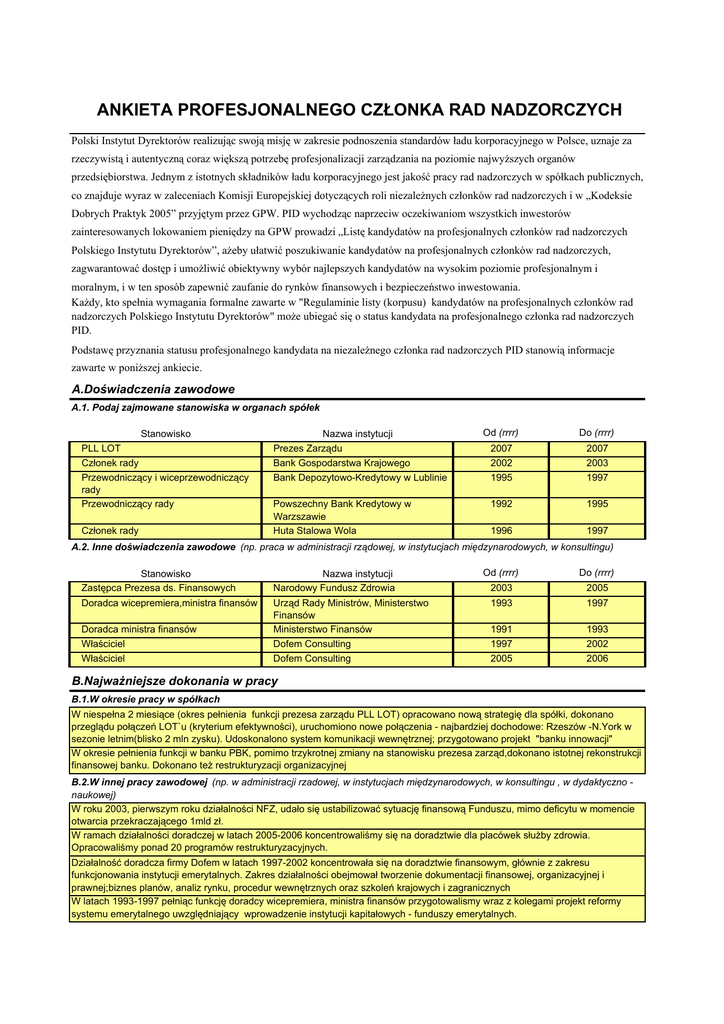 ANKIETA PROFESJONALNEGO CZŁONKA RAD NADZORCZYCH Polski Instytut Dyrektorów realizując swoją misję w zakresie podnoszenia standardów ładu korporacyjnego w Polsce, uznaje za rzeczywistą i autentyczną coraz większą potrzebę profesjonalizacji zarządzania na poziomie najwyŜszych organów przedsiębiorstwa. Jednym z istotnych składników ładu korporacyjnego jest jakość pracy rad nadzorczych w spółkach publicznych, co znajduje wyraz w zaleceniach Komisji Europejskiej dotyczących roli niezaleŜnych członków rad nadzorczych i w „Kodeksie Dobrych Praktyk 2005” przyjętym przez GPW. PID wychodząc naprzeciw oczekiwaniom wszystkich inwestorów zainteresowanych lokowaniem pieniędzy na GPW prowadzi „Listę kandydatów na profesjonalnych członków rad nadzorczych Polskiego Instytutu Dyrektorów”, aŜeby ułatwić poszukiwanie kandydatów na profesjonalnych członków rad nadzorczych, zagwarantować dostęp i umoŜliwić obiektywny wybór najlepszych kandydatów na wysokim poziomie profesjonalnym i moralnym, i w ten sposób zapewnić zaufanie do rynków finansowych i bezpieczeństwo inwestowania. KaŜdy, kto spełnia wymagania formalne zawarte w "Regulaminie listy (korpusu) kandydatów na profesjonalnych członków rad nadzorczych Polskiego Instytutu Dyrektorów" moŜe ubiegać się o status kandydata na profesjonalnego członka rad nadzorczych PID. Podstawę przyznania statusu profesjonalnego kandydata na niezaleŜnego członka rad nadzorczych PID stanowią informacje zawarte w poniŜszej ankiecie. A.Doświadczenia zawodowe A.1. Podaj zajmowane stanowiska w organach spółek Od (rrrr) Do (rrrr) 2007 2007 Bank Gospodarstwa Krajowego 2002 2003 Bank Depozytowo-Kredytowy w Lublinie 1995 1997 Powszechny Bank Kredytowy w Warzszawie Huta Stalowa Wola 1992 1995 1996 1997 PLL LOT Nazwa instytucji Prezes Zarządu Członek rady Przewodniczący i wiceprzewodniczący rady Przewodniczący rady Stanowisko Członek rady A.2. Inne doświadczenia zawodowe (np. praca w administracji rządowej, w instytucjach międzynarodowych, w konsultingu) Od (rrrr) Do (rrrr) 2003 2005 1993 1997 Doradca ministra finansów Urząd Rady Ministrów, Ministerstwo Finansów Ministerstwo Finansów 1991 1993 Właściciel Dofem Consulting 1997 2002 Właściciel Dofem Consulting 2005 2006 Stanowisko Zastępca Prezesa ds. Finansowych Nazwa instytucji Narodowy Fundusz Zdrowia Doradca wicepremiera,ministra finansów B.NajwaŜniejsze dokonania w pracy B.1.W okresie pracy w spółkach W niespełna 2 miesiące (okres pełnienia funkcji prezesa zarządu PLL LOT) opracowano nową strategię dla spółki, dokonano przeglądu połączeń LOT`u (kryterium efektywności), uruchomiono nowe połączenia - najbardziej dochodowe: Rzeszów -N.York w sezonie letnim(blisko 2 mln zysku). Udoskonalono system komunikacji wewnętrznej; przygotowano projekt "banku innowacji" W okresie pełnienia funkcji w banku PBK, pomimo trzykrotnej zmiany na stanowisku prezesa zarząd,dokonano istotnej rekonstrukcji finansowej banku. Dokonano teŜ restrukturyzacji organizacyjnej B.2.W innej pracy zawodowej (np. w administracji rzadowej, w instytucjach międzynarodowych, w konsultingu , w dydaktyczno naukowej) W roku 2003, pierwszym roku działalności NFZ, udało się ustabilizować sytuację finansową Funduszu, mimo deficytu w momencie otwarcia przekraczającego 1mld zł. W ramach działalności doradczej w latach 2005-2006 koncentrowaliśmy się na doradztwie dla placówek słuŜby zdrowia. Opracowaliśmy ponad 20 programów restrukturyzacyjnych. Działalność doradcza firmy Dofem w latach 1997-2002 koncentrowała się na doradztwie finansowym, głównie z zakresu funkcjonowania instytucji emerytalnych. Zakres działalności obejmował tworzenie dokumentacji finansowej, organizacyjnej i prawnej;biznes planów, analiz rynku, procedur wewnętrznych oraz szkoleń krajowych i zagranicznych W latach 1993-1997 pełniąc funkcję doradcy wicepremiera, ministra finansów przygotowalismy wraz z kolegami projekt reformy systemu emerytalnego uwzględniający wprowadzenie instytucji kapitałowych - funduszy emerytalnych. W latach 1991-1993 jako doradca ministra finansów uczestniczyłem w pracach zespołu reformującego sektor bankowy: prywatyzacja banków: WBK S.A. i Banku Śląskiego S.A., przygotowanie Ustawy o restrukturyzacji przedsiębiorstw i banków oraz bieŜący nadzór nad działalnością sektora Wykłady: 1)Europejska Akademia Planowania Finansowego (2005 - ); 2) SGH (SGPiS) - 1981-2006; 3)Uniwersytet Nanzan w Nagoyi, Japonia. Zakres:ekonomia, bankowość, finanse,systemy emerytalne, prywatyzacja i zarządzanie.Udział w licznych konferencjach miedzynarodowych (referent , panelista) : Austria, Chile, Grecja,Japonia, Litwa, Meksyk,Rosja, USA, W.Brytania. C.Profesjonalne zainteresowania zawodowe (dziedzina zarządzania, sektor - branŜa gospodarki) preferencje kandydata przy obsadzie rad nadzorczych 1. Sektor finansowy:banki, OFE, ew. tow. ubezpieczeniowe 2.Infrastruktura 3. Energetyka 4.Telekomunikacja D.Wykształcenie D.1.Wykształcenie formalne Tytuł naukowy Doktor nauk ekonomicznych Magister ekonomii Nazwa szkoły wyŜszej Szkoła Główna Handlowa Nazwa wydziału (kierunku) Handel Zagraniczny Szkoła Główna Planowania i Statystyki Handel Zagraniczny Rok ukończenia (rrrr) 1989 1980 D.2.Inne uprawnienia zawodowe (np. radca prawny, rzeczoznawca majatkowy, biegły rewident, makler gieldowy itp.) Rok ukończenia (rrrr) Tytuł / nazwa Dyplom kandydata na członka rad nadzorczych w spółkach Skarbu Państwa 2001 D.3.Studia podyplomowe i specjalistyczne Nazwa Nazwa szkoły / kursu Rok ukończenia (rrrr) D.4.Odbyte szkolenia w dziedzinie prawa gospodarczego, finansów, rachunkowości i Corporate Governance Rok ukończenia (rrrr) Nazwa szkoły / kursu Nazwa Wharton School of Business Maruman Shoken Inc., Nagoya, Japan Advanced Management Programme Kurs dla doradców inwestycyjnych 1996 1990 D.5.Odbyte nieobligatoryjne szkolenia zalecane przez PID 