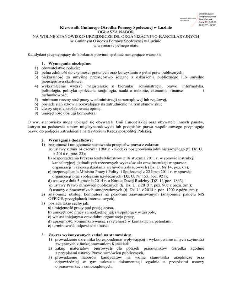 Kierownik GOPS Luzino Ewa Walczak Elektronicznie podpisany przez Ewa Walczak Data: 2016.05.05 10:51:49 +02'00' Kierownik Gminnego Ośrodka Pomocy Społecznej w Luzinie OGŁASZA NABÓR NA WOLNE STANOWISKO URZĘDNICZE DS. ORGANIZACYJNO-KANCELARYJNYCH w Gminnym Ośrodku Pomocy Społecznej w Luzinie w wymiarze pełnego etatu Kandydaci przystępujący do konkursu powinni spełniać następujące warunki: 1. Wymagania niezbędne: 1) obywatelstwo polskie; 2) pełna zdolność do czynności prawnych oraz korzystaniu z pełni praw publicznych; 3) niekaralność za umyślne przestępstwo ścigane z oskarżenia publicznego lub umyślne przestępstwo skarbowe; 4) wykształcenie wyższe magisterskie o kierunku: administracja, prawo, informatyka, politologia, polityka społeczna, socjologia, nauki o rodzinie, ekonomia, finanse i rachunkowość; 5) minimum roczny staż pracy w administracji samorządowej lub rządowej, 6) posiada stan zdrowia pozwalający na zatrudnienie na tym stanowisku; 7) cieszy się nieposzlakowaną opinią, 8) umiejętność obsługi komputera. O ww. stanowisko mogą ubiegać się obywatele Unii Europejskiej oraz obywatele innych państw, którym na podstawie umów międzynarodowych lub przepisów prawa wspólnotowego przysługuje prawo do podjęcia zatrudnienia na terytorium Rzeczypospolitej Polskiej. 2. Wymagania dodatkowe: 1) znajomość i umiejętność stosowania przepisów prawa z zakresu: a) ustawy z dnia 14 czerwca 1960 r. - Kodeks postępowania administracyjnego (tj. Dz. U. z 2016 r., poz. 23); b) rozporządzenia Prezesa Rady Ministrów z 18 stycznia 2011 r. w sprawie instrukcji kancelaryjnej, jednolitych rzeczowych wykazów akt oraz instrukcji w sprawie organizacji i zakresu działania archiwów zakładowych (Dz. U. Nr 14, poz. 67); c) rozporządzenia Ministra Pracy i Polityki Społecznej z 22 lipca 2011 r. w sprawie organizacji prac społecznie użytecznych (Dz. U. Nr 155, poz. 921); d) ustawy z dnia 5 grudnia 2014 r. o Karcie Dużej Rodziny (DZ. U, poz. 1863); e) ustawy Prawo zamówień publicznych (tj. Dz. U. z 2013 r. poz. 907 z późn. zm.); f) ustawy o pracownikach samorządowych (tj. Dz. U. z 2014 r. poz. 1202 z późn. zm.); 2) znajomość obsługi komputera na poziomie zaawansowanym (znajomość pakietu MS OFFICE, przeglądarek internetowych), 3) posiada takie cechy jak: a) umiejętność pracy pod presją czasu, b) umiejętność pracy samodzielnej jak i współpracy w zespole, c) własna inicjatywa oraz dobra organizacja pracy, d) uprzejmość, komunikatywność i rzetelność w kontaktach z petentami, e) terminowość, odpowiedzialność. 3. Zakres wykonywanych zadań na stanowisku: 1) prowadzenie dziennika korespondencji wpływającej i wykonywanie innych czynności związanych z funkcjonowaniem Kancelarii, 2) zakup materiałów biurowych dla potrzeb pracowników Ośrodka zgodnie z przepisami ustawy Prawo zamówień publicznych, 3) prowadzenie naborów kandydatów na wolne stanowiska urzędnicze oraz odpowiedniej w tym zakresie dokumentacji zgodnie z przepisami ustawy o pracownikach samorządowych, 4) prowadzenie spraw związanych z dokumentacją wytwarzaną i gromadzoną w Gminnym Ośrodku Pomocy Społecznej w Luzinie oraz jej archiwizacją i brakowaniem dokumentacji niearchiwalnej zgodnie z odpowiednimi przepisami prawa, 5) prowadzenie rejestru pieczęci, ich kasowanie i zamawianie, 6) prowadzenie rejestru Zarządzeń Kierownika Gminnego Ośrodka Pomocy Społecznej w Luzinie, 7) prowadzenie i rozliczanie prac społecznie użytecznych zgodnie z przepisami szczególnymi oraz prowadzenie odpowiedniej w tym zakresie dokumentacji, 8) wykonywanie zadań określonych ustawą z dnia 5 grudnia 2014 r. o Karcie Dużej Rodziny (Dz. U., poz. 1863), 9) sporządzanie sprawozdań z zakresu realizowanych zadań w formie pisemnej oraz przekazywanie ich właściwemu wojewodzie, również w wersji elektronicznej, 10) obsługa techniczna decyzji administracyjnych w sprawie świadczenia wychowawczego (pieczętowanie, wysyłanie, zakładanie teczek aktowych, itd.), 11) udzielanie osobom zgłaszającym się pełnej informacji o przysługujących im prawach i uprawnieniach z zakresu realizowanych zadań.” 4. Wymagane dokumenty: 1) życiorys (CV), 2) list motywacyjny, 3) kwestionariusz osobowy dla osoby ubiegającej się o zatrudnienie, 4) kopie dokumentów poświadczających wykształcenie, 5) kopie innych dokumentów świadczących o posiadanych kwalifikacjach (studia podyplomowe, kursy, szkolenia), bądź zaświadczenie o kontynuacji nauki na studiach podyplomowych), 6) kopie świadectw pracy potwierdzające staż pracy, 7) oświadczenie o niekaralność za umyślne przestępstwo ścigane z oskarżenia publicznego lub umyślne przestępstwo skarbowe (wybrany kandydat zobowiązany będzie do przedłożenia zaświadczenia o niekaralności wydanego przez Krajowy Rejestr Karny). 8) oświadczenie o pełnej zdolności do czynności prawnych i korzystaniu z pełni praw publicznych, 9) oświadczenie o braku przeciwwskazań zdrowotnych do pracy na danym stanowisku. 10) w przypadku osób nieposiadających obywatelstwa polskiego - dokument potwierdzający znajomość języka polskiego, 11) kandydaci niepełnosprawni, zamierzający skorzystać z uprawnienia pierwszeństwa w zatrudnieniu w przypadku znalezienia się w gronie najlepszych kandydatów są obowiązani do złożenia kopii dokumentu potwierdzającego niepełnosprawność. 5) Wskaźnik zatrudnienia osób niepełnosprawnych w Ośrodku, w kwietniu 2016 r., w rozumieniu przepisów o rehabilitacji zawodowej i społecznej oraz zatrudnieniu osób niepełnosprawnych wyniósł poniżej 6%. 6) Informacja o warunkach pracy na danym stanowisku: 1) miejsce pracy – Gminny Ośrodek Pomocy Społecznej w Luzinie, ul. Młyńska 7. Siedziba Ośrodka mieści się na I piętrze w budynku Niepublicznego Zakładu Opieki Zdrowotnej. Budynek jest wyposażony w podjazd umożliwiający poruszanie się na wózku inwalidzkim lecz brak windy z możliwoś