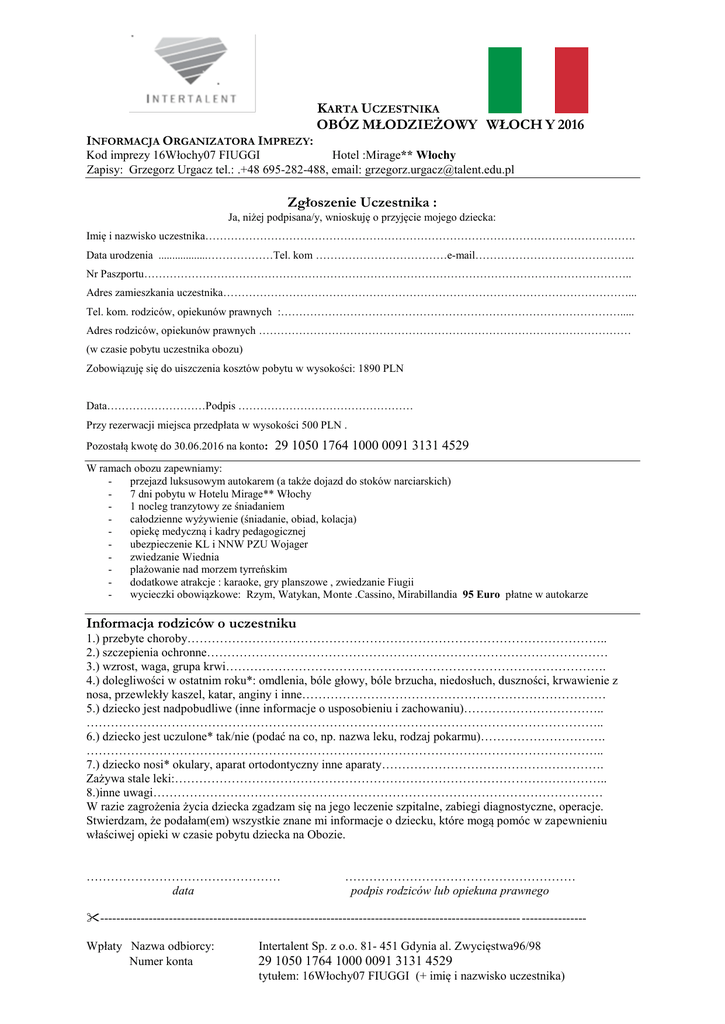 KARTA UCZESTNIKA OBÓZ MŁODZIEŻOWY WŁOCH Y 2016 INFORMACJA ORGANIZATORA IMPREZY: Kod imprezy 16Włochy07 FIUGGI Hotel :Mirage** Włochy Zapisy: Grzegorz Urgacz tel.: .+48 695-282-488, email: [email protected] Zgłoszenie Uczestnika : Ja, niżej podpisana/y, wnioskuję o przyjęcie mojego dziecka: Imię i nazwisko uczestnika………………………………………………………………………………………………………. Data urodzenia ..................………………Tel. kom ………………………………e-mail…………………………………….. Nr Paszportu…………………………………………………………………………………………………………………….. Adres zamieszkania uczestnika…………………………………………………………………………………………………... Tel. kom. rodziców, opiekunów prawnych :…………………………………………………………………………………..... Adres rodziców, opiekunów prawnych ………………………………………………………………………………………… (w czasie pobytu uczestnika obozu) Zobowiązuję się do uiszczenia kosztów pobytu w wysokości: 1890 PLN Data………………………Podpis ………………………………………… Przy rezerwacji miejsca przedpłata w wysokości 500 PLN . Pozostałą kwotę do 30.06.2016 na konto: 29 1050 1764 1000 0091 3131 4529 W ramach obozu zapewniamy: przejazd luksusowym autokarem (a także dojazd do stoków narciarskich) 7 dni pobytu w Hotelu Mirage** Włochy 1 nocleg tranzytowy ze śniadaniem całodzienne wyżywienie (śniadanie, obiad, kolacja) opiekę medyczną i kadry pedagogicznej ubezpieczenie KL i NNW PZU Wojager zwiedzanie Wiednia plażowanie nad morzem tyrreńskim dodatkowe atrakcje : karaoke, gry planszowe , zwiedzanie Fiugii wycieczki obowiązkowe: Rzym, Watykan, Monte .Cassino, Mirabillandia 95 Euro płatne w autokarze Informacja rodziców o uczestniku 1.) przebyte choroby………………………………………………………………………………………….. 2.) szczepienia ochronne……………………………………………………………………………………… 3.) wzrost, waga, grupa krwi…………………………………………………………………………………. 4.) dolegliwości w ostatnim roku*: omdlenia, bóle głowy, bóle brzucha, niedosłuch, duszności, krwawienie z nosa, przewlekły kaszel, katar, anginy i inne………………………………………………………………… 5.) dziecko jest nadpobudliwe (inne informacje o usposobieniu i zachowaniu)…………………………….. ……………………………………………………………………………………………………………….. 6.) dziecko jest uczulone* tak/nie (podać na co, np. nazwa leku, rodzaj pokarmu)…………………………. ……………………………………………………………………………………………………………….. 7.) dziecko nosi* okulary, aparat ortodontyczny inne aparaty………………………………………………. Zażywa stale leki:…………………………………………………………………………………………….. 8.)inne uwagi………………………………………………………………………………………………… W razie zagrożenia życia dziecka zgadzam się na jego leczenie szpitalne, zabiegi diagnostyczne, operacje. Stwierdzam, że podałam(em) wszystkie znane mi informacje o dziecku, które mogą pomóc w zapewnieniu właściwej opieki w czasie pobytu dziecka na Obozie. ………………………………………… data ………………………………………………… podpis rodziców lub opiekuna prawnego -------------------------------------------------------------------------------------------------------- ---------------Wpłaty Nazwa odbiorcy: Numer konta Intertalent Sp. z o.o. 81- 451 Gdynia al. Zwycięstwa96/98 29 1050 1764 1000 0091 3131 4529 tytułem: 16Włochy07 FIUGGI (+ imię i nazwisko uczestnika) Oświadczenie Opiekunów Prawnych (Rodziców) Wyrażam / nie wyrażam* zgodę/y na samodzielne wyjścia syna/córki* z ośrodka do godz .20:00 Wyrażam zgodę na badanie dziecka alkomatem w przypadku podejrzenia spożywania alkoholu. Bezwzględnym warunkiem uczestnictwa w obozie jest zakaz oddalania się z miejsca zakwaterowania i od grupy w terenie bez zezwolenia opiekuna, a także spożywania alkoholu, palenia papierosów i zażywania środków odurzających. Uczestnicy nie przestrzegający tych ustaleń są usuwani z obozu na koszt rodziców. *niepotrzebne skreślić ………………………………………… data …………………………………………………. podpis rodziców, opiekunów prawnych Warunki uczestnictwa w obozie organizowanym przez Intertalent Sp. z o.o. 1. uczestnik obozu jest zobowiązany do stosowania się do regulaminu obozu oraz do poleceń wychowawców. 2. uczestnik obozu jest zobowiązany zabrać ze sobą ważny paszport lub dowód osobisty 3. organizatorzy nie ponoszą odpowiedzialności za rzeczy wartościowe pozostawione przez uczestników podczas pobytu i w środkach transportu 4. w przypadku spożywania alkoholu, przebywania pod jego wpływem, palenia tytoniu lub poważnego naruszenia regulaminu obozu, uczestnik zostanie wydalony z placówki na koszt własny (rodziców i opiekunów). 5. uczestnik (lub jego rodzice, opiekunowie) ponosi odpowiedzialność za szkody wyrządzone przez niego w czasie pobytu na obozie Ja niżej podpisana/y oświadczam, że warunki uczestnictwa w obozie są mi znane i je akceptuję. ………………………………………… podpis uczestnika …………………………………………………… podpis rodziców (opiekunów prawnych) Informacja o uczestn