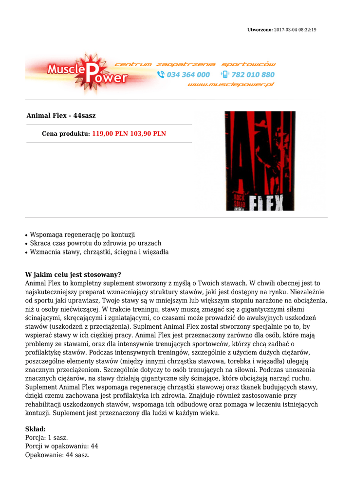Utworzono: 2017-03-04 08:32:19 Animal Flex - 44sasz Cena produktu: 119,00 PLN 103,90 PLN ● ● ● Wspomaga regenerację po kontuzji Skraca czas powrotu do zdrowia po urazach Wzmacnia stawy, chrząstki, ścięgna i więzadła W jakim celu jest stosowany? Animal Flex to kompletny suplement stworzony z myślą o Twoich stawach. W chwili obecnej jest to najskuteczniejszy preparat wzmacniający struktury stawów, jaki jest dostępny na rynku. Niezależnie od sportu jaki uprawiasz, Twoje stawy są w mniejszym lub większym stopniu narażone na obciążenia, niż u osoby niećwiczącej. W trakcie treningu, stawy muszą zmagać się z gigantycznymi siłami ścinającymi, skręcającymi i zgniatającymi, co czasami może prowadzić do awulsyjnych uszkodzeń stawów (uszkodzeń z przeciążenia). Suplment Animal Flex został stworzony specjalnie po to, by wspierać stawy w ich ciężkiej pracy. Animal Flex jest przeznaczony zarówno dla osób, które mają problemy ze stawami, oraz dla intensywnie trenujących sportowców, którzy chcą zadbać o profilaktykę stawów. Podczas intensywnych treningów, szczególnie z użyciem dużych ciężarów, poszczególne elementy stawów (między innymi chrząstka stawowa, torebka i więzadła) ulegają znacznym przeciążeniom. Szczególnie dotyczy to osób trenujących na siłowni. Podczas unoszenia znacznych ciężarów, na stawy działają gigantyczne siły ścinające, które obciążają narząd ruchu. Suplement Animal Flex wspomaga regenerację chrząstki stawowej oraz tkanek budujących stawy, dzięki czemu zachowana jest profilaktyka ich zdrowia. Znajduje również zastosowanie przy rehabilitacji uszkodzonych stawów, wspomaga ich odbudowę oraz pomaga w leczeniu istniejących kontuzji. Suplement jest przeznaczony dla ludzi w każdym wieku. Skład: Porcja: 1 sasz. Porcji w opakowaniu: 44 Opakowanie: 44 sasz. Wartość odżywcza w 1 porcji Kalorie 9 kcal (37 kJ) Kalorie z tłuszczu 9 Tłuszcze całkowite 1g Witamina C (kwas askorbinowy) 100 mg Witamina E ( jako d- alfa tokoferol) 100 mg Cynk (jako pikolinian cynku) 15 mg Selen (selenian sodu) 70 μg Mangan (jako siarczan manganu) 1 mg Kotancjmpleks subsi odbudowujących stawy 3000 mg Glukozamina ( jako HCl, siarczan Kcl) - Dimetylosulfon (MSM) - Siarczan chondroityny A (CSA) - Siarczan chondroityny C (CSC) - Kompleks natłuszczający powierzchnie stawowe 1000 mg Olej lniany (50% kwasu alfa linolenowego) - Firmowa mieszanka kasów tłuszczowych (m.in.: kwas mirystynowy, palmitynowy, Oleinowy, laurynowy) - Kwas hialuronowy - Kompleks wspierający stawy 1000 mg Ekstrakt z korzenia imbiru (gingerols, shagaols) - Ekstrakt z kurkumy (kurkumina) - Wyciąg z drzewa Boswellia (kwas boswelinowy) - Kwercetyna - Bromelaina - Dawkowanie: Jedna porcja dziennie wraz z posiłkiem. Ilość Adres: http://www.muscle.trustnet.pl/ 44 sasz Telefon: 34 36 43 000, 782 010 880 Email: [email protected]