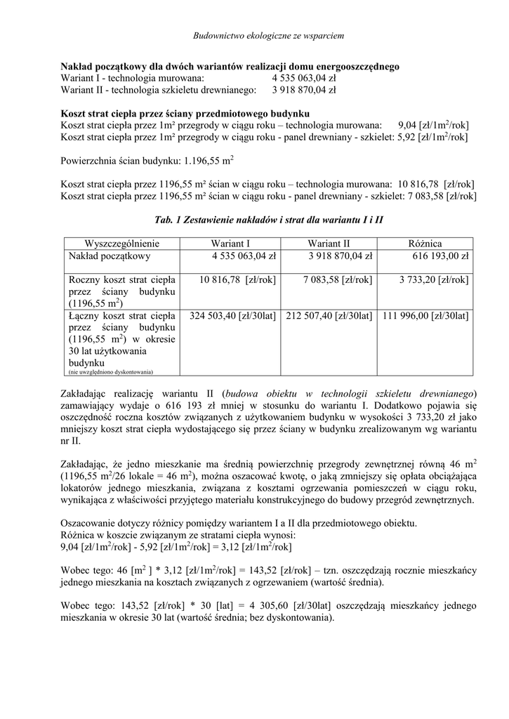 Budownictwo ekologiczne ze wsparciem Nakład początkowy dla dwóch wariantów realizacji domu energooszczędnego Wariant I - technologia murowana: 4 535 063,04 zł Wariant II - technologia szkieletu drewnianego: 3 918 870,04 zł Koszt strat ciepła przez ściany przedmiotowego budynku Koszt strat ciepła przez 1m² przegrody w ciągu roku – technologia murowana: 9,04 [zł/1m2/rok] Koszt strat ciepła przez 1m² przegrody w ciągu roku - panel drewniany - szkielet: 5,92 [zł/1m2/rok] Powierzchnia ścian budynku: 1.196,55 m2 Koszt strat ciepła przez 1196,55 m² ścian w ciągu roku – technologia murowana: 10 816,78 [zł/rok] Koszt strat ciepła przez 1196,55 m² ścian w ciągu roku - panel drewniany - szkielet: 7 083,58 [zł/rok] Tab. 1 Zestawienie nakładów i strat dla wariantu I i II Wyszczególnienie Nakład początkowy Roczny koszt strat ciepła przez ściany budynku (1196,55 m2) Łączny koszt strat ciepła przez ściany budynku (1196,55 m2) w okresie 30 lat użytkowania budynku Wariant I 4 535 063,04 zł Wariant II 3 918 870,04 zł Różnica 616 193,00 zł 10 816,78 [zł/rok] 7 083,58 [zł/rok] 3 733,20 [zł/rok] 324 503,40 [zł/30lat] 212 507,40 [zł/30lat] 111 996,00 [zł/30lat] (nie uwzględniono dyskontowania) Zakładając realizację wariantu II (budowa obiektu w technologii szkieletu drewnianego) zamawiający wydaje o 616 193 zł mniej w stosunku do wariantu I. Dodatkowo pojawia się oszczędność roczna kosztów związanych z użytkowaniem budynku w wysokości 3 733,20 zł jako mniejszy koszt strat ciepła wydostającego się przez ściany w budynku zrealizowanym wg wariantu nr II. Zakładając, że jedno mieszkanie ma średnią powierzchnię przegrody zewnętrznej równą 46 m 2 (1196,55 m2/26 lokale = 46 m2), można oszacować kwotę, o jaką zmniejszy się opłata obciążająca lokatorów jednego mieszkania, związana z kosztami ogrzewania pomieszczeń w ciągu roku, wynikająca z właściwości przyjętego materiału konstrukcyjnego do budowy przegród zewnętrznych. Oszacowanie dotyczy różnicy pomiędzy wariantem I a II dla przedmiotowego obiektu. Różnica w koszcie związanym ze stratami ciepła wynosi: 9,04 [zł/1m2/rok] - 5,92 [zł/1m2/rok] = 3,12 [zł/1m2/rok] Wobec tego: 46 [m2 ] * 3,12 [zł/1m2/rok] = 143,52 [zł/rok] – tzn. oszczędzają rocznie mieszkańcy jednego mieszkania na kosztach związanych z ogrzewaniem (wartość średnia). Wobec tego: 143,52 [zł/rok] * 30 [lat] = 4 305,60 [zł/30lat] oszczędzają mieszkańcy jednego mieszkania w okresie 30 lat (wartość średnia; bez dyskontowania). Budownictwo ekologiczne ze wsparciem Z uwagi na fakt, że lokale mieszkalne stanowią o ich socjalnym znaczeniu (m.in. niska stawka czynszu) trudno rozpatrywać tę inwestycję w kategoriach racjonalnego okresu zwrotu i stopy zwrotu, tak jak byłoby to w przypadku inwestycji komercyjnej, dla której przeprowadza się analizę efektywności ekonomicznej, porównuje się wartość początkowego nakładu z nadwyżkami finansowymi, których uzyskania oczekuje się dzięki realizacji danego wariantu inwestycyjnego, a w efekcie określa się m.in. minimalną stawkę czynszu. W analizowanym przypadku należy raczej mówić o poszukiwaniu rozwiązania - wariantu, który zapewniłby optymalne wydatkowanie środków publicznych. Przeprowadzone analizy kosztowe wskazują, iż realizacja domu energooszczędnego wg wariant II zapewni racjonalne - uzasadnione ekonomicznie wydatkowanie środków z budżetu miasta Gdańska.