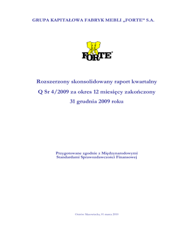 GRUPA KAPITAŁOWA FABRYK MEBLI „FORTE” S.A. Rozszerzony skonsolidowany raport kwartalny Q Sr 4/2009 za okres 12 miesięcy zakończony 31 grudnia 2009 roku Przygotowane zgodnie z Międzynarodowymi Standardami Sprawozdawczości Finansowej Ostrów Mazowiecka, 01 marca 2010 Grupa Kapitałowa Fabryk Mebli „Forte” S.A. Skonsolidowany raport kwartalny QSr 4/2009 za okres 12 miesięcy zakończony 31 grudnia 2009 wraz z informacją dodatkową ( w tysiącach złotych) WYBRANE DANE FINANSOWE PLN EURO Dane dotyczące skróconego skonsolidowanego sprawozdania 4 kwartały 4 kwartały 4 kwartały 4 kwartały 2009 roku 2008 roku 2009 roku 2008 roku finansowego Przychody netto ze sprzedaŜy produktów, towarów, materiałów i 477 911 115 615 135 305 usług 501 839 Zysk (strata) z działalności operacyjnej 44 929 8 611 10 351 2 438 Zysk (strata) przed opodatkowaniem 53 932 7 844 12 425 2 221 Zysk (strata) okresu przypadający 42 896 4 418 9 883 1 251 właścicielom jednostki dominującej Całkowite dochody za okres 46 753 5 849 10 771 1 656 Przepływy pienięŜne netto z działalności operacyjnej 58 319 32 634 13 436 9 239 Przepływy pienięŜne netto z (8 692) (17 472) (2 002) (4 947) działalności inwestycyjnej Przepływy pienięŜne netto z działalności finansowej (29 516) (18 214) (6 800) (5 157) Zwiększenie netto stanu środków pienięŜnych i ich ekwiwalentów (3 052) 4 633 (864) 20 111 Liczba akcji (w szt.) 23 751 084 23 751 084 23 751 084 23 751 084 Zysk (strata) na jedną akcję zwykłą (w zł/ EUR) Suma aktywów Zobowiązania razem Zobowiązania długoterminowe Zobowiązania krótkoterminowe Kapitał własny udziałowców Jednostki Dominującej Kapitał zakładowy Wartość księgowa na jedną akcję (w zł/EUR) 0,19 0,42 0,05 1,81 stan na stan na stan na stan na 2009-12-31 2008-12-31 2009-12-31 2008-12-31 447 572 445 864 108 946 106 860 143 214 68 667 74 547 185 873 88 608 97 265 34 861 16 715 18 146 44 548 21 237 23 312 301 489 23 751 257 227 23 751 73 387 5 781 61 650 5 692 12,69 10,83 3,09 2,60 Komisja Nadzoru Finansowego 2 Grupa Kapitałowa Fabryk Mebli „Forte” S.A. Skonsolidowany raport kwartalny QSr 4/2009 za okres 12 miesięcy zakończony 31 grudnia 2009 wraz z informacją dodatkową ( w tysiącach złotych) WYBRANE DANE FINANSOWE PLN Dane dotyczące skróconego sprawozdania finansowego 4 kwartały 2009 roku Przychody netto ze sprzedaŜy produktów, towarów, materiałów i usług EURO 4 kwartały 4 kwartały 4 kwartały 2008 roku 2009 roku 2008 roku 461 767 430 345 106 383 121 838 Zysk (strata) z działalności operacyjnej 44 603 2 646 10 276 749 Zysk (strata) przed opodatkowaniem Zysk (strata) okresu 51 760 43 197 3 182 2 577 11 925 9 952 901 730 Całkowite dochody za okres Przepływy pienięŜne netto z działalności operacyjnej Przepływy pienięŜne netto z działalności inwestycyjnej 49 117 2 577 11 316 730 56 781 45 880 13 081 12 989 (5 218) (30 439) (1 202) (8 618) Przepływy pienięŜne netto z działalności finansowej (29 057) (13 982) (6 694) (3 959) 22 506 1 459 5 185 413 Zwiększenie netto stanu środków pienięŜnych i ich ekwiwalentów Liczba akcji (w szt.) Zadeklarowana lub wypłacona dywidenda na jedną akcję (w zł/EUR) Zysk (strata) na jedną akcję zwykłą (w zł/ EUR) Suma aktywów Zobowiązania razem Zobowiązania długoterminowe Zobowiązania krótkoterminowe Kapitał własny Kapitał zakładowy Wartość księgowa na jedną akcję (w zł/EUR) 23 751 084 23 751 084 23 751 084 23 751 084 0,10 - 0,02 - 1,82 0,11 0,42 0,03 stan na stan na stan na stan na 2009-12-31 2008-12-31 2009-12-31 2008-12-31 444 045 439 664 108 087 105 374 132 879 175 240 32 345 42 000 60 878 72 001 311 166 23 751 82 687 92 553 264 424 23 751 14 819 17 526 75 743 5 781 19 818 22 182 63 375 5 692 13,10 11,13 3,19 2,67 Poszczególne pozycje sprawozdań finansowych zostały przeliczone według kursów podanych w punkcie 9.15 Informacji dodatkowej do Skonsolidowanego raportu kwartalnego Q Sr 4/2009. Komisja Nadzoru Finansowego 3 Grupa Kapitałowa Fabryk Mebli „Forte” S.A. Skonsolidowany raport kwartalny QSr 4/2009 za okres 12 miesięcy zakończony 31 grudnia 2009 wraz z informacją dodatkową ( w tysiącach złotych) SKONSOLIDOWANE SPRAWOZDANIE Z SYTUACJI FINANSOWEJ (BILANS) 31 grudnia 2009 roku AKTYWA Aktywa trwałe Rzeczowe aktywa trwałe Wartości niematerialne Inwestycje wyceniane metodą praw własności Aktywa finansowe Aktywa z tytułu podatku odroczonego Nieruchomości inwestycyjne Rozliczenie międzyokresowe 31grudnia 2008 roku 181 785 1 343 2 008 835 43 489 0 229 460 196 730 1 915 1 005 1 249 43 036 3 243 938 Aktywa trwałe przeznaczone do sprzedaŜy 88 153 80 525 7 328 508 454 839 35 788 213 595 4 517 86 646 98 391 549 341 15 999 201 926 - SUMA AKTYWÓW 447 572 445 864 23 751 111 646 (7 331) 5 920 23 751 111 646 (5 152) - 98 717 68 786 2 869 304 358 98 515 28 467 2 764 259 991 48 479 1 599 13 718 182 4 689 68 667 73 254 1 471 6 778 206 6 899 88 608 35 092 20 805 4 018 12 193 2 439 74 547 143 214 447 572 38 936 25 016 21 333 2 105 7 695 2 180 97 265 185 873 445 864 Aktywa obrotowe Zapasy NaleŜności z tytułu dostaw i usług oraz pozostałe naleŜności NaleŜności z tytułu pochodnych instrumentów finansowych NaleŜności z tytułu podatku dochodowego Rozliczenia międzyokresowe Aktywa finansowe Środki pienięŜne i ich ekwiwalenty PASYWA Kapitał własny (przypisany akcjonariuszom Jednostki Dominującej) Kapitał podstawowy NadwyŜka ze sprzedaŜy akcji powyŜej ich wartości nominalnej RóŜnice kursowe z przeliczenia jednostki zagranicznej Kapitał rezerwowy z aktualizacji wyceny instrumentów zabezpieczających Pozostałe kapitały rezerwowe Zyski zatrzymane Kapitały przypadające udziałowcom mniejszościowym Kapitał własny ogółem Zobowiązania długoterminowe Oprocentowane kredyty bankowe i poŜyczki Rezerwy Rezerwa z tytułu odroczonego podatku dochodowego Rozliczenia międzyokresowe Zobowiązania finansowe z tytułu leasingu Zobowiązania kr
