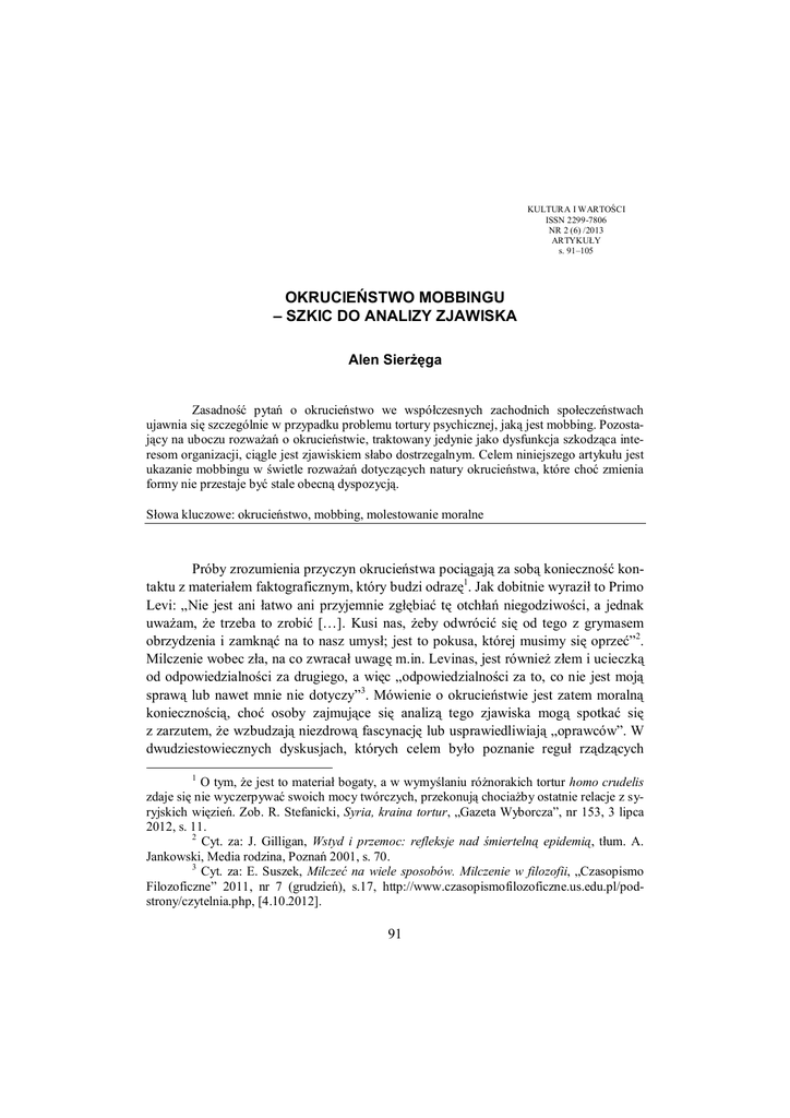 KULTURA I WARTOŚCI ISSN 2299-7806 NR 2 (6) /2013 ARTYKUŁY s. 91–105 OKRUCIEŃSTWO MOBBINGU – SZKIC DO ANALIZY ZJAWISKA Alen Sierżęga Zasadność pytań o okrucieństwo we współczesnych zachodnich społeczeństwach ujawnia się szczególnie w przypadku problemu tortury psychicznej, jaką jest mobbing. Pozostający na uboczu rozważań o okrucieństwie, traktowany jedynie jako dysfunkcja szkodząca interesom organizacji, ciągle jest zjawiskiem słabo dostrzegalnym. Celem niniejszego artykułu jest ukazanie mobbingu w świetle rozważań dotyczących natury okrucieństwa, które choć zmienia formy nie przestaje być stale obecną dyspozycją. Słowa kluczowe: okrucieństwo, mobbing, molestowanie moralne Próby zrozumienia przyczyn okrucieństwa pociągają za sobą konieczność kontaktu z materiałem faktograficznym, który budzi odrazę1. Jak dobitnie wyraził to Primo Levi: „Nie jest ani łatwo ani przyjemnie zgłębiać tę otchłań niegodziwości, a jednak uważam, że trzeba to zrobić […]. Kusi nas, żeby odwrócić się od tego z grymasem obrzydzenia i zamknąć na to nasz umysł; jest to pokusa, której musimy się oprzeć”2. Milczenie wobec zła, na co zwracał uwagę m.in. Levinas, jest również złem i ucieczką od odpowiedzialności za drugiego, a więc „odpowiedzialności za to, co nie jest moją sprawą lub nawet mnie nie dotyczy”3. Mówienie o okrucieństwie jest zatem moralną koniecznością, choć osoby zajmujące się analizą tego zjawiska mogą spotkać się z zarzutem, że wzbudzają niezdrową fascynację lub usprawiedliwiają „oprawców”. W dwudziestowiecznych dyskusjach, których celem było poznanie reguł rządzących 1 O tym, że jest to materiał bogaty, a w wymyślaniu różnorakich tortur homo crudelis zdaje się nie wyczerpywać swoich mocy twórczych, przekonują chociażby ostatnie relacje z syryjskich więzień. Zob. R. Stefanicki, Syria, kraina tortur, „Gazeta Wyborcza”, nr 153, 3 lipca 2012, s. 11. 2 Cyt. za: J. Gilligan, Wstyd i przemoc: refleksje nad śmiertelną epidemią, tłum. A. Jankowski, Media rodzina, Poznań 2001, s. 70. 3 Cyt. za: E. Suszek, Milczeć na wiele sposobów. Milczenie w filozofii, „Czasopismo Filozoficzne” 2011, nr 7 (grudzień), s.17, http://www.czasopismofilozoficzne.us.edu.pl/podstrony/czytelnia.php, [4.10.2012]. 91 A. SIERŻĘGA – OKRUCIEŃSTWO MOBBINGU... ludzką destrukcyjnością, prym wiodły koncepcje odnoszące się do instynktywizmu, behawioryzmu czy psychoanalizy. Zdumiewa nieobecność wątków moralnych i etycznych4. Ze względu na swoistą trudność tematu, zasadna wydaje się próba spojrzenia na zjawisko okrucieństwa z punktu widzenia różnych dyscyplin naukowych, ale ważne jednak przy tym – co wskazywał W. Nowak – by w takich rozważaniach nie zagubić perspektywy metafizycznej5. Być może właśnie w crudelitas najwyraźniej uwidacznia się transcendentny wymiar fenomenu zła. PROBLEMY DEFINICJI I MOTYWACJI Okrucieństwo jest ekstremalną formą zachowań, które zbiorczo określamy terminami agresja lub przemoc. O ile jednak oba te terminy nie mają wyraźnie dookreślonych semantycznych granic6, często bywają stosowane zamiennie lub do opisu zgoła odmiennych zjawisk, o tyle w literaturze, mimo pewnych różnic, istnieje zgoda co do węższego znaczeniowo pojęcia okrucieństwa. M. Zdziechowski w krótkim, lecz pełnym pasji studium nawiązując do René Guyona i pisze: „Okrucieństwo polega na umyślnym i rozmyślnym sprawianiu cierpienia istocie żywej, czującej. Okrucieństwo jest dla okrutnika rozkoszą, […] pastwić się bowiem, możemy tylko nad istotą słabszą, bezbronną – lew w klatce na łasce jest u dziecka. Nie dość tego, w okrucieństwie mamy najbardziej odrażającą formę podłości. Można tłumaczyć czyn podły spełniony ze strachu, albo dla interesu, ale podłość dla rozkoszy pastwienia się nad tym, kto się bronić nie jest w stanie, nie może nie budzić pogardy najgłębszej w każdym, kto ma w sobie choćby podobieństwo jakieś tego, co się sumieniem nazywa. Okrucieństwo wprowadza w szał, w stan bliski obłędu […]”. A dalej wskazuje, że to, co zwykle ludzi bę4 Zob. R. Syska, Agresja i zło. Ścieżki XX-wiecznej destrukcyjności, [w:] Przemoc ikoniczna, czy „nowa widzialność”?, red. E. Wilk, Wydawnictwo Uniwersytetu Śląskiego, Łódź 2001, s. 9–48. 5 Zob. W. Nowak, Okrucieństwo i kultura współczesna – próba cząstkowej diagnozy z nieustającym odniesieniem do historii, „Edukacja humanistyczna” 2006, nr 1 (14), s. 50–51. 6 S. Amsterdamski analizując efekty prac zespołu naukowców (filozofów, socjologów, historyków, psychologów, neurofizjologa, biologa, prawnika i teoretyka kultury), którzy uczestniczyli w spotkaniach poświęconych zagadnieniom nienawiści, agresji i przemocy, pisze: „[...] znalezienie wspólnego określenia dla tak różnych, wymienionych tam zachowań wydaje się niemożliwe; każde określenie bywa operacyjnie przydatne w jakiejś dziedzinie, ale żadne nie może pretendować do wartości uniwersalnej […]. Kiedy zaś na terenie rozmaitych dyscyplin dookreśla się jakoś jego znaczenie, zakres stosowalności, wbrew potocznemu uzusowi, staje się siłą rzeczy ograniczony”. Zob. Człowiek i agresja. Głosy o nienawiści i przemocy. Ujęcie interdyscyplinarne, przedmowa S. Amsterdamski, Wydawnictwo Sic!, Warszawa 2002, s. 15. 92 A. SIERŻĘGA – OKRUCIEŃSTWO MOBBINGU... dących świadkami cierpienia, „oburza i przeraża, to go [człowieka okrutnego] pociąga i cieszy; on się zacina i zatwardza w namiętności swojej”7. Mamy tu kilka elementów, które pozwalają zaliczyć dany czyn do kategorii czynów okrutnych. Po pierwsze, świadomość jego popełnienia, postrzegana w prawie karnym jako niezbędny element winy: actus non facit reum nisi mens sit rea (czyn nie znaczy o winie, póki nie jest winny również umysł). Oczywiście, podejście prawno-ety
