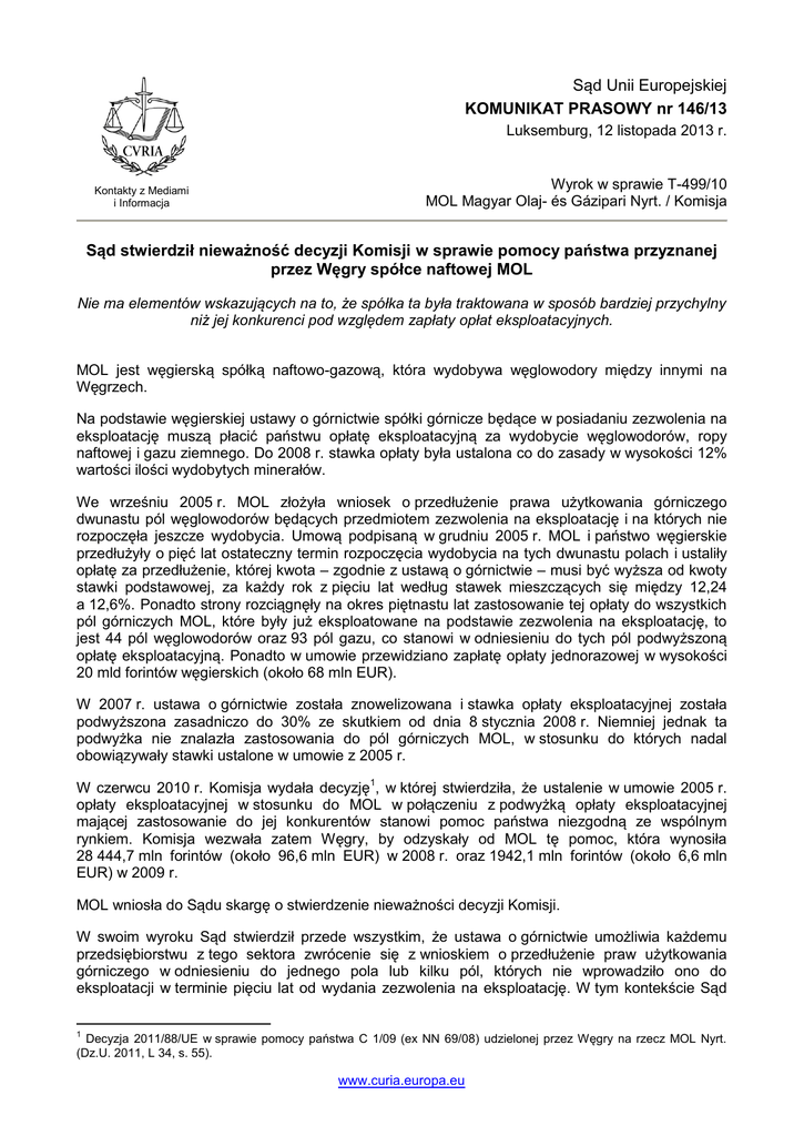 Sąd Unii Europejskiej KOMUNIKAT PRASOWY nr 146/13 Luksemburg, 12 listopada 2013 r. Kontakty z Mediami i Informacja Wyrok w sprawie T-499/10 MOL Magyar Olaj- és Gázipari Nyrt. / Komisja Sąd stwierdził nieważność decyzji Komisji w sprawie pomocy państwa przyznanej przez Węgry spółce naftowej MOL Nie ma elementów wskazujących na to, że spółka ta była traktowana w sposób bardziej przychylny niż jej konkurenci pod względem zapłaty opłat eksploatacyjnych. MOL jest węgierską spółką naftowo-gazową, która wydobywa węglowodory między innymi na Węgrzech. Na podstawie węgierskiej ustawy o górnictwie spółki górnicze będące w posiadaniu zezwolenia na eksploatację muszą płacić państwu opłatę eksploatacyjną za wydobycie węglowodorów, ropy naftowej i gazu ziemnego. Do 2008 r. stawka opłaty była ustalona co do zasady w wysokości 12% wartości ilości wydobytych minerałów. We wrześniu 2005 r. MOL złożyła wniosek o przedłużenie prawa użytkowania górniczego dwunastu pól węglowodorów będących przedmiotem zezwolenia na eksploatację i na których nie rozpoczęła jeszcze wydobycia. Umową podpisaną w grudniu 2005 r. MOL i państwo węgierskie przedłużyły o pięć lat ostateczny termin rozpoczęcia wydobycia na tych dwunastu polach i ustaliły opłatę za przedłużenie, której kwota – zgodnie z ustawą o górnictwie – musi być wyższa od kwoty stawki podstawowej, za każdy rok z pięciu lat według stawek mieszczących się między 12,24 a 12,6%. Ponadto strony rozciągnęły na okres piętnastu lat zastosowanie tej opłaty do wszystkich pól górniczych MOL, które były już eksploatowane na podstawie zezwolenia na eksploatację, to jest 44 pól węglowodorów oraz 93 pól gazu, co stanowi w odniesieniu do tych pól podwyższoną opłatę eksploatacyjną. Ponadto w umowie przewidziano zapłatę opłaty jednorazowej w wysokości 20 mld forintów węgierskich (około 68 mln EUR). W 2007 r. ustawa o górnictwie została znowelizowana i stawka opłaty eksploatacyjnej została podwyższona zasadniczo do 30% ze skutkiem od dnia 8 stycznia 2008 r. Niemniej jednak ta podwyżka nie znalazła zastosowania do pól górniczych MOL, w stosunku do których nadal obowiązywały stawki ustalone w umowie z 2005 r. W czerwcu 2010 r. Komisja wydała decyzję1, w której stwierdziła, że ustalenie w umowie 2005 r. opłaty eksploatacyjnej w stosunku do MOL w połączeniu z podwyżką opłaty eksploatacyjnej mającej zastosowanie do jej konkurentów stanowi pomoc państwa niezgodną ze wspólnym rynkiem. Komisja wezwała zatem Węgry, by odzyskały od MOL tę pomoc, która wynosiła 28 444,7 mln forintów (około 96,6 mln EUR) w 2008 r. oraz 1942,1 mln forintów (około 6,6 mln EUR) w 2009 r. MOL wniosła do Sądu skargę o stwierdzenie nieważności decyzji Komisji. W swoim wyroku Sąd stwierdził przede wszystkim, że ustawa o górnictwie umożliwia każdemu przedsiębiorstwu z tego sektora zwrócenie się z wnioskiem o przedłużenie praw użytkowania górniczego w odniesieniu do jednego pola lub kilku pól, których nie wprowadziło ono do eksploatacji w terminie pięciu lat od wydania zezwolenia na eksploatację. W tym kontekście Sąd 1 Decyzja 2011/88/UE w sprawie pomocy państwa C 1/09 (ex NN 69/08) udzielonej przez Węgry na rzecz MOL Nyrt. (Dz.U. 2011, L 34, s. 55). www.curia.europa.eu zaznaczył, iż okoliczność, że MOL była jedynym przedsiębiorstwem, które de facto zawarło umowę o przedłużeniu w sektorze węglowodorów, nie podważa tego wniosku. Okoliczność tę można bowiem wyjaśnić brakiem zainteresowania ze strony innych podmiotów gospodarczych, a zatem brakiem wniosku o przedłużenie, lub brakiem porozumienia stron co do stawek opłaty za przedłużenie. Jako że kryteria zawarcia umowy o przedłużeniu są obiektywne i mają zastosowanie do każdego potencjalnie zainteresowanego podmiotu gospodarczego, który je spełnia, zawarcie umowy z 2005 r. na podstawie tej ustawy nie faworyzowało MOL w porównaniu z jej konkurentami. Podobnie okoliczność, że władzom węgierskim przysługuje zakres uznania przy ustalaniu stawki opłaty za przedłużenie, nie oznacza, że niektóre przedsiębiorstwa mogą w związku z tym uzyskać przewagę konkurencyjną. Taki zakres uznania może być bowiem uzasadniony różnymi czynnikami takimi jak liczba pól górniczych, których dotyczy przedłużenie i ich szacunkowe znaczenie w stosunku do pól górniczych będących już w eksploatacji. Zakres uznania przyznany w ustawie o górnictwie umożliwia zatem administracji zachowanie równego traktowania między podmiotami gospodarczymi, w zależności od tego, czy znajdują się w porównywalnych lub różnych sytuacjach, dostosowując swoje propozycje co do opłat do cech charakterystycznych każdego przedstawionego wniosku o przedłużenie. A zatem nie jest nielogiczne, że stawka opłaty za przedłużenie i ewentualnie stawka podwyższonej opłaty eksploatacyjnej – które stosuje się odpowiednio do pól górniczych, w stosunku do których data rozpoczęcia wydobycia została przedłużona oraz do pól górniczych będących już w eksploatacji – są wyższe, w przypadku gdy liczba pól, których dotyczy przedłużenie, jest istotna w stosunku do liczby pól będących już w eksploatacji. Tak samo stawka może być niższa, gdy – tak jak w niniejszym przypadku – liczba pól górniczych, których dotyczy przedłużenie, stanowi niewielką część pól już eksploatowanych. W tym względzie Sąd jednak zauważył, że Komisja nie zbadała tego istotnego aspektu umowy z 2005 r. Sąd stwierdził również, że istnieją inne umowy o przedłużeniu zawarte na Węgrzech w sektorze minerałów stałych, które to umowy należało uwzględnić przy dokonywaniu oceny umowy z 2005 r. Komisja jednak nie uwzględniła tych umów. Ponadto Sąd zauważył, że podwyżka opłat na podstawie znowelizowanej ustawy o górnictwie miała miejsce