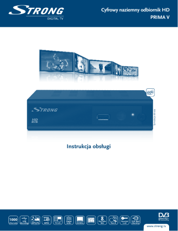 Symulacja obrazu Cyfrowy naziemny odbiornik HD PRIMA V Instrukcja obsługi Spis treści 23 Aug 2012 16:33 1.0 Wprowadzenie 1.1 Instrukcje bezpieczeństwa 1.2 Przechowywanie 1.3 Ustawienia sprzętu 1.4 Akcesoria 1.5 Zastosowanie zewnętrznych urządzeń USB 2.0 Państwa odbiornik 2.1 DOMYŚLNY KOD PIN: 0000 2.2 Panel przedni 2.3 Panel tylny 2.4 Pilot 3.0 Podłączenie 3.1 Podłączanie do anteny naziemnej 3.2 Podłączanie do TV przy pomocy kabla HDMI 3.3 Podłączanie do TV przy pomocy kabla SCART 3.4 Podłączanie do cyfrowego wzmacniacza audio przy pomocy S / PDIF 3.5 Podłączanie do cyfrowego wzmacniacza audio i TV przy pomocy HDMI 3.6 Podłączanie urządzenia pamięci masowej USB 4.0 Uruchomienie po raz pierwszy 5.0 Szybki przewodnik po użytkowaniu odbiornika 6.0 Działanie 6.1 Zmiana kanałów 6.2 Baner informacyjny 6.3 Wybór języka audio 6.4 Teletekst 6.5 Podtytuły 6.6 Time Shift (odtwarzanie przesunięte w czasie) 6.7 EPG (elektroniczny przewodnik po programach) 6.8 Instant Recording (natychmiastowe nagrywanie) 7.0 Menu Główne 7.1 Edytuj kanał 7.2 Instalacja 7.3 Ustawienia systemu 7.4 Narzędzia 7.5 Gry 7.6 Media+ 8.0 Usuwanie problemów 9.0 Specyfikacje Techniczne 2 2 2 3 3 3 4 4 4 4 4 5 5 5 5 5 6 6 6 7 7 7 8 8 8 9 9 9 9 10 10 12 13 16 17 18 20 21 STRONGoświadcza, że ten element spełnia podstawowe wymogi i inne odpowiednie przepisy dyrektyw 2004/108/EC i 73/23/EC, RoHS 2002/95/EC Z zastrzeżeniem zmian. W wyniku ciągłych czynności R&D, specyfikacje techniczne, projekt i wygląd produktów mogą ulec zmianie. Wszystkie nazwy produktów lub znaki towarowe lub zarejestrowane znaki towarowe są własnością ich odpowiednichwłaścicieli. © STRONG 2012. Wszelkie prawa zastrzeżone. 1 Polska PART 3 • Polska PART 3 • Polska 1.0 Wprowadzenie 1.1 Instrukcje bezpieczeństwa PROSZĘ NIE INSTALOWAĆ ODBIORNIKA: W zamkniętej lub słabo wentylowanej szafce; bezpośrednio na lub pod jakimkolwiek innym sprzętem; na powierzchni, która może blokować szczeliny wentylacyjne. PROSZĘ NIE NARAŻAĆ ODBIORNIKA LUB JEGO AKCESORIÓW: Na bezpośrednie nasłonecznienie lub inny sprzęt, który generuje ciepło; na deszcz lub intensywną wilgoć; intensywne wibracje oraz jakikolwiek wstrząs, który może spowodować permanentne uszkodzenie odbiornika lub na jakiekolwiek obiekty magnetyczne, takie jak głośniki, transformatory, itp. Proszę nie stosować uszkodzonego kabla zasilania. Może to spowodować pożar lub porażenie prądem. Proszę nie dotykać kabla zasilania mokrymi rękoma. Może to spowodować porażenie prądem. W przypadku, gdy odbiornik nie jest używany przez długi okres czasu, proszę odłączyć kabel zasilania od gniazdka. Do czyszczenia nie wolno stosować cieczy opartych na alkoholu lub amoniaku. Mogą Państwo czyścić odbiornik miękką, nie zawierającą surowej bawełny szmatką, lekko zwilżoną roztworem łagodnego mydła, tylko po odłączeniu od napięcia. Proszę upewnić się, że przez szczeliny wentylacyjne nie będą wpadać obce przedmioty, ponieważ może spowodować to pożar lub porażenie prądem. Nie wolno umieszczać jakichkolwiek obiektów na wierzchu odbiornika, ponieważ może to uniemożliwić właściwe schładzanie komponentów wewnątrz. Środki ostrożności Nigdy nie należy otwierać wieczka odbiornika. Taka czynność unieważnia gwarancję. Dotykanie wnętrza odbiornika jest niebezpieczne ze względu na prąd wysokiego napięcia i możliwie zagrożenia porażenia prądem. Proszę zlecić konserwacje lub serwisowanie wykwalifikowanemu personelowi. Podczas podłączania kabli, proszę upewnić się, że odbiornik jest odłączony od zasilania sieciowego. Proszę odczekać kilka sekund po wyłączeniu odbiornika przed jego przesunięciem lub odłączeniem jakiegokolwiek sprzętu. Proszę stosować wyłącznie zatwierdzone przedłużacze z kompatybilnymi przewodami, które są odpowiednie dla zużycia energii elektrycznej zainstalowanego sprzętu. Proszę upewnić się, że dostarczana energia elektryczna odpowiada napięciu na tabliczce znamionowej z tyłu odbiornika. Jeżeli odbiornik nie działa normalnie nawet w przypadku bezwzględnego przestrzegania zaleceń zawartych w tej instrukcji użytkownika, proszę skonsultować się z dealerem. 1.2 Przechowywanie Odbiornik i jego akcesoria są przechowywane i dostarczone w opakowaniach mających na celu ochronę przed porażeniami prądem elektrycznym i wilgocią. W trakcie rozpakowywania proszę upewnić się, że wszystkie części są uwzględnione oraz proszę chronić opakowanie przed dziećmi. 2 PART 3 • Polska W celu przetransportowania odbiornika z jednego miejsca na drugie lub w przypadku jego zwrotu na warunkach gwarancji, proszę upewnić się, że odbiornik został przepakowany do oryginalnego opakowania wraz z akcesoriami. Nieprzestrzeganie powyższych procedur dotyczących opakowania może unieważnić gwarancję. Zalecamy konsultacje z profesjonalnym instalatorem w celu ustawienia sprzętu. W przeciwnym razie, proszę stosować się do poniższych zaleceń: Proszę sprawdzić instrukcję obsługi TV i anteny. Należy upewnić się, że kabel HDMI i komponenty zewnętrzne są w odpowiednim stanie. W celu uzyskania maksymalnej wydajności proszę zastosować kabel HDMI 1.3 lub lepszy. Jeśli korzystają Państwo z łącza TV SCART, proszę zastosować dobrze osłonięty kabel SCART. Niniejsza instrukcja zapewnia kompletne wskazówki dotyczące zainstalowania i użytkowania tego odbiornika. Poniższe symbole są wykorzystywane następująco. OstrzeżenieWskazuje informację ostrzegawczą. PoradyWskazuje jakiekolwiek inne dodatkowe ważne lub pomocne informacje. MENU Reprezentuje przycisk na pilocie odbiornika. (Pogrubiony znak) Przejdź do Reprezentuje pozycję menu w ramach okna. (Znak kursywą) 1.4 Akcesoria 1. Instrukcja obsługi 2. 1 pilot 3. 2x Baterie (AAA ) Uwaga:Baterie nie powinny być doładowywane, demontowane, po zwarciu elektrycznym, mieszane lub stosow