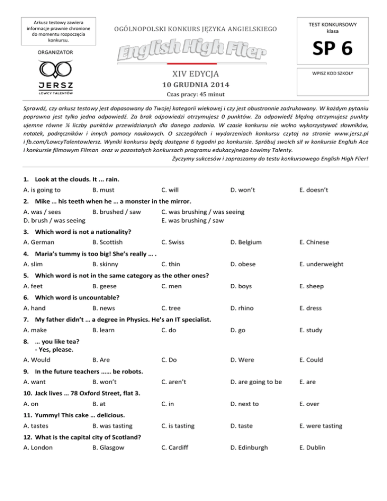 Arkusz testowy zawiera informacje prawnie chronione do momentu rozpoczęcia konkursu. OGÓLNOPOLSKI KONKURS JĘZYKA ANGIELSKIEGO TEST KONKURSOWY klasa SP 6 ORGANIZATOR XIV EDYCJA WPISZ KOD SZKOŁY 10 GRUDNIA 2014 Czas pracy: 45 minut Sprawdź, czy arkusz testowy jest dopasowany do Twojej kategorii wiekowej i czy jest obustronnie zadrukowany. W każdym pytaniu poprawna jest tylko jedna odpowiedź. Za brak odpowiedzi otrzymujesz 0 punktów. Za odpowiedź błędną otrzymujesz punkty ujemne równe ¼ liczby punktów przewidzianych dla danego zadania. W czasie konkursu nie wolno wykorzystywać słowników, notatek, podręczników i innych pomocy naukowych. O szczegółach i wydarzeniach konkursu czytaj na stronie www.jersz.pl i fb.com/LowcyTalentowJersz. Wyniki konkursu będą dostępne 6 tygodni po konkursie. Spróbuj swoich sił w konkursie English Ace i konkursie filmowym Filman oraz w pozostałych konkursach programu edukacyjnego Łowimy Talenty. Życzymy sukcesów i zapraszamy do testu konkursowego English High Flier! 1. Look at the clouds. It ... rain. A. is going to B. must C. will D. won’t E. doesn’t 2. Mike … his teeth when he … a monster in the mirror. A. was / sees B. brushed / saw D. brush / was seeing C. was brushing / was seeing E. was brushing / saw 3. Which word is not a nationality? A. German B. Scottish C. Swiss D. Belgium E. Chinese C. thin D. obese E. underweight C. men D. boys E. sheep C. tree D. rhino E. dress 4. Maria’s tummy is too big! She’s really … . A. slim B. skinny 5. Which word is not in the same category as the other ones? A. feet B. geese 6. Which word is uncountable? A. hand B. news 7. My father didn’t … a degree in Physics. He’s an IT specialist. A. make B. learn C. do D. go E. study B. Are C. Do D. Were E. Could C. aren’t D. are going to be E. are C. in D. next to E. over C. is tasting D. taste E. were tasting C. Cardiff D. Edinburgh E. Dublin 8. … you like tea? - Yes, please. A. Would 9. In the future teachers …… be robots. A. want B. won’t 10. Jack lives … 78 Oxford Street, flat 3. A. on B. at 11. Yummy! This cake … delicious. A. tastes B. was tasting 12. What is the capital city of Scotland? A. London B. Glasgow 13. If someone never tells a lie, he / she is … . A. strange B. honest C. mean D. lazy E. sociable D. can’t E. doesn’t have to D. has spent E. has gone D. much E. little C. will study D. has studied E. had studied C. is made D. was made E. are made C. took part D. took up E. put on C. the least bad D. less worse E. best C. When D. Whether E. Although C. get on well D. cheer up E. tidy up C. didn’t he D. wasn’t he E. doesn’t he 14. I saw dad’s car in front of the restaurant. He … be at work! A. has to B. must C. mustn’t 15. Is Ruby at home? No, I’m afraid she … to work. A. had been B. was C. has been 16. There were …. people in the supermarket on Monday. A. a little B. a few C. any 17. Mark would have certainly passed the test if he …. more. A. study B. studies 18. Bread … from wheat. A. makes B. made 19. She wants to be a comedian so she … some jokes. A. made up B. sat down 20. She’s … student in the class. A. worse B. worst 21. … we don’t leave soon, we’ll miss the bus. A. Unless B. If 22. Bullies often … people who they think are not strong. A. go on B. pick on 23. Ben collects seashells, … ? A. isn’t he B. can’t he 24. How long … that magazine? A. have you read D. do you read B. did you read C. had you been reading E. have you been reading 25. Let me give you … advice. A. any B. a C. an D. a piece of E. many D. road hog E. eager beaver 26. Mike is a/ an … . He spends a lot of time watching TV. A. couch potato B. party animal C. pet peeve 27. ... is an area with lots of mountains in North Wales, which is a national park and is a popular place for climbers and tourists. A. Lake District B. Snowdonia C. West Highlands D. East Highlands E. Brecon Beacons C. Loch Ness D. Windermere E. Lough Neagh C. Shetland Mainland D. Isle of Wight E. Rhode Island C. Vancouver E. Brighton 28. The largest lake in the UK is called … . A. Loch Morar B. Loch Lomond 29. Which island does not belong to the UK? A. Isle of Man B. Lewis and Harris 30. Which is not a British city? A. Manchester B. Leeds D. Leicester PATRONI I PARTNERZY © COPYRIGHT BY ŁOWCY TALENTÓW – JERSZ. WILCZYN 2013