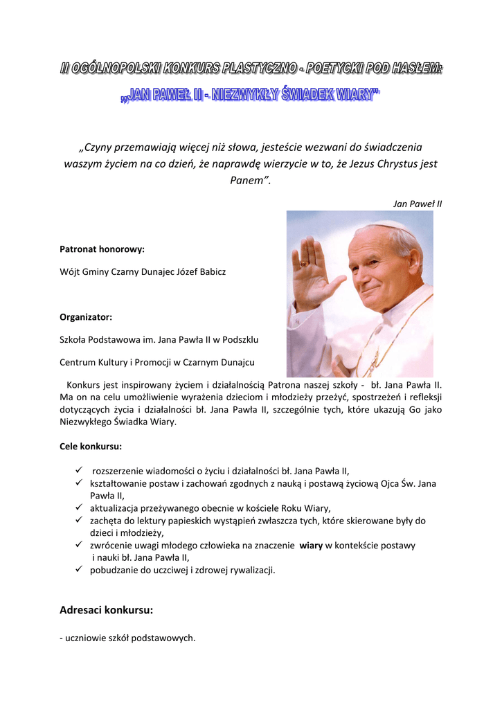 „Czyny przemawiają więcej niż słowa, jesteście wezwani do świadczenia waszym życiem na co dzień, że naprawdę wierzycie w to, że Jezus Chrystus jest Panem”. Jan Paweł II Patronat honorowy: Wójt Gminy Czarny Dunajec Józef Babicz Organizator: Szkoła Podstawowa im. Jana Pawła II w Podszklu Centrum Kultury i Promocji w Czarnym Dunajcu Konkurs jest inspirowany życiem i działalnością Patrona naszej szkoły - bł. Jana Pawła II. Ma on na celu umożliwienie wyrażenia dzieciom i młodzieży przeżyć, spostrzeżeń i refleksji dotyczących życia i działalności bł. Jana Pawła II, szczególnie tych, które ukazują Go jako Niezwykłego Świadka Wiary. Cele konkursu: rozszerzenie wiadomości o życiu i działalności bł. Jana Pawła II, kształtowanie postaw i zachowań zgodnych z nauką i postawą życiową Ojca Św. Jana Pawła II, aktualizacja przeżywanego obecnie w kościele Roku Wiary, zachęta do lektury papieskich wystąpień zwłaszcza tych, które skierowane były do dzieci i młodzieży, zwrócenie uwagi młodego człowieka na znaczenie wiary w kontekście postawy i nauki bł. Jana Pawła II, pobudzanie do uczciwej i zdrowej rywalizacji. Adresaci konkursu: - uczniowie szkół podstawowych. Zasady uczestnictwa: • KONKURS PLASTYCZNY 1. Uczestnicy konkursu wykonują pracę plastyczną zgodnie z hasłem: „Jan Paweł II – Niezwykły Świadek Wiary”. 2. Format prac: A4 lub A3. 3. Technika wykonania – dowolna: malarstwo, rysunek, techniki mieszane (oprócz prac przestrzennych). 4. Do każdej pracy powinny być dołączone: tytuł pracy, imię i nazwisko autora, adres, klasa, kategoria, dane szkoły, imię i nazwisko opiekuna pracy według metryczki stanowiącej załącznik nr 1 do niniejszego regulaminu. 5. Termin nadsyłania prac do 10.10.2013 r. na adres: Szkoła Podstawowa im. Jana Pawła II w Podszklu 34-472 Piekielnik Kryteria oceny: 1. Praca musi być wykonana tylko przez jednego autora, bez pomocy osób trzecich (prace zbiorowe nie będą brane pod uwagę). 2. Uczestnik konkursu składa tylko jedną pracę, szkoła w każdej kategorii maksymalnie może złożyć 3 prace. 3. Prac konkursowych nie należy podklejać ani oprawiać. 4. Prace zrolowane, zniszczone w wyniku niewłaściwego opakowania, nadesłane po terminie oraz niezgodne z regulaminem nie będą oceniane. 5. Prace zostaną ocenione w dwóch grupach wiekowych: I grupa: kl. I-III II grupa: kl. IV-VI 6. Powołana przez organizatora komisja weźmie pod uwagę: - zgodność z tematyką, - oryginalność, - staranność wykonania, - ogólny wyraz artystyczny prac. 7. Autorzy nagrodzonych i wyróżnionych prac otrzymają dyplomy oraz nagrody rzeczowe. 8. Prace konkursowe nie podlegają zwrotowi. • Nagrody: 1. Ogłoszenie wyników oraz wręczenie nagród odbędzie się 22 października 2013 r. w Szkole Podstawowej im. Jana Pawła II w Podszklu. • Uwagi organizacyjne: 1. Wyniki konkursu plastycznego i poetyckiego zostaną wysłane na podane w metryczkach skrzynki e-mailowe szkół. 2. Bliższych informacji na temat konkursów można zasięgać pod numerem telefonu szkoły: 18-285-70-07 lub 511-173-367. • KONKURS POETYCKI: 1. Na konkurs można nadsyłać prace tylko w formie wydruku komputerowego. 2. Jeden uczestnik może nadesłać maksymalnie dwa utwory , a szkoła 6 utworów. 3. Do konkursu dopuszczone będą wyłącznie utwory, które nie były wcześniej publikowane i w sposób oczywisty będą nawiązywać do hasła konkursu „Jan Paweł II – Niezwykły Świadek Wiary”. 4. Do każdej pracy powinny być dołączone: tytuł pracy, imię i nazwisko autora, adres, klasa, kategoria, dane szkoły, imię i nazwisko opiekuna pracy według metryczki stanowiącej załącznik nr 1 do niniejszego regulaminu. 5. Termin nadsyłania prac: do 10.10.2013 r. na adres: Szkoła Podstawowa im. Jana Pawła I w Podszklu 34-472 Piekielnik • Kryteria oceny: 1. Prace zostaną ocenione w jednej grupie wiekowej: kl. IV-VI 2. Powołana przez organizatora komisja weźmie pod uwagę: - zgodność z tematyką, - oryginalność wypowiedzi, - poprawność językową, ortograficzną, - ogólny wyraz artystyczny tekstu. 3. Autorzy nagrodzonych i wyróżnionych prac otrzymają dyplomy oraz nagrody rzeczowe. 4. Prace konkursowe nie podlegają zwrotowi. • Nagrody: 1. Ogłoszenie wyników oraz wręczenie nagród odbędzie się 22 października 2013 r. w Szkole Podstawowej im. Jana Pawła II w Podszklu. • Uwagi organizacyjne: 1. Wyniki konkursu plastycznego i poetyckiego zostaną wysłane na podane w metryczkach skrzynki e-mailowe szkół. 2. Bliższych informacji na temat konkursów można zasięgać pod numerem telefonu szkoły: 18-285-70-07 lub 511-173-367. Załącznik nr 1 METRYCZKA PRACY (prosimy wypełniać czytelnie) Tytuł pracy: Imię i nazwisko autora pracy: Klasa, kategoria: Dokładny adres szkoły: (m. p. szkoły) Telefon, fax, e-mail szkoły: Imię i nazwisko opiekuna pracy: ……………………………………………………………….. (podpis opiekuna pracy) Wyrażam zgodę na: • Umieszczenie i przetwarzanie moich danych osobowych w bazie danych adresowej organizatora, we wszelkich działaniach związanych z II Ogólnopolskim Konkursem Plastyczno – Poetyckim pod hasłem: „Jan Paweł II – Niezwykły Świadek Wiary” • Wykorzystanie przez organizatora moich prac do celów edukacyjnych oraz ich publikacji we fragmentach lub w całości z zachowaniem praw autorskich. …………………………………………………….