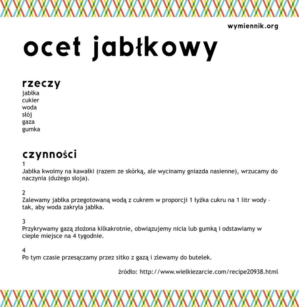 ocet jabłkowy wymiennik.org rzeczy jabłka cukier woda słój gaza gumka czynności 1 Jabłka kwoimy na kawałki (razem ze skórką, ale wycinamy gniazda nasienne), wrzucamy do naczynia (dużego słoja). 2 Zalewamy jabłka przegotowaną wodą z cukrem w proporcji 1 łyżka cukru na 1 litr wody – tak, aby woda zakryła jabłka. 3 Przykrywamy gazą złożona kilkakrotnie, obwiązujemy nicia lub gumką i odstawiamy w ciepłe miejsce na 4 tygodnie. 4 Po tym czasie przesączamy przez sitko z gazą i zlewamy do butelek. źródło: http://www.wielkiezarcie.com/recipe20938.html