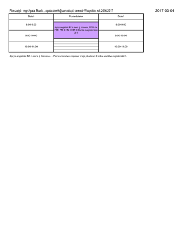 Plan zajęć - mgr Agata Słowik, , , semestr
