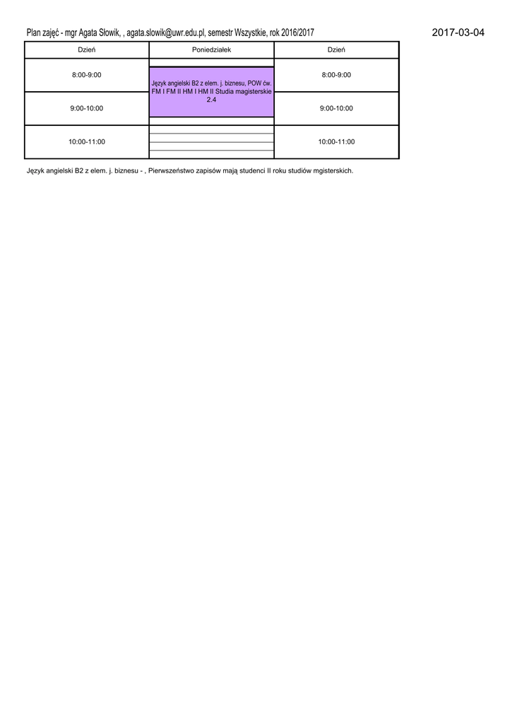 Plan zajęć - mgr Agata Słowik, , [email protected], semestr Wszystkie, rok 2016/2017 Dzień Poniedziałek 8:00-9:00 2017-03-04 Dzień 8:00-9:00 Język angielski B2 z elem. j. biznesu, POW ćw. FM I FM II HM I HM II Studia magisterskie 2.4 9:00-10:00 9:00-10:00 10:00-11:00 10:00-11:00 Język angielski B2 z elem. j. biznesu - , Pierwszeństwo zapisów mają studenci II roku studiów mgisterskich.