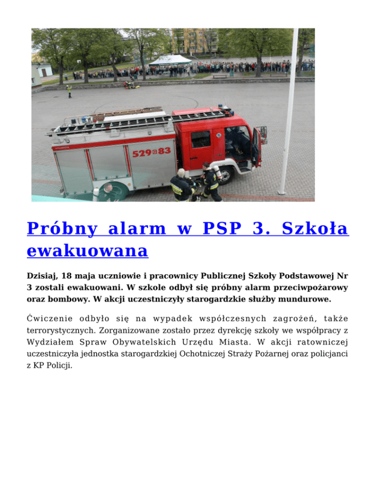 Próbny alarm w PSP 3. Szkoła ewakuowana Dzisiaj, 18 maja uczniowie i pracownicy Publicznej Szkoły Podstawowej Nr 3 zostali ewakuowani. W szkole odbył się próbny alarm przeciwpożarowy oraz bombowy. W akcji uczestniczyły starogardzkie służby mundurowe. Ćwiczenie odbyło się na wypadek współczesnych zagrożeń, także terrorystycznych. Zorganizowane zostało przez dyrekcję szkoły we współpracy z Wydziałem Spraw Obywatelskich Urzędu Miasta. W akcji ratowniczej uczestniczyła jednostka starogardzkiej Ochotniczej Straży Pożarnej oraz policjanci z KP Policji. Podczas symulacji uczniowie i pracownicy zostali ewakuowani na plac za szkołą. Oficerowie KP Państwowej Straży Pożarnej, którzy obserwowali przebieg ćwiczenia potwierdzili, że cała akcja przeprowadzona została na bardzo wysokim poziomie, niezwykle sprawnie i profesjonalnie. Wydział Spraw Obywatelskich dziękuje dyrektorowi PSP Nr 3 – Piotrowi Ribickiemu, za ogromne zaangażowanie w organizację ćwiczenia i gratuluje wzorowego przygotowania szkoły w zakresie bezpieczeństwa. Wydział podziękowania kieruje także w stronę wszystkich służb mundurowych, które uczestniczyły w akcji.