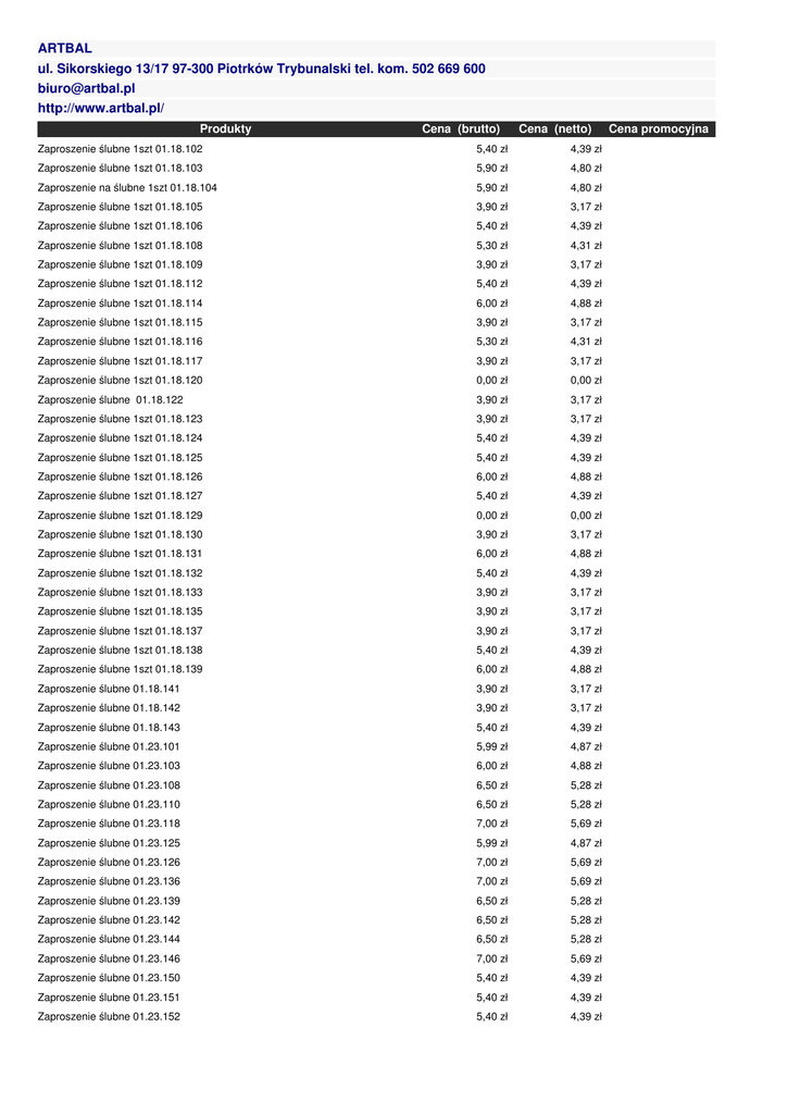 ARTBAL ul. Sikorskiego 13/17 97-300 Piotrków Trybunalski tel. kom. 502 669 600 [email protected] http://www.artbal.pl/ Produkty Cena (brutto) Cena (netto) Zaproszenie ślubne 1szt 01.18.102 5,40 zł 4,39 zł Zaproszenie ślubne 1szt 01.18.103 5,90 zł 4,80 zł Zaproszenie na ślubne 1szt 01.18.104 5,90 zł 4,80 zł Zaproszenie ślubne 1szt 01.18.105 3,90 zł 3,17 zł Zaproszenie ślubne 1szt 01.18.106 5,40 zł 4,39 zł Zaproszenie ślubne 1szt 01.18.108 5,30 zł 4,31 zł Zaproszenie ślubne 1szt 01.18.109 3,90 zł 3,17 zł Zaproszenie ślubne 1szt 01.18.112 5,40 zł 4,39 zł Zaproszenie ślubne 1szt 01.18.114 6,00 zł 4,88 zł Zaproszenie ślubne 1szt 01.18.115 3,90 zł 3,17 zł Zaproszenie ślubne 1szt 01.18.116 5,30 zł 4,31 zł Zaproszenie ślubne 1szt 01.18.117 3,90 zł 3,17 zł Zaproszenie ślubne 1szt 01.18.120 0,00 zł 0,00 zł Zaproszenie ślubne 01.18.122 3,90 zł 3,17 zł Zaproszenie ślubne 1szt 01.18.123 3,90 zł 3,17 zł Zaproszenie ślubne 1szt 01.18.124 5,40 zł 4,39 zł Zaproszenie ślubne 1szt 01.18.125 5,40 zł 4,39 zł Zaproszenie ślubne 1szt 01.18.126 6,00 zł 4,88 zł Zaproszenie ślubne 1szt 01.18.127 5,40 zł 4,39 zł Zaproszenie ślubne 1szt 01.18.129 0,00 zł 0,00 zł Zaproszenie ślubne 1szt 01.18.130 3,90 zł 3,17 zł Zaproszenie ślubne 1szt 01.18.131 6,00 zł 4,88 zł Zaproszenie ślubne 1szt 01.18.132 5,40 zł 4,39 zł Zaproszenie ślubne 1szt 01.18.133 3,90 zł 3,17 zł Zaproszenie ślubne 1szt 01.18.135 3,90 zł 3,17 zł Zaproszenie ślubne 1szt 01.18.137 3,90 zł 3,17 zł Zaproszenie ślubne 1szt 01.18.138 5,40 zł 4,39 zł Zaproszenie ślubne 1szt 01.18.139 6,00 zł 4,88 zł Zaproszenie ślubne 01.18.141 3,90 zł 3,17 zł Zaproszenie ślubne 01.18.142 3,90 zł 3,17 zł Zaproszenie ślubne 01.18.143 5,40 zł 4,39 zł Zaproszenie ślubne 01.23.101 5,99 zł 4,87 zł Zaproszenie ślubne 01.23.103 6,00 zł 4,88 zł Zaproszenie ślubne 01.23.108 6,50 zł 5,28 zł Zaproszenie ślubne 01.23.110 6,50 zł 5,28 zł Zaproszenie ślubne 01.23.118 7,00 zł 5,69 zł Zaproszenie ślubne 01.23.125 5,99 zł 4,87 zł Zaproszenie ślubne 01.23.126 7,00 zł 5,69 zł Zaproszenie ślubne 01.23.136 7,00 zł 5,69 zł Zaproszenie ślubne 01.23.139 6,50 zł 5,28 zł Zaproszenie ślubne 01.23.142 6,50 zł 5,28 zł Zaproszenie ślubne 01.23.144 6,50 zł 5,28 zł Zaproszenie ślubne 01.23.146 7,00 zł 5,69 zł Zaproszenie ślubne 01.23.150 5,40 zł 4,39 zł Zaproszenie ślubne 01.23.151 5,40 zł 4,39 zł Zaproszenie ślubne 01.23.152 5,40 zł 4,39 zł Cena promocyjna Zaproszenie ślubne 01.23.153 5,40 zł 4,39 zł Zaproszenie ślubne 01.23.154 6,00 zł 4,88 zł Zaproszenie ślubne 01.23.155 6,00 zł 4,88 zł Zaproszenie ślubne 01.23.156 6,50 zł 5,28 zł Zaproszenie ślubne 01.23.157 6,00 zł 4,88 zł Zaproszenie ślubne 01.23.158 6,50 zł 5,28 zł Zaproszenie ślubne 01.23.160 6,99 zł 5,68 zł Zaproszenie ślubne 01.23.161 7,00 zł 5,69 zł Zaproszenie ślubne 01.23.163 6,99 zł 5,68 zł Zaproszenie ślubne 01.24.102 5,99 zł 4,87 zł Zaproszenie ślubne 01.24.104 6,49 zł 5,28 zł Zaproszenie ślubne 01.24.105 6,49 zł 5,28 zł Zaproszenie ślubne 01.24.112 6,49 zł 5,28 zł Zaproszenie ślubne 01.24.115 7,79 zł 6,33 zł Zaproszenie ślubne 01.24.120 5,99 zł 4,87 zł Zaproszenie ślubne 01.24.121 6,99 zł 5,68 zł Zaproszenie ślubne 1szt 01.24.122 7,00 zł 5,69 zł Zaproszenie ślubne 1szt 01.24.124 6,00 zł 4,88 zł Zaproszenie ślubne 1szt 01.24.131 6,00 zł 4,88 zł Zaproszenie ślubne 1szt 01.24.142 6,00 zł 4,88 zł Zaproszenie ślubne 1szt 01.24.149 6,50 zł 5,28 zł Zaproszenie ślubne 1szt 01.24.156 6,50 zł 5,28 zł Zaproszenie ślubne 1szt 01.24.160 6,00 zł 4,88 zł Zaproszenie ślubne 1szt 01.24.161 7,40 zł 6,02 zł Zaproszenie ślubne 1szt 01.24.162 5,40 zł 4,39 zł Zaproszenie ślubne 1szt 01.24.164 7,00 zł 5,69 zł Zaproszenie ślubne 1szt 01.24.165 6,00 zł 4,88 zł Zaproszenie ślubne 1szt 01.24.166 6,00 zł 4,88 zł Zaproszenie ślubne 1szt 01.24.167 7,00 zł 5,69 zł Zaproszenie ślubne 1szt 01.24.169 6,00 zł 4,88 zł Zaproszenie ślubne 1szt 01.26.203B 5,90 zł 4,80 zł Zaproszenie ślubne 1szt 01.26.204D 3,20 zł 2,60 zł Zaproszenie ślubne 1szt 01.26.205D 3,90 zł 3,17 zł Zaproszenie ślubne 1szt 01.26.206B 5,30 zł 4,31 zł Zaproszenie ślubne 1szt 01.26.207B 5,30 zł 4,31 zł Zaproszenie ślubne 1szt 01.26.208B 4,40 zł 3,58 zł Zaproszenie ślubne 1szt 01.26.209B 5,30 zł 4,31 zł Zaproszenie ślubne 1szt 01.26.210B 5,30 zł 4,31 zł Zaproszenie ślubne 1szt 01.26.211B 5,90 zł 4,80 zł Zaproszenie ślubne 1szt 01.26.212B 5,30 zł 4,31 zł Zaproszenie ślubne 1szt 01.26.213D 3,20 zł 2,60 zł Zaproszenie ślubne 1szt 01.18.108 5,30 zł 4,31 zł Zaproszenie ślubne 1szt 01.18.109 3,90 zł 3,17 zł Zaproszenie ślubne 1szt 01.18.112 5,40 zł 4,39 zł Zaproszenie ślubne 1szt 01.18.114 6,00 zł 4,88 zł Zaproszenie ślubne 1szt 01.18.115 3,90 zł 3,17 zł Zaproszenie ślubne 1szt 01.18.116 5,30 zł 4,31 zł Zaproszenie ślubne 1szt 01.18.117 3,90 zł 3,17 zł Zaproszenie ślubne 1szt 01.18.120 5,40 zł 4,39 zł Zaproszenie ślubne 1szt 01.18.125 5,40 zł 4,39 zł Zaproszenie ślubne 1szt 01.18.126 6,00 zł 4,88 zł Zaproszenie ślubne 1szt 01.18.132 5,40 zł 4,39 zł Zaproszenie ślubne 1szt 01.18.133 3,90 zł 3,17 zł Zaproszenie ślubne 1szt 01.18.139 6,00 zł 4,88 zł Zaproszenie ślubne 1szt 01.18.141 3,90 zł 3,17 zł Zaproszenie ślubne 1szt 01.18.142 3,90 zł 3,17 zł Zaproszenie ślubne 1szt 01.18.143 5,40 zł 4,39 zł Zaproszenie ślubne 1szt 1231 3,50 zł 2,85 zł Zaproszenie ślubne 1szt 1278 4,30 zł 3,50 zł Zaproszenie ślubne 1szt G702 4,65 zł 3,78 zł Zaproszenie ślubne 1szt G703 4,30 zł 3,50 zł Zaproszenie ślubne 1szt G704 4,30 zł 3,50 zł Zaproszenie ślubne 1szt G705 4,30 zł 3,50 zł Zaproszenie ślubne 1szt G708 4,30 zł 3,50 zł Zaproszenie ślubne 1szt G709 4,65 zł 3,78 zł Zaproszenie ślubne 1szt G711 4,65 zł 3,78 zł Zaproszenie ślubne 1szt G712 4,65 zł 3,78 zł Zaproszenie ślubne 1szt G713 4,65 zł 3,78 zł Za