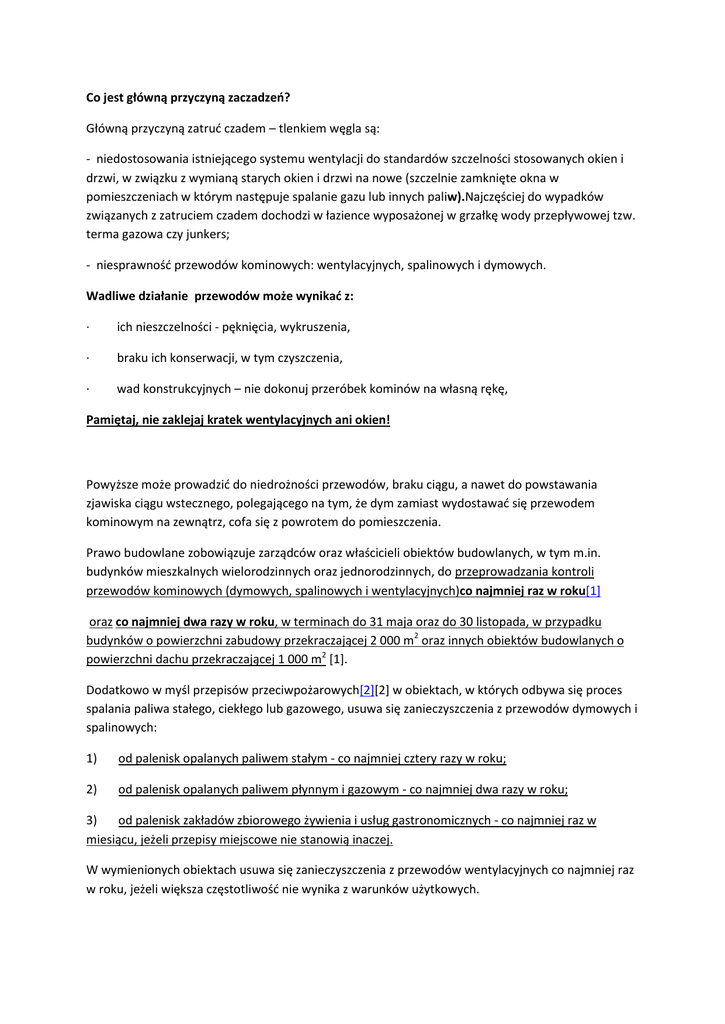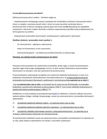 Co jest główną przyczyną zaczadzeń? Główną przyczyną zatruć czadem – tlenkiem węgla są: - niedostosowania istniejącego systemu wentylacji do standardów szczelności stosowanych okien i drzwi, w związku z wymianą starych okien i drzwi na nowe (szczelnie zamknięte okna w pomieszczeniach w którym następuje spalanie gazu lub innych paliw).Najczęściej do wypadków związanych z zatruciem czadem dochodzi w łazience wyposażonej w grzałkę wody przepływowej tzw. terma gazowa czy junkers; - niesprawność przewodów kominowych: wentylacyjnych, spalinowych i dymowych. Wadliwe działanie przewodów może wynikać z: · ich nieszczelności - pęknięcia, wykruszenia, · braku ich konserwacji, w tym czyszczenia, · wad konstrukcyjnych – nie dokonuj przeróbek kominów na własną rękę, Pamiętaj, nie zaklejaj kratek wentylacyjnych ani okien! Powyższe może prowadzić do niedrożności przewodów, braku ciągu, a nawet do powstawania zjawiska ciągu wstecznego, polegającego na tym, że dym zamiast wydostawać się przewodem kominowym na zewnątrz, cofa się z powrotem do pomieszczenia. Prawo budowlane zobowiązuje zarządców oraz właścicieli obiektów budowlanych, w tym m.in. budynków mieszkalnych wielorodzinnych oraz jednorodzinnych, do przeprowadzania kontroli przewodów kominowych (dymowych, spalinowych i wentylacyjnych)co najmniej raz w roku[1] oraz co najmniej dwa razy w roku, w terminach do 31 maja oraz do 30 listopada, w przypadku budynków o powierzchni zabudowy przekraczającej 2 000 m2 oraz innych obiektów budowlanych o powierzchni dachu przekraczającej 1 000 m2 [1]. Dodatkowo w myśl przepisów przeciwpożarowych[2][2] w obiektach, w których odbywa się proces spalania paliwa stałego, ciekłego lub gazowego, usuwa się zanieczyszczenia z przewodów dymowych i spalinowych: 1) od palenisk opalanych paliwem stałym - co najmniej cztery razy w roku; 2) od palenisk opalanych paliwem płynnym i gazowym - co najmniej dwa razy w roku; 3) od palenisk zakładów zbiorowego żywienia i usług gastronomicznych - co najmniej raz w miesiącu, jeżeli przepisy miejscowe nie stanowią inaczej. W wymienionych obiektach usuwa się zanieczyszczenia z przewodów wentylacyjnych co najmniej raz w roku, jeżeli większa częstotliwość nie wynika z warunków użytkowych. Państwowa Straż Pożarna prowadzi systematyczne czynności kontrolne w zakresie prawidłowości eksploatacji instalacji użytkowych, w tym również czyszczenia przewodów kominowych. Na przykład w roku 2008, w 9154 obiektach zaliczonych do kategorii zagrożenia ludzi, w tym w 1382 budynkach mieszkalnych wielorodzinnych, stwierdzono przypadki niewłaściwego użytkowania instalacji użytkowych, w tym braku czyszczenia przewodów kominowych. Pozytywne efekty przynoszą wspólne przedsięwzięcia podejmowane ze środowiskiem kominiarskim w zakresie działań edukacyjno-informacyjnych. Skąd się bierze czad i dlaczego jest tak niebezpieczny? Tlenek węgla powstaje podczas procesu niepełnego spalania materiałów palnych, w tym paliw, które występuje przy niedostatku tlenu w otaczającej atmosferze. Może to wynikać z braku dopływu zewnętrznego powietrz do urządzenia, w którym następuje spalanie gazu (lub innych paliw). Jest to szczególnie groźne w mieszkaniach w których okna są szczelne lub uszczelnione na zimę. Niebezpieczeństwo zaczadzenia wynika z faktu, że tlenek węgla: - jest gazem niewyczuwalnym zmysłami człowieka (bezwonny, bezbarwny i pozbawiony smaku), blokuje dostęp tlenu do organizmu, poprzez zajmowanie jego miejsca w czerwonych ciałkach krwi, powodując przy długotrwałym narażeniu (w większych dawkach) śmierć przez uduszenie. Co zrobić, aby uniknąć zaczadzenia? W celu uniknięcia zaczadzenia należy: nie bagatelizować objawów duszności, bólów i zawrotów głowy, nudności, wymiotów, oszołomienia, osłabienia, przyspieszenia czynności serca i oddychania, gdyż mogą być sygnałem, że ulegamy zatruciu czadem; w takiej sytuacji należy natychmiast przewietrzyć pomieszczenie, w którym się znajdujemy i zasięgnąć porady lekarskiej, przeprowadzać kontrole techniczne, w tym sprawdzanie szczelności przewodów kominowych, ich systematyczne czyszczenie oraz sprawdzanie występowania dostatecznego ciągu powietrza, użytkować sprawne techniczne urządzenia, w których odbywa się proces spalania, zgodnie z instrukcją producenta, stosować urządzenia posiadające stosowne dopuszczenia w zakresie wprowadzenia do obrotu; w sytuacjach wątpliwych należy żądać okazania wystawionej przez producenta lub importera urządzenia tzw. deklaracji zgodności, tj. dokumentu zawierającego informacje o specyfikacji technicznej oraz przeznaczeniu i zakresie stosowania danego urządzenia, w przypadku wymiany okien na nowe, sprawdzić poprawność działania wentylacji, ponieważ nowe okna są najczęściej o wiele bardziej szczelne w stosunku do wcześniej stosowanych w budynku i mogą pogarszać wentylację, systematycznie sprawdzać ciąg powietrza, np. poprzez przykładanie kartki papieru do otworu bądź kratki wentylacyjnej; jeśli nic nie zakłóca wentylacji, kartka powinna przywrzeć do wyżej wspomnianego otworu lub kratki, często wietrzyć pomieszczenie, w których odbywa się proces spalania (kuchnie, łazienki wyposażone w termy gazowe), a najlepiej zapewnić, nawet niewielkie, rozszczelnienie okien. W trosce o własne bezpieczeństwo, warto rozważyć zamontowanie w domu czujek dymu i gazu. Koszt zamontowania takich czujek jest niewspółmiernie niski do korzyści, jakie daje zastosowanie tego typu urządzeń (łącznie z uratowaniem najwyższej wartości, jaką jest nasze życie). Jak pomóc przy zatruciu tlenkiem węgla? W przypadku zatrucia tlenkiem węgla należy: zapewnić dopływ świeżego czystego powietrza; w skrajnych przypadkach wybijając szyby w oknie, wynieść osobę poszkodowaną w bezpieczne miejsce, jeśli nie stanowi to zagrożenia dl