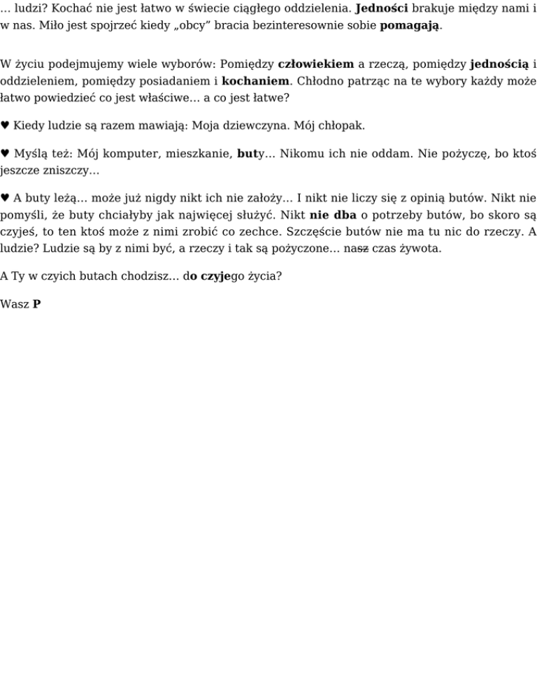 … ludzi? Kochać nie jest łatwo w świecie ciągłego oddzielenia. Jedności brakuje między nami i w nas. Miło jest spojrzeć kiedy „obcy” bracia bezinteresownie sobie pomagają. W życiu podejmujemy wiele wyborów: Pomiędzy człowiekiem a rzeczą, pomiędzy jednością i oddzieleniem, pomiędzy posiadaniem i kochaniem. Chłodno patrząc na te wybory każdy może łatwo powiedzieć co jest właściwe… a co jest łatwe? ♥ Kiedy ludzie są razem mawiają: Moja dziewczyna. Mój chłopak. ♥ Myślą też: Mój komputer, mieszkanie, buty… Nikomu ich nie oddam. Nie pożyczę, bo ktoś jeszcze zniszczy… ♥ A buty leżą… może już nigdy nikt ich nie założy… I nikt nie liczy się z opinią butów. Nikt nie pomyśli, że buty chciałyby jak najwięcej służyć. Nikt nie dba o potrzeby butów, bo skoro są czyjeś, to ten ktoś może z nimi zrobić co zechce. Szczęście butów nie ma tu nic do rzeczy. A ludzie? Ludzie są by z nimi być, a rzeczy i tak są pożyczone… nasz czas żywota. A Ty w czyich butach chodzisz… do czyjego życia? Wasz P