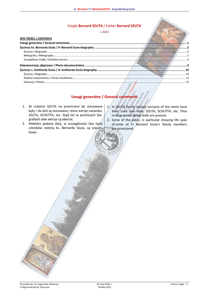 ks. Bernard / Fr Bernard SZUTA - biografia/biography Ksiądz Bernard SZUTA / Father Bernard SZUTA V.2015 SPIS TREŚCI / CONTENTS Uwagi generalne / General comments ........................................................................................................................................... 1 Życiorys ks. Bernarda Szuty / Fr Bernard Szuta biography .............................................................................................................. 2 Życiorys / Biography ................................................................................................................................................................................................... 2 Bibliografia / Bibliography .......................................................................................................................................................................................... 2 Szczegółowe źródła / Detailed sources ....................................................................................................................................................................... 3 Dokumentacja zdjęciowa / Photo documentation ......................................................................................................................... 4 Życiorys s. Gotthardy Szuta / Sr Gottharda Szuta biography ......................................................................................................... 10 Życiorys / Biography ................................................................................................................................................................................................. 10 Rodzine wspomnienie / Family recollection ............................................................................................................................................................. 12 Ilustracje / Photos .................................................................................................................................................................................................... 13 Uwagi generalne / General comments 1. 2. W rodzinie SZUTA na przestrzeni lat stosowane były, i do dziś są stosowane, różne wersje nazwiska: SZUTA, SCHUTTA, etc. Stąd też w poniższych biografiach obie wersje są obecne. Niektóre podane daty, w szczególności lata życia członków rodziny ks. Bernarda Szuta, są szacunkowe. © parafia pw. św. Zygmunta, Słomczyn st Sigismund parish, Słomczyn 1. In SZUTA family various versions of the name have been used over time: SZUTA, SCHUTTA, etc. Thus in biographies below both are present. 2. Some of the dates, in particular showing life span of some of Fr Bernard Szuta’s family members are provisional. 20 maja 2015 r. 20 May 2015 strona / page - 1 – ks. Bernard / Fr Bernard SZUTA - biografia/biography Życiorys ks. Bernarda Szuty / Fr Bernard Szuta biography Opr. ks. prof. dr Anastazy Nadolny, Pelplin Author. Fr prof. dr Anastasius Nadolny, Pelplin [email protected] http://pl.wikipedia.org/wiki/Anastazy_Nadolny [email protected] http://pl.wikipedia.org/wiki/Anastazy_Nadolny (dzięki uprzejmości p. Stanisława Kruszyńskiego) (thanks to Mr. Stanisław Kruszyński kindness) Życiorys / Biography Urodził się 29.X.1900 r. w Kamienicy pow. Kartuzy (parafia Sierakowice) w rodzinie rolnika Jana i Wincentyny z d. v. Gęsk. Maturę zdał w 1919 r., prawdopodobnie w Wejherowie. Teologię studiował w Wyższym Seminarium Duchownym w Pelplinie, gdzie 17.VI.1923 r. przyjął święcenia kapłańskie. Mszę św. prymicyjną odprawił w kościele św. Józefa w Tczewie. Jako wikariusz pracował w parafiach: Lubawa (1923), Brodnica (1923-1930) i Kartuzy (19301931). W X.1931 r. został mianowany kuratusem w Górnej Brodnicy. Tu wybudował kościół, poświęcony 5.XI.1933 r. Ks. Bernard Szuta był sekretarzem Związku Kapłanów „Unitas” diecezji chełmińskiej. Po najeździe niemieckim w IX.1939 r. i rozpoczęciu okupacji podkreślał swoją polskość. Wśród miejscowych Niemców miał wielu wrogów, ponieważ w czasie jego duszpasterzowania w Górnej Brodnicy kilku Niemców wyznania ewangelickiego przeszło na katolicyzm. 21.XI.1939 przyjechali SS-mani autem po ks. Szutę. Nie zastali go w domu, więc rozkazali, aby następnego dnia stawił się w Kartuzach. Udał się tam i został aresztowany. 23.XI.1939 wieczorem został wraz z innymi księżmi wywieziony ciężarowym autem w stronę Skarszew i ślad po nim zginął. Według ks. Jana Walkusza grupę księży z Kartuz (wśród nich ks. Szutę) wywieziono 25.XI.1939 r. do lasów kaliskich i tam niemiecki policyjny batalion rezerwowy 101, oddział „101a”, podlegający zbrodniczej organizacji SS, dokonał zbiorowego mordu. Born on 29.X.1900 in Kamienica in Kartuzy county (Sierakowice parish) in farmers’ John and Vicentina nee Gęsk family. „Matura” — secondary school certificate — passed in 1919, prob. in Wejherowo. Studied theology at Theological Seminary in Pelplin and on 17.VI.1923 was ordained. His first Holy Mass celebrated in st Joseph church in Tczew. As a vicar ministered in: Lubawa (1923), Brodnica (1923-1930) and Kartuzy (1930-1931). In X.1931 was nominated a rector of Górna Brodnica church. There constructed a church and consecrated it on 5.XI.1933 Fr Bernard Szuta was a secretary to „Unitas” Priests’ Union in Chełmno diocese. After German attack in IX.1939 and start occupation openly emphasised his Polish nationality. Among local Germans had many enemies for during his ministry in Górna Brodnica few Germans converted from evangelical religion to Catholicism. On 21.XI.1939 SS members arrived by car to fetch Fr Szuta. Did not find him home so requested his arrival in Kartuzy next day. He complied and on arrival there was arrested. On the evening of 23.XI.1939 together with a group of priests was driven out on a truck towards Skarszewy and nothing was heard from him again. According to Fr Jo